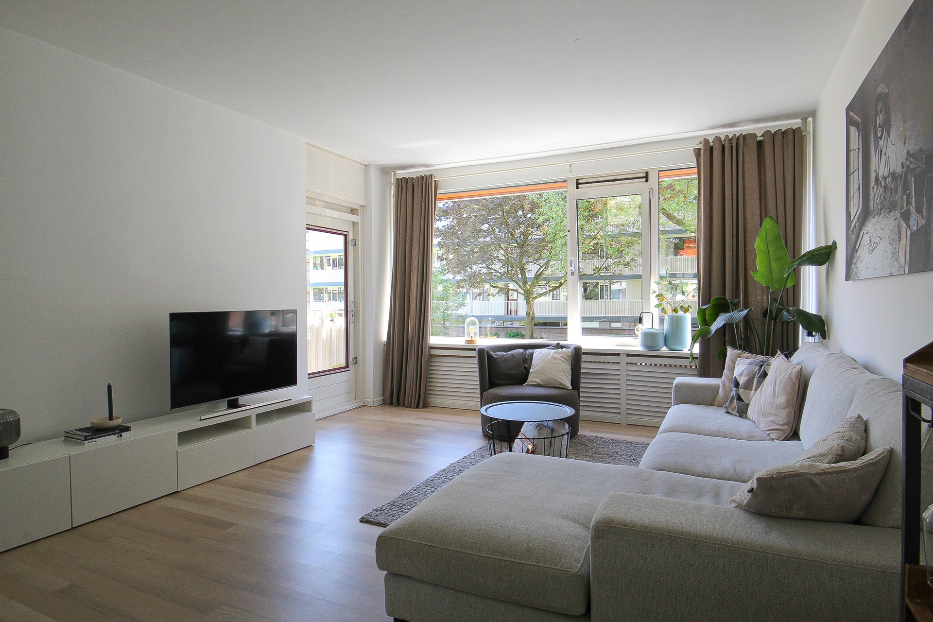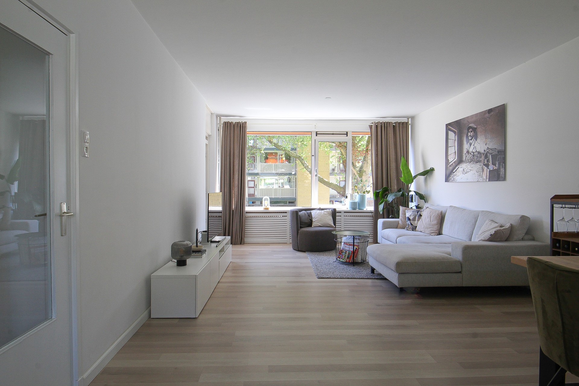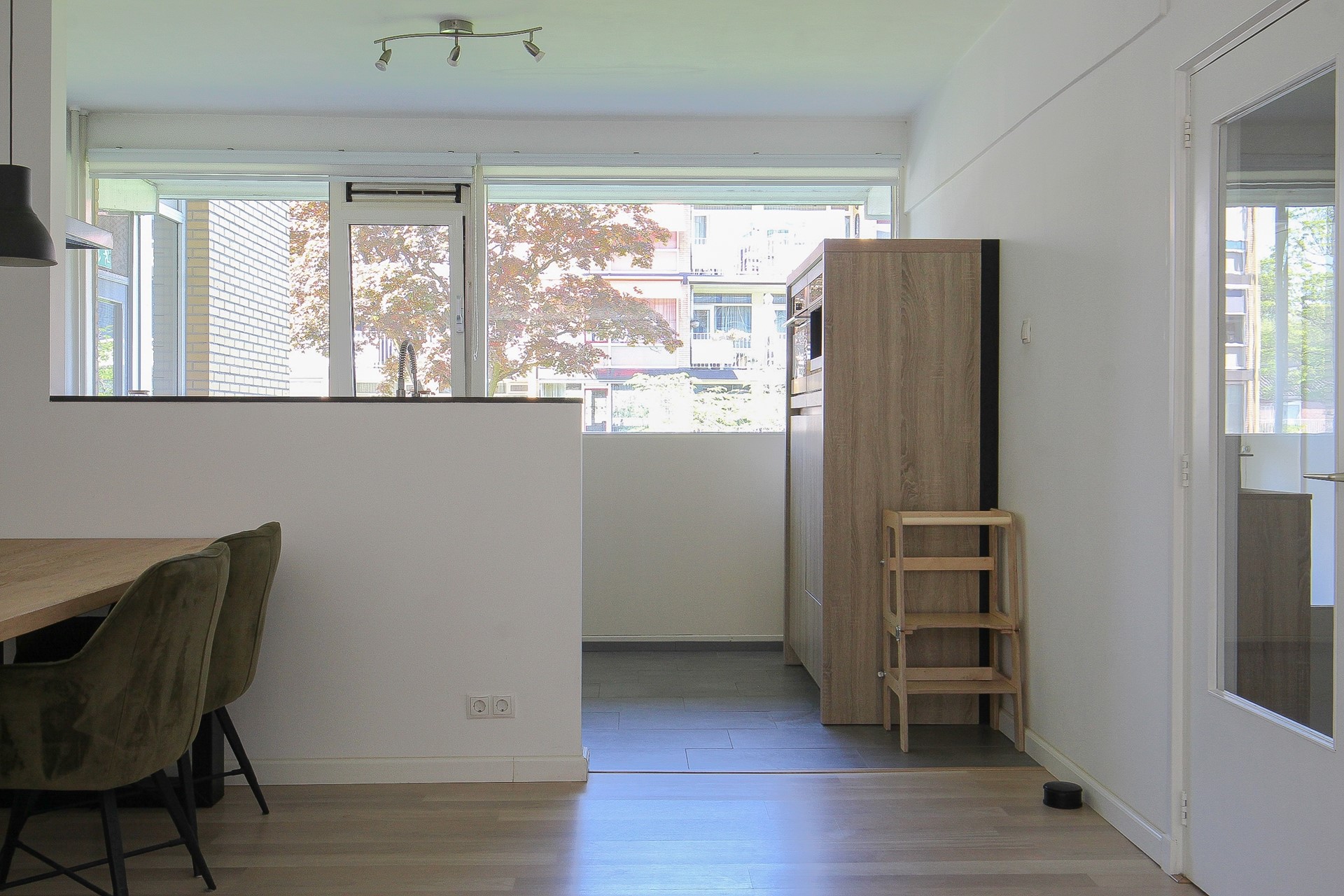 De ruime, lichte doorzonwoonkamer is afgewerkt met een mooie laminaatvloer. Hier heeft u een halfopen keuken, leuke eethoek en royale zithoek. Het aanrechtmeubel in de keuken is voorzien van een 5-pits gaskookplaat, afzuigkap, spoelbak en verschillende lades. Het wandmeubel is voorzien van een vaatwasser, combioven, ingebouwd koffiezetapparaat en koelkast. Vanuit de keuken heeft u een fijn zicht op de woonkamer. Via een loopdeur heeft u direct toegang tot het fijne balkon.