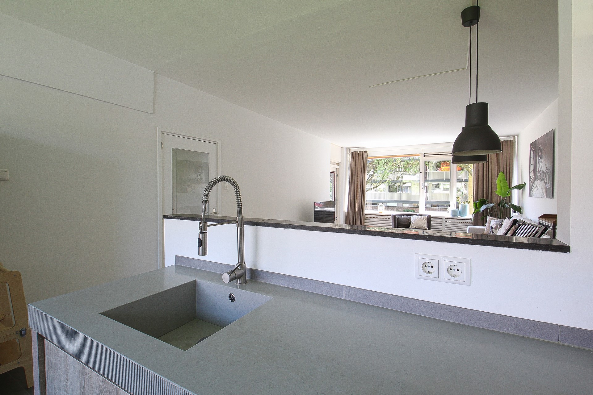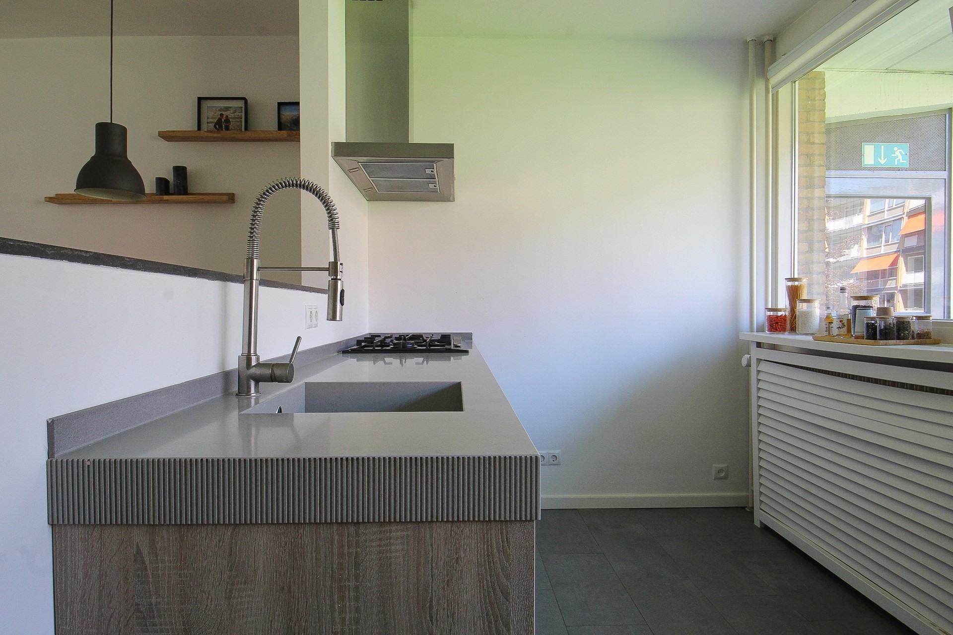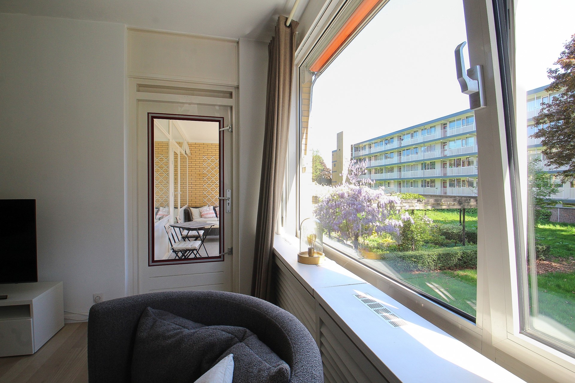 De ruime, lichte doorzonwoonkamer is afgewerkt met een mooie laminaatvloer. Hier heeft u een halfopen keuken, leuke eethoek en royale zithoek. Het aanrechtmeubel in de keuken is voorzien van een 5-pits gaskookplaat, afzuigkap, spoelbak en verschillende lades. Het wandmeubel is voorzien van een vaatwasser, combioven, ingebouwd koffiezetapparaat en koelkast. Vanuit de keuken heeft u een fijn zicht op de woonkamer. Via een loopdeur heeft u direct toegang tot het fijne balkon.