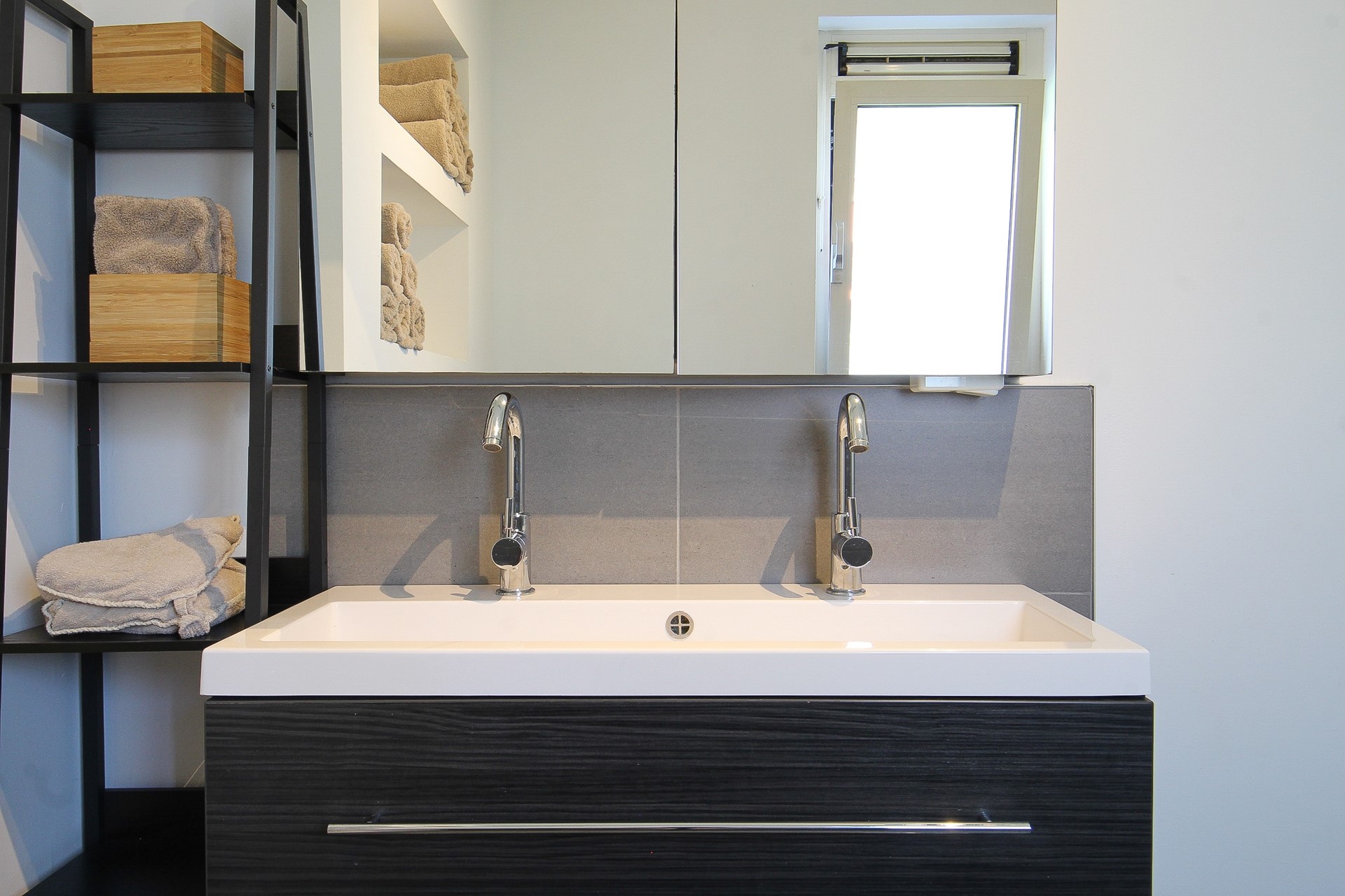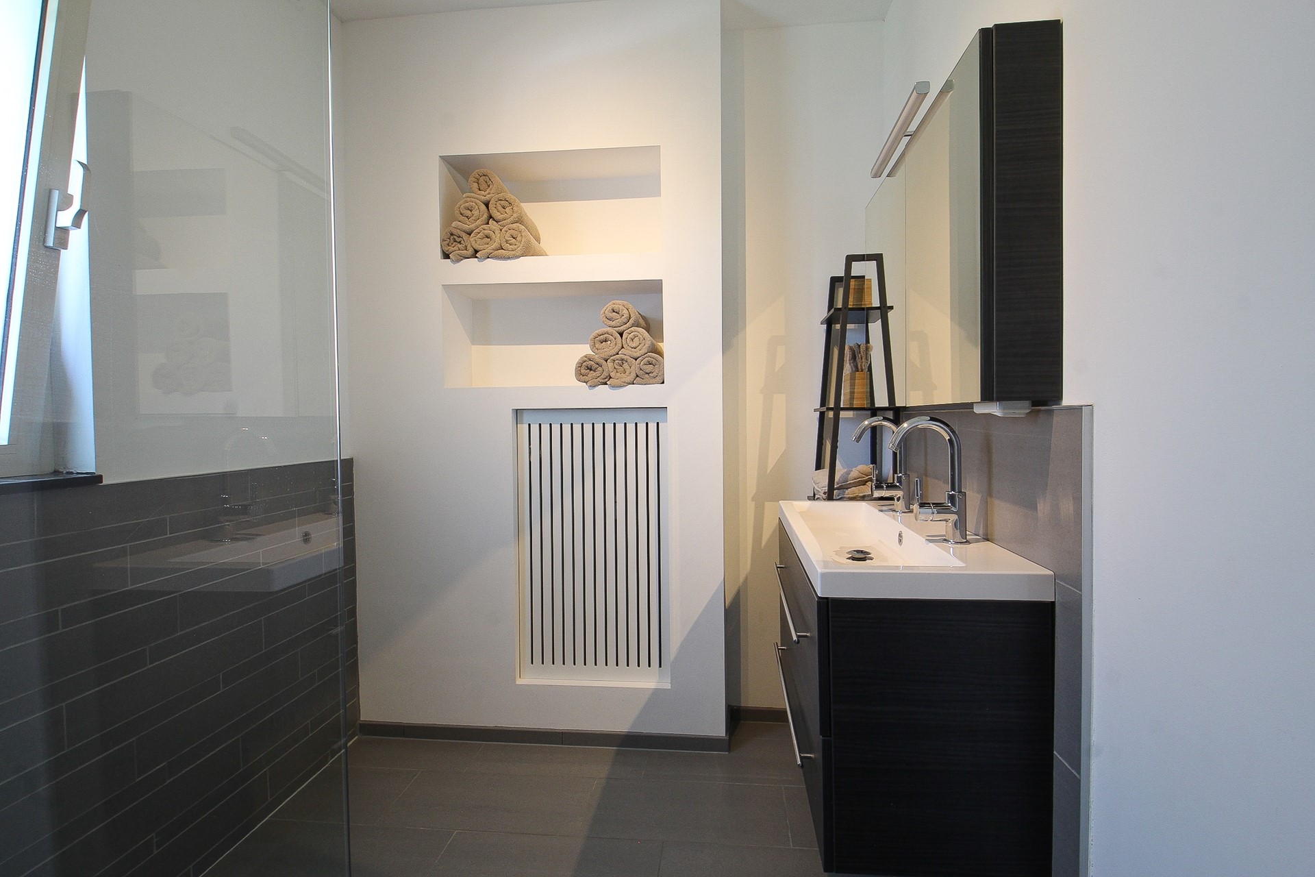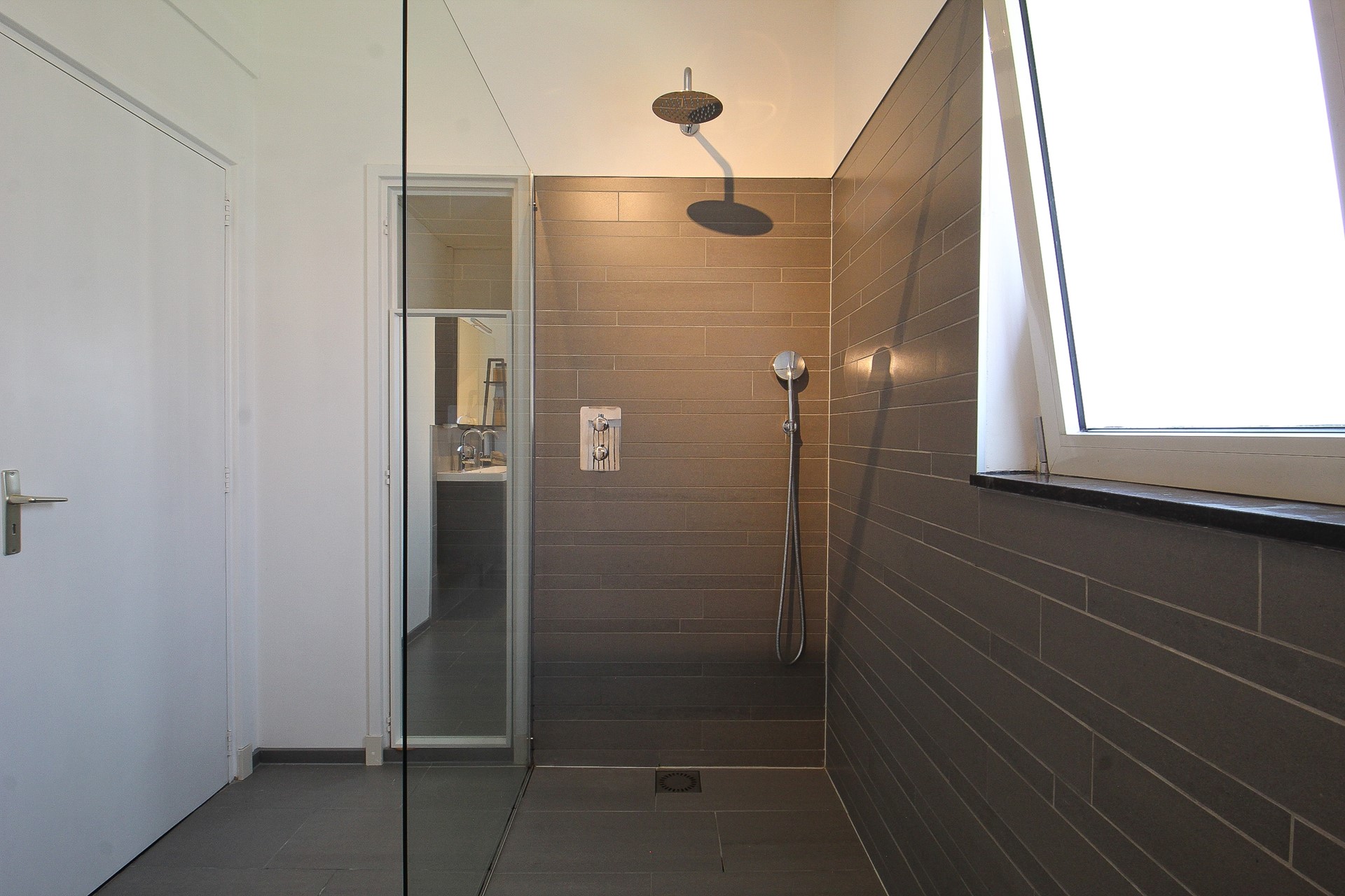 Dan heeft u nog de badkamer en het separate toilet. Beide in eenzelfde stijl afgewerkt. De badkamer beschikt over een luxe inloopdouche met stortdouche, dubbele wastafel en vloerverwarming. Naast het toilet is er een aparte wasruimte met aansluitingen voor wasmachine en droger.