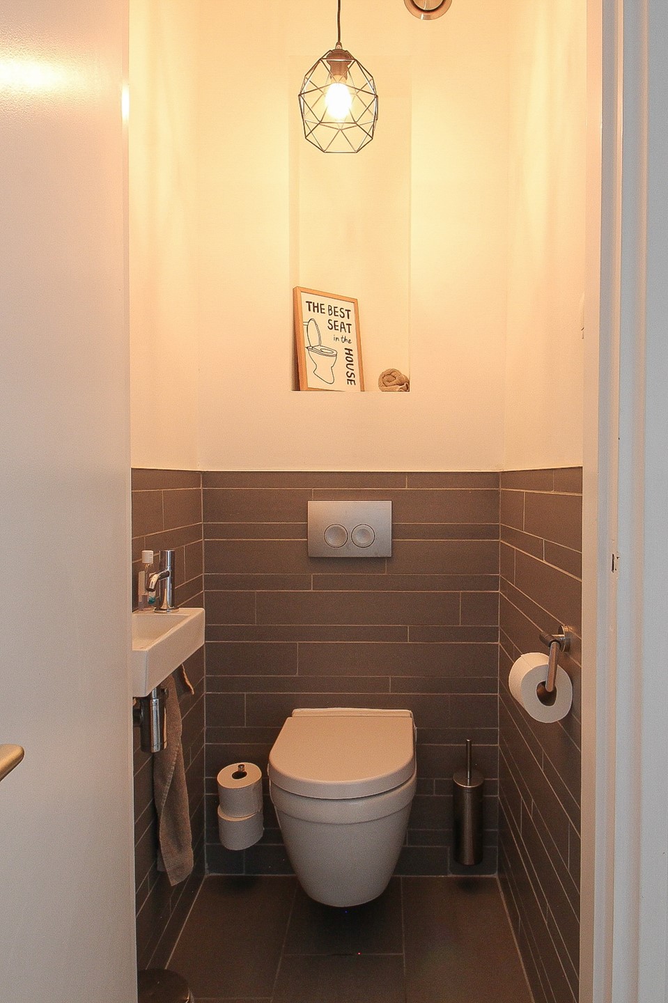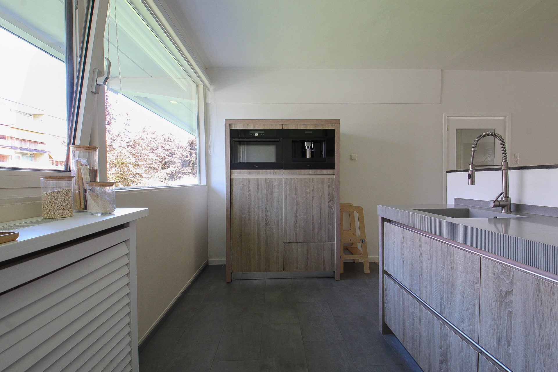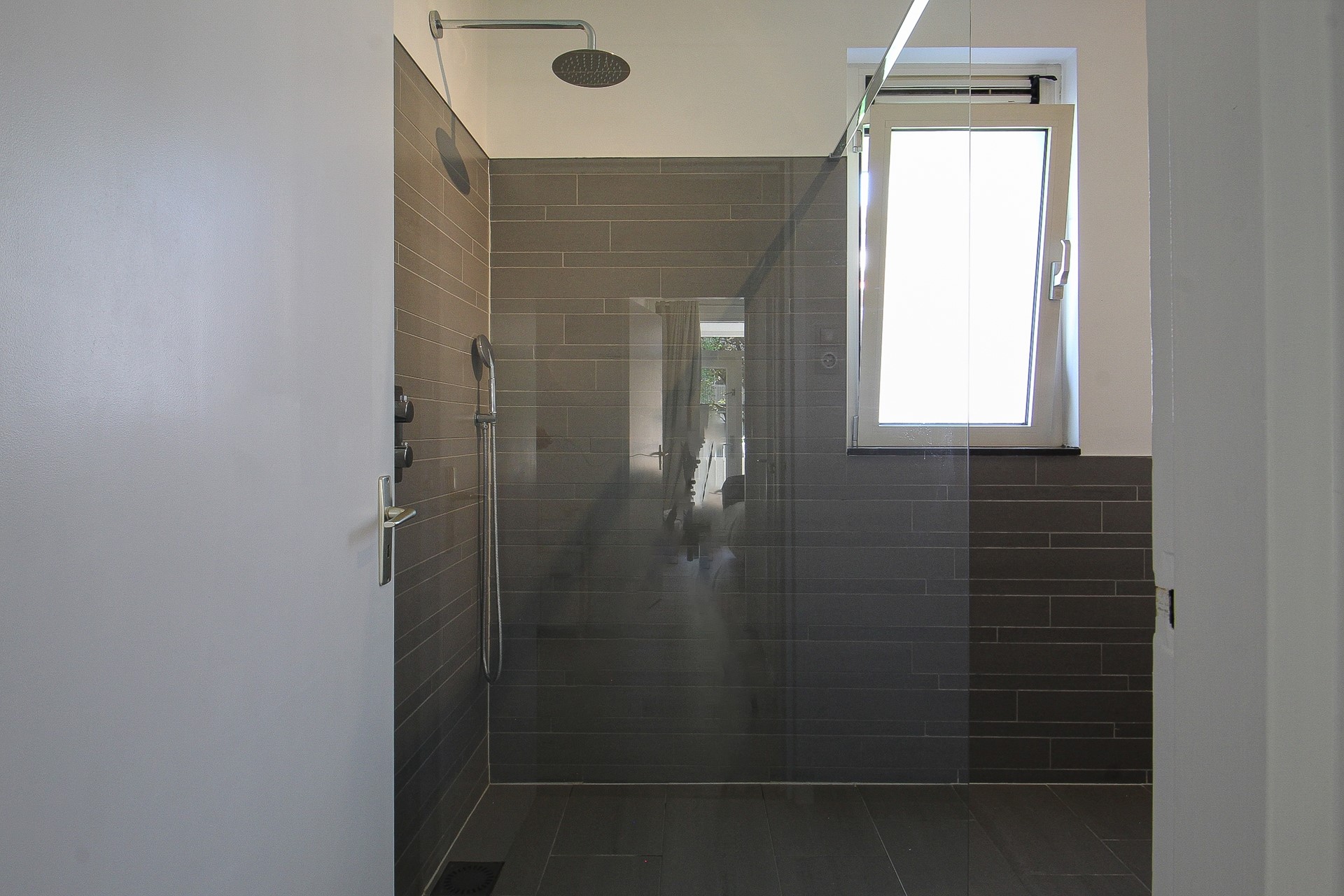 Dan heeft u nog de badkamer en het separate toilet. Beide in eenzelfde stijl afgewerkt. De badkamer beschikt over een luxe inloopdouche met stortdouche, dubbele wastafel en vloerverwarming. Naast het toilet is er een aparte wasruimte met aansluitingen voor wasmachine en droger.
