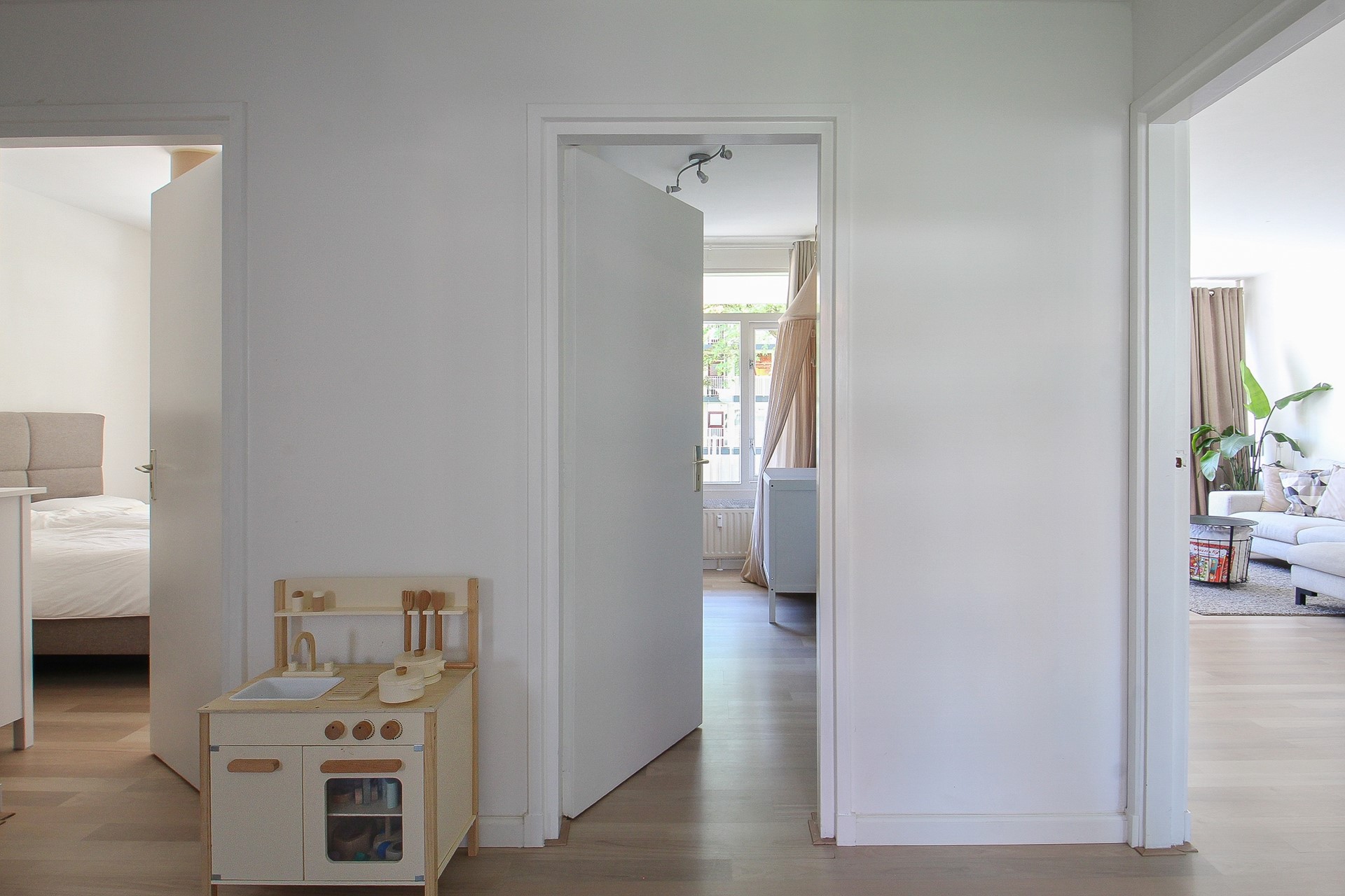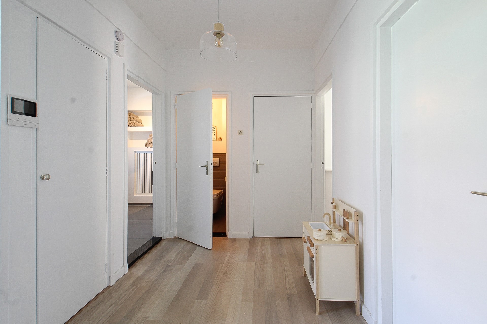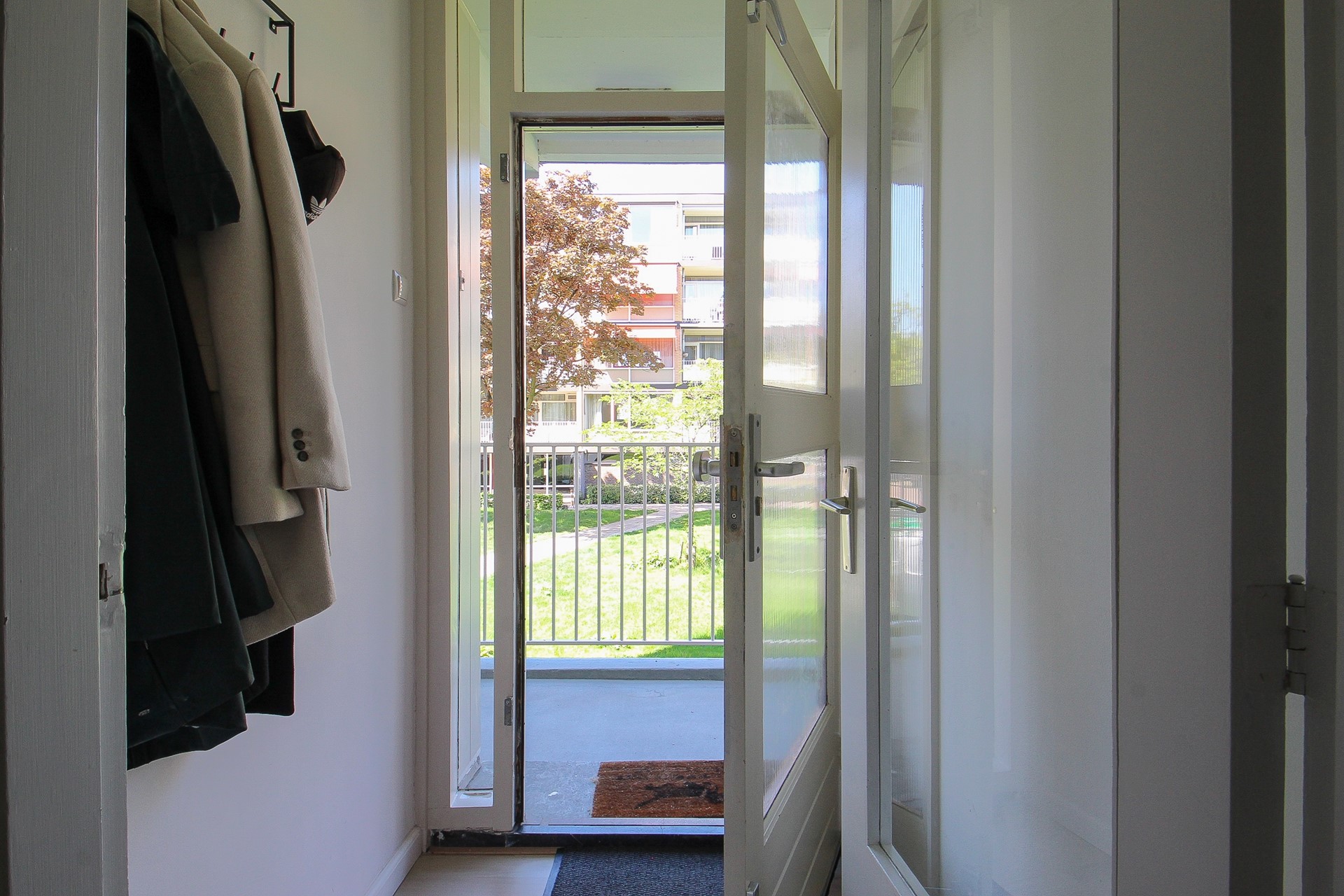 Via de galerij bereikt u de entree van het appartement. In het portaal heeft u de garderobe en bergkast met boiler. Vervolgens een centrale hal met deuren naar alle vertrekken.