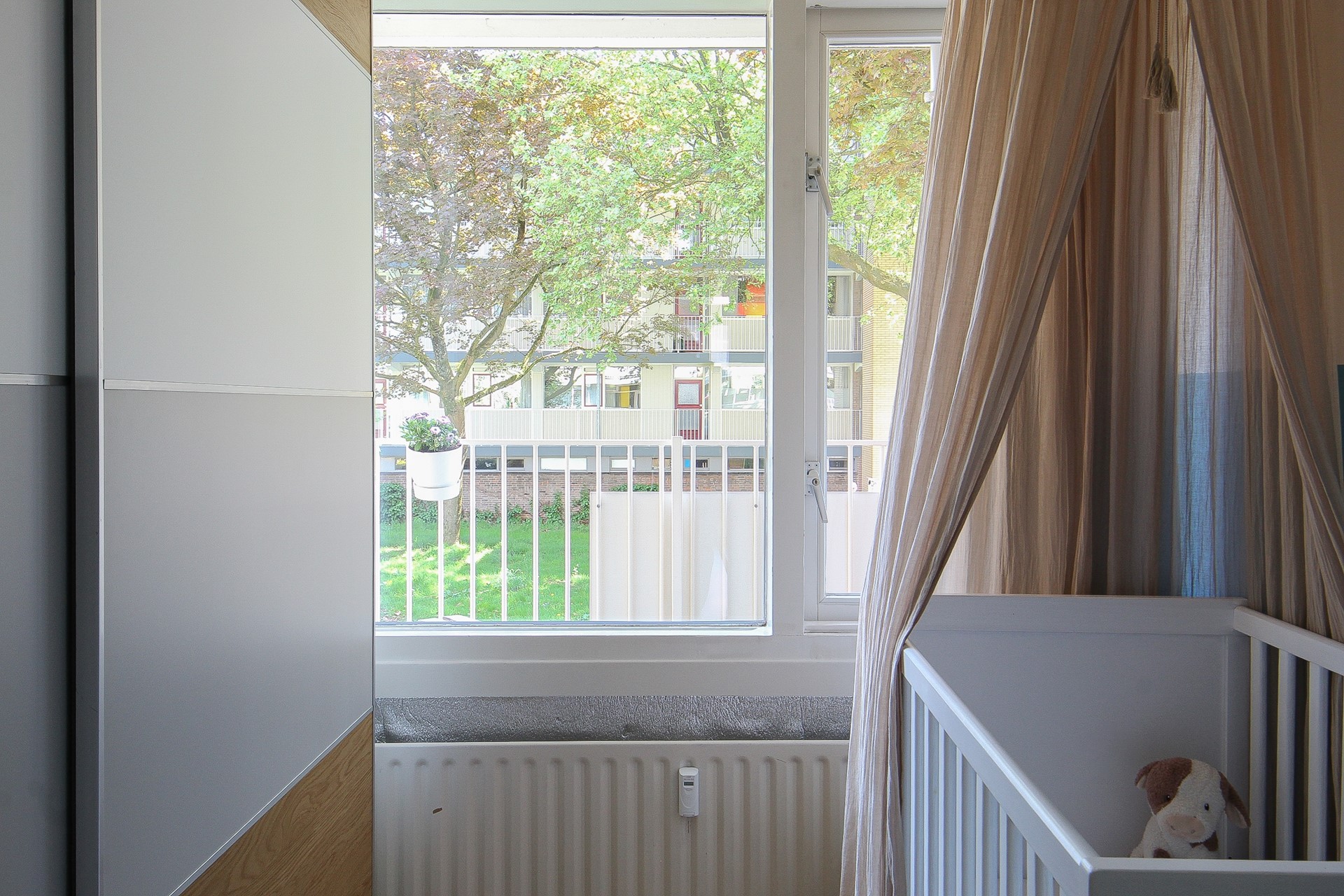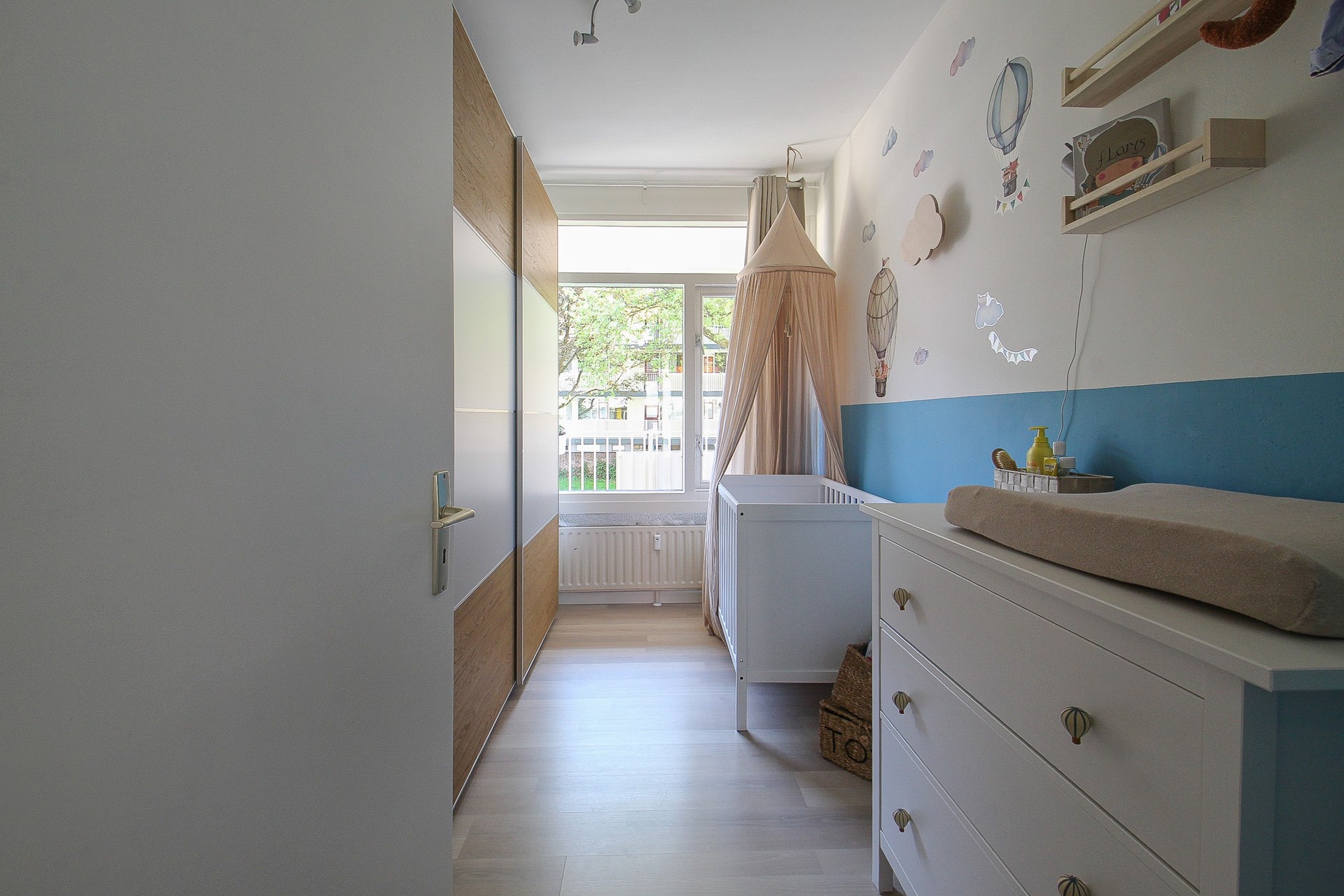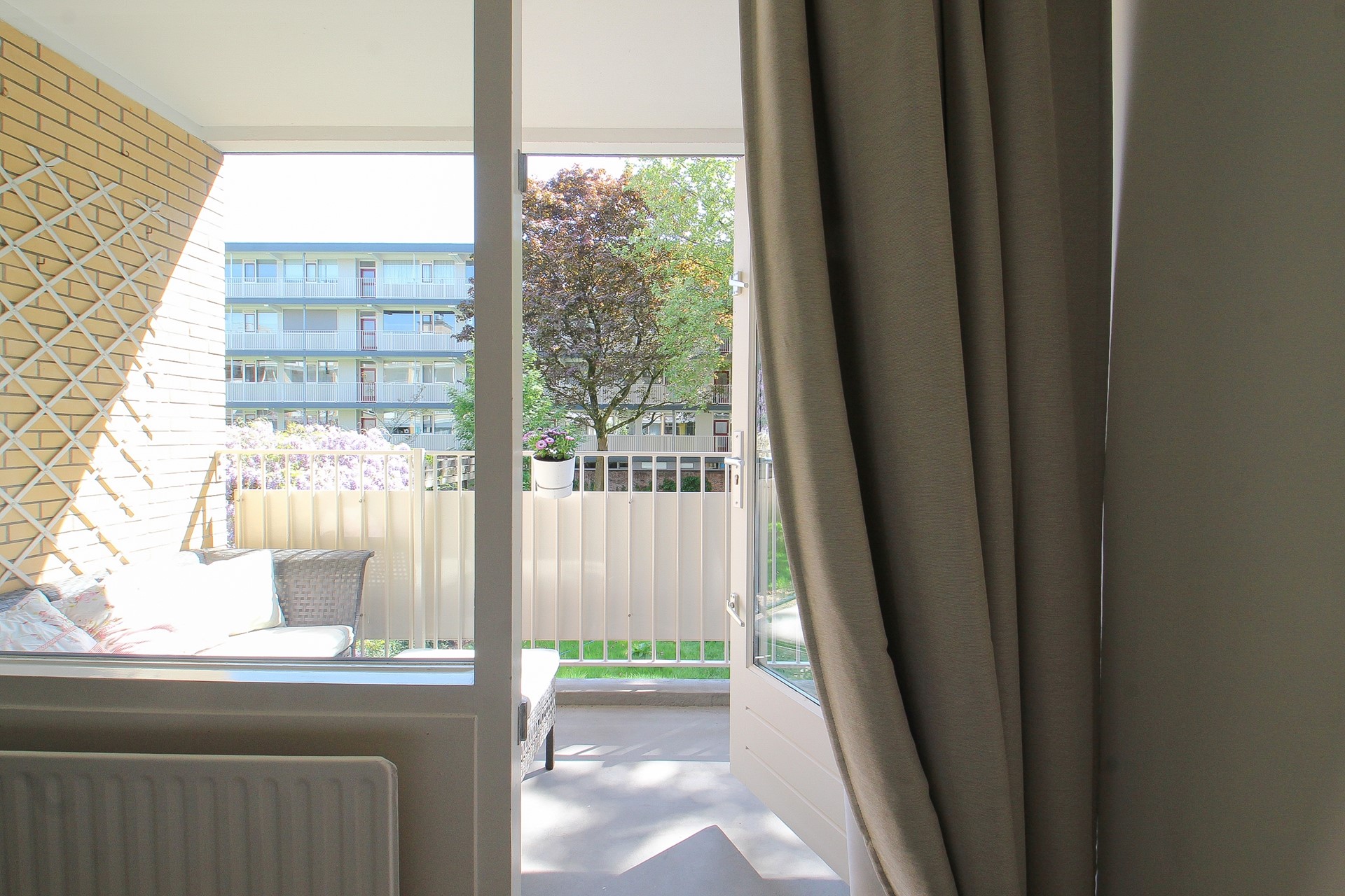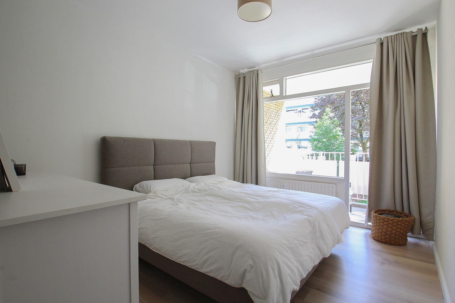 Vervolgens aan de hal de twee slaapkamers. De grootste slaapkamer (ca.12m²) heeft een vaste kast en biedt ook toegang tot het balkon. De tweede slaapkamer (ca.8,5m²) is zeer geschikt als kleedruimte, werk-/babykamer.