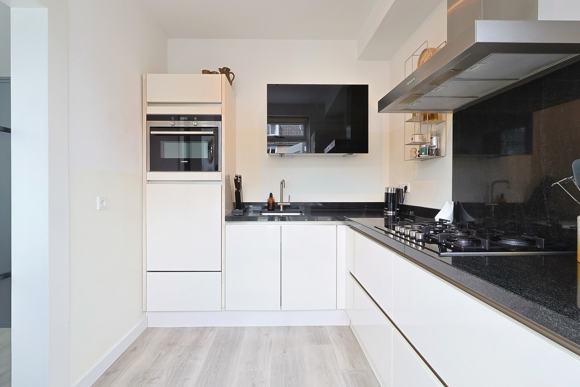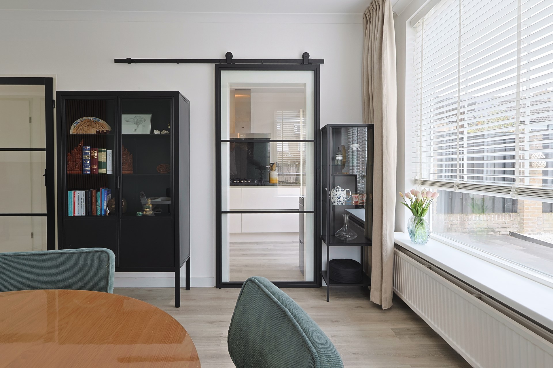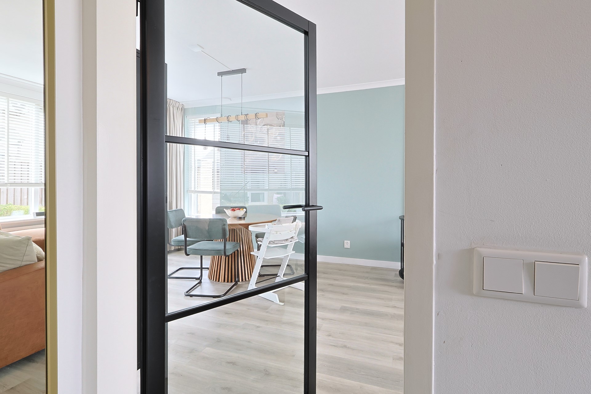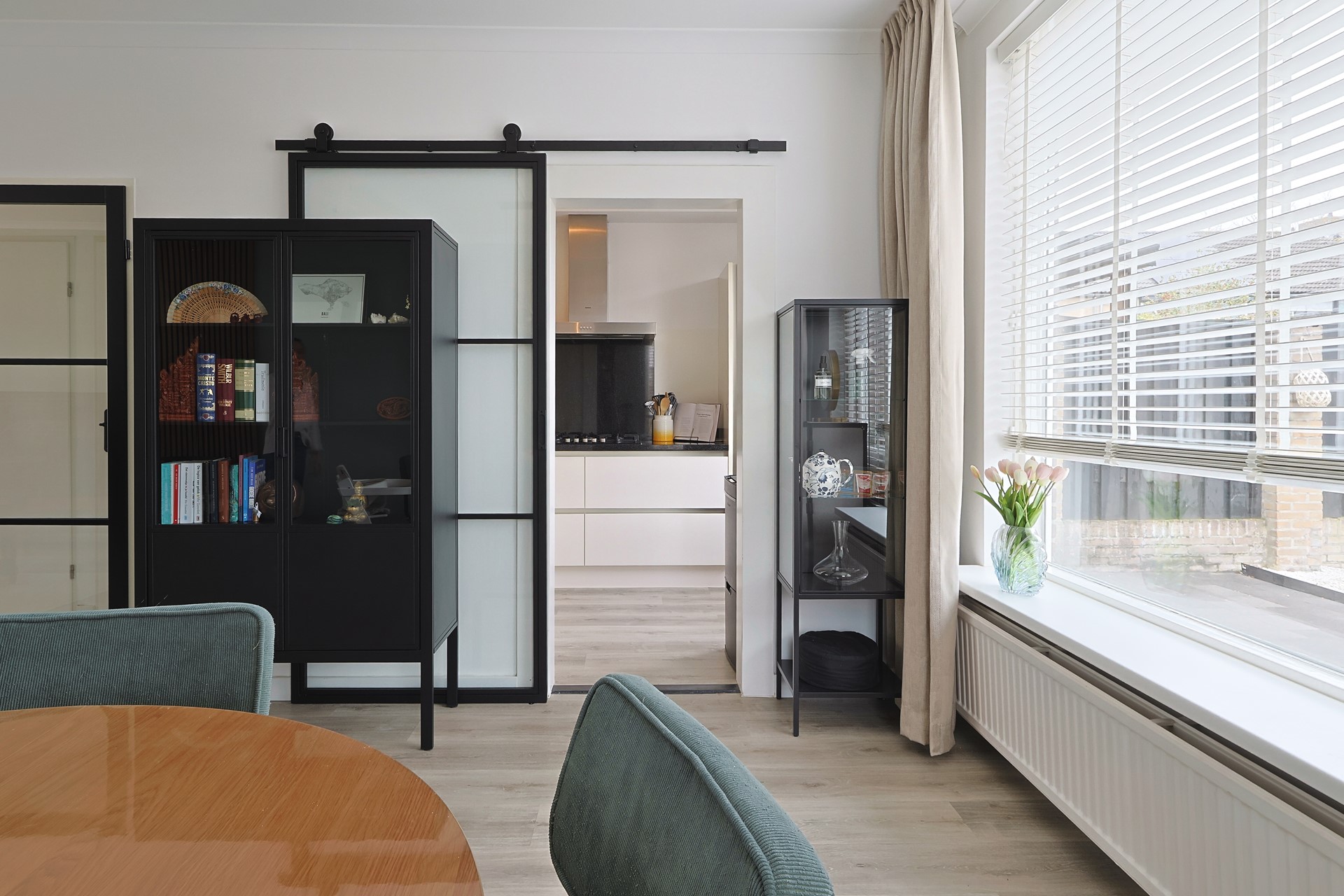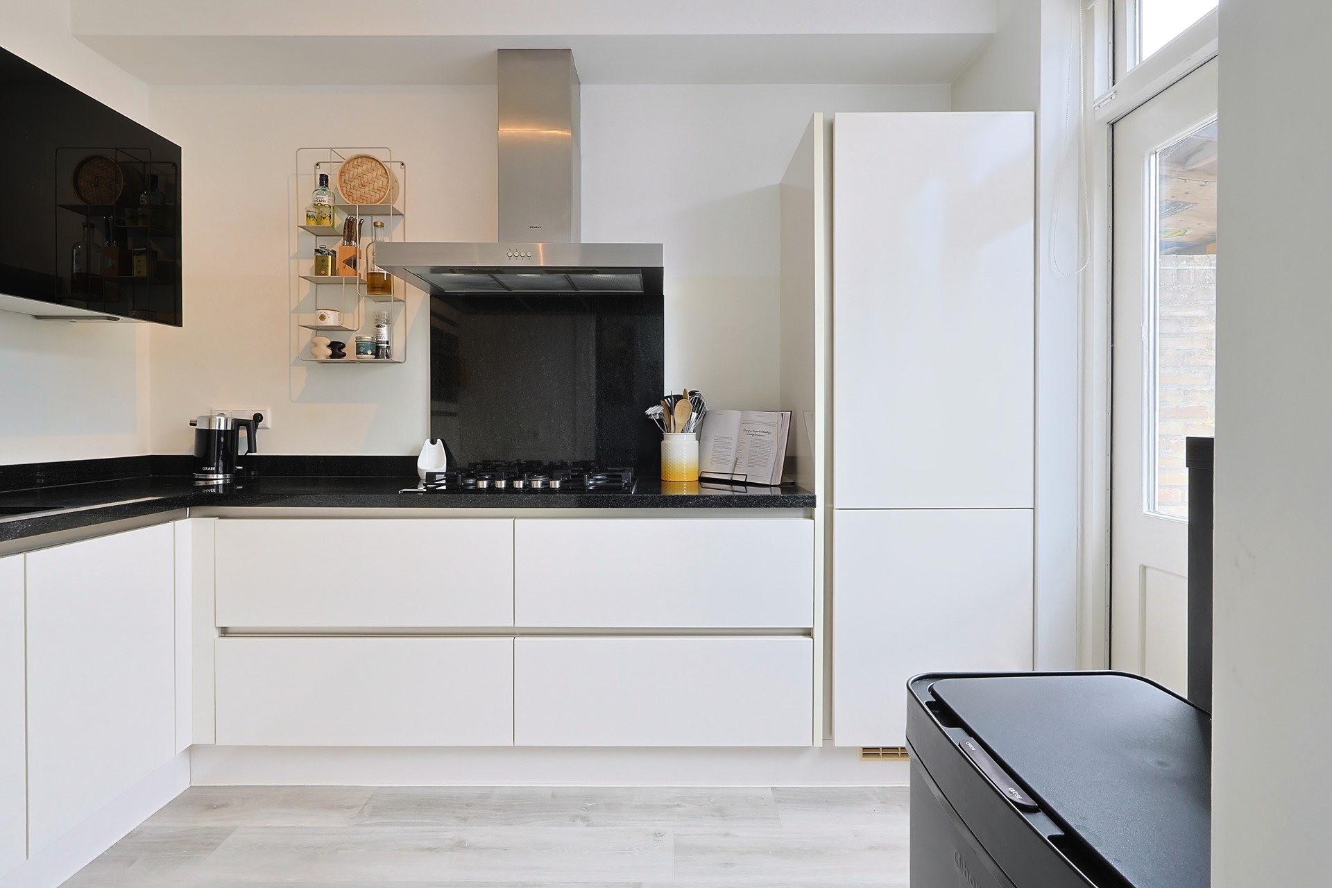 Entree met hal, moderne meterkast, trapopgang, trapkast en toiletruimte. Moderne stalen deur naar de woonkamer met grote raampartijen aan voor- en achterzijde en een loopdeur naar de achtertuin. Keurige afwerking met een PVC-vloer en strak gestucte wanden en plafonds. Handige stalen schuifdeur naar de moderne keuken (2019) met meubel in een hoekopstelling, voorzien van onder andere een gaskookplaat met afzuigkap, oven, koel-, vriescombinatie en een vaatwasser (2024). Eveneens een loopdeur naar de tuin.