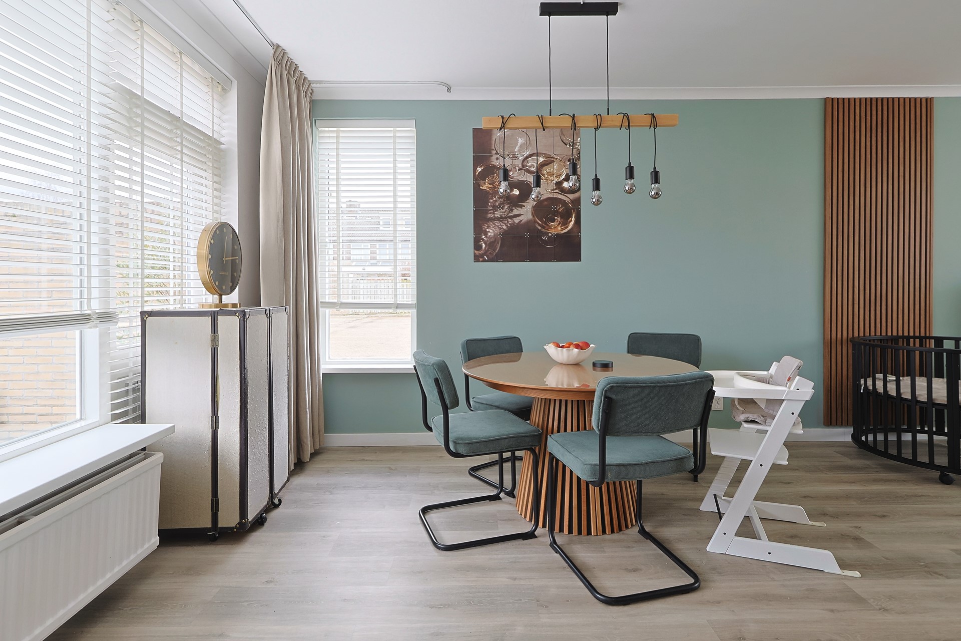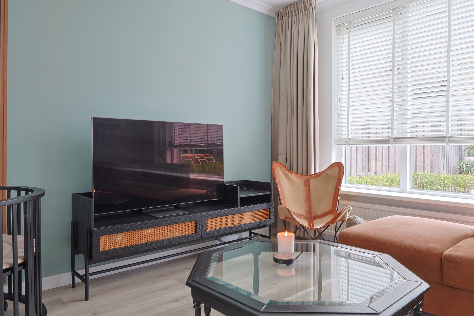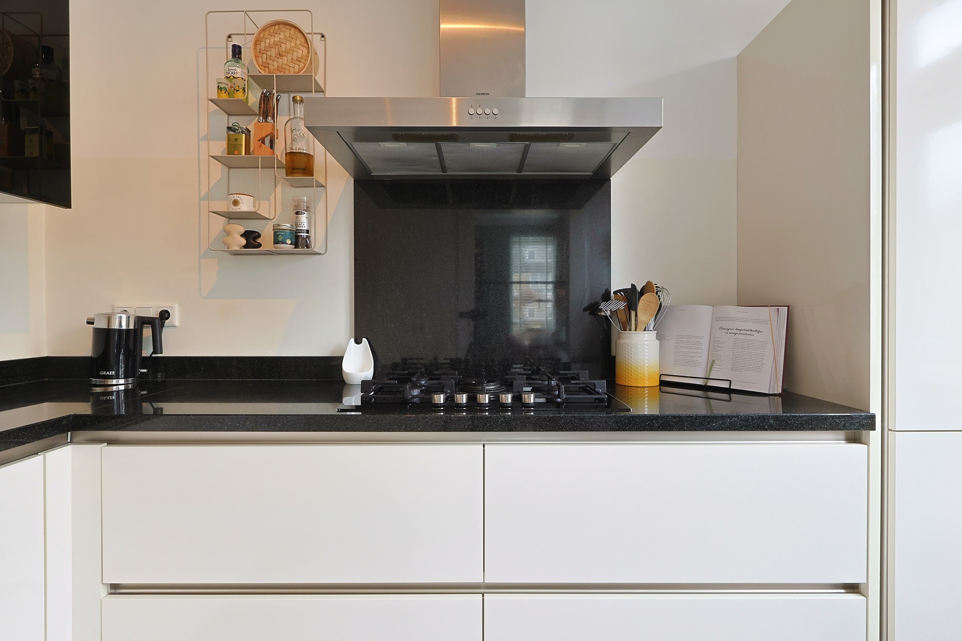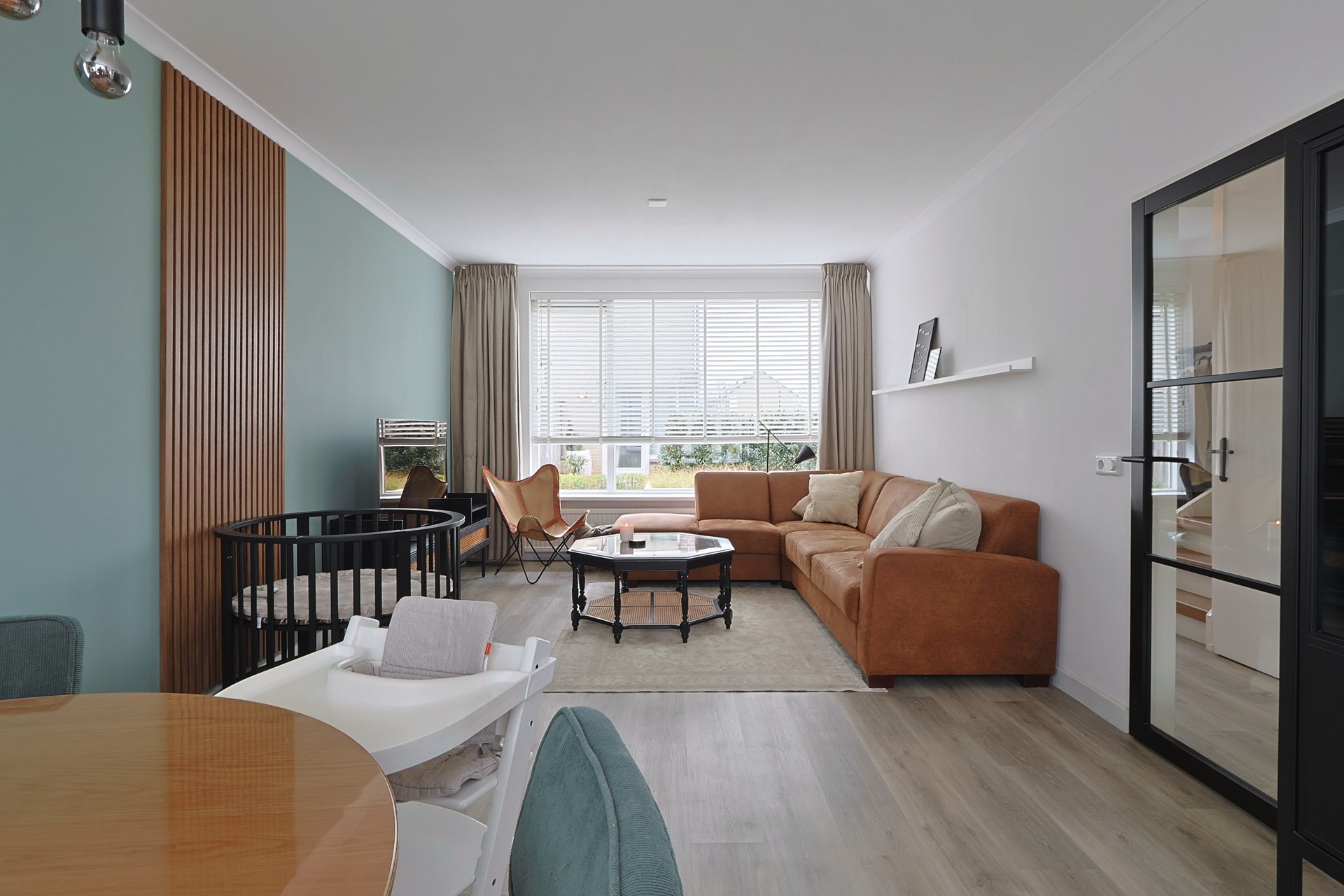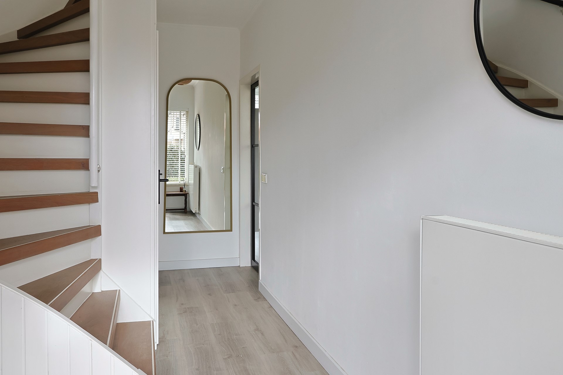 Entree met hal, moderne meterkast, trapopgang, trapkast en toiletruimte. Moderne stalen deur naar de woonkamer met grote raampartijen aan voor- en achterzijde en een loopdeur naar de achtertuin. Keurige afwerking met een PVC-vloer en strak gestucte wanden en plafonds. Handige stalen schuifdeur naar de moderne keuken (2019) met meubel in een hoekopstelling, voorzien van onder andere een gaskookplaat met afzuigkap, oven, koel-, vriescombinatie en een vaatwasser (2024). Eveneens een loopdeur naar de tuin.
