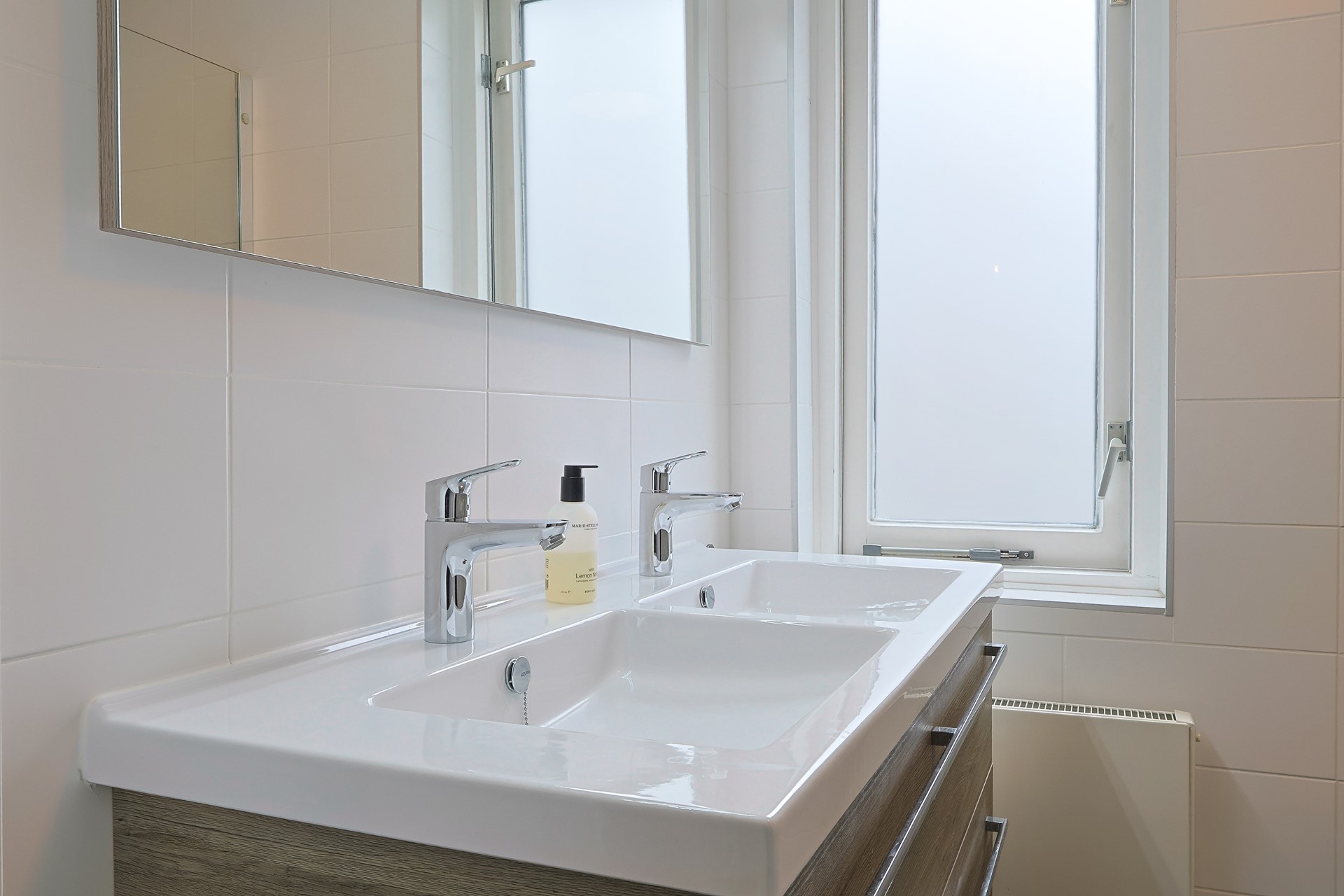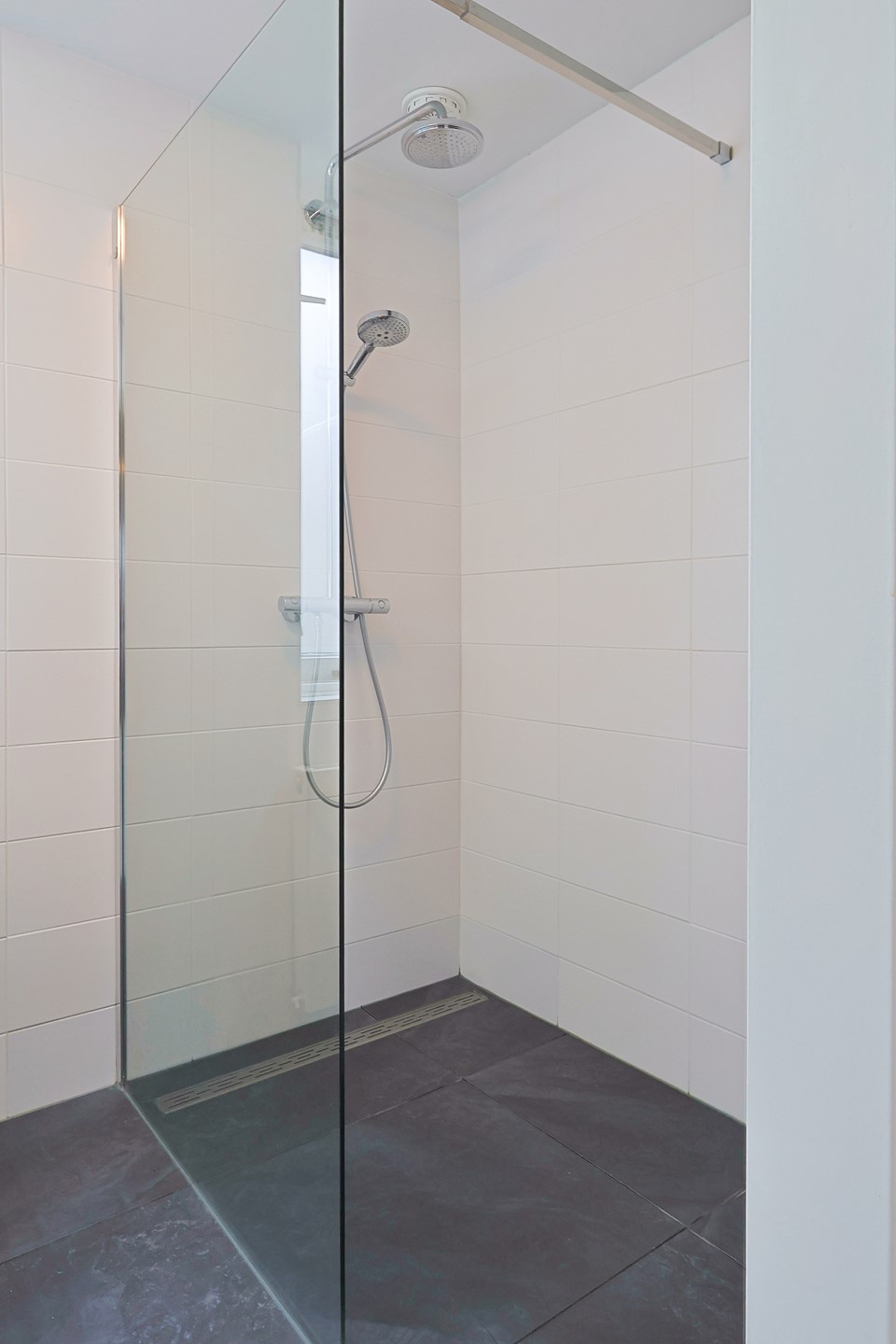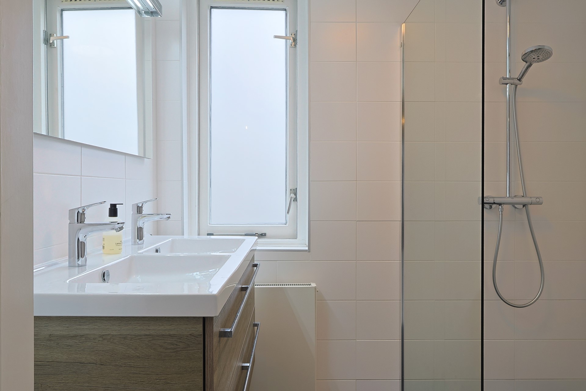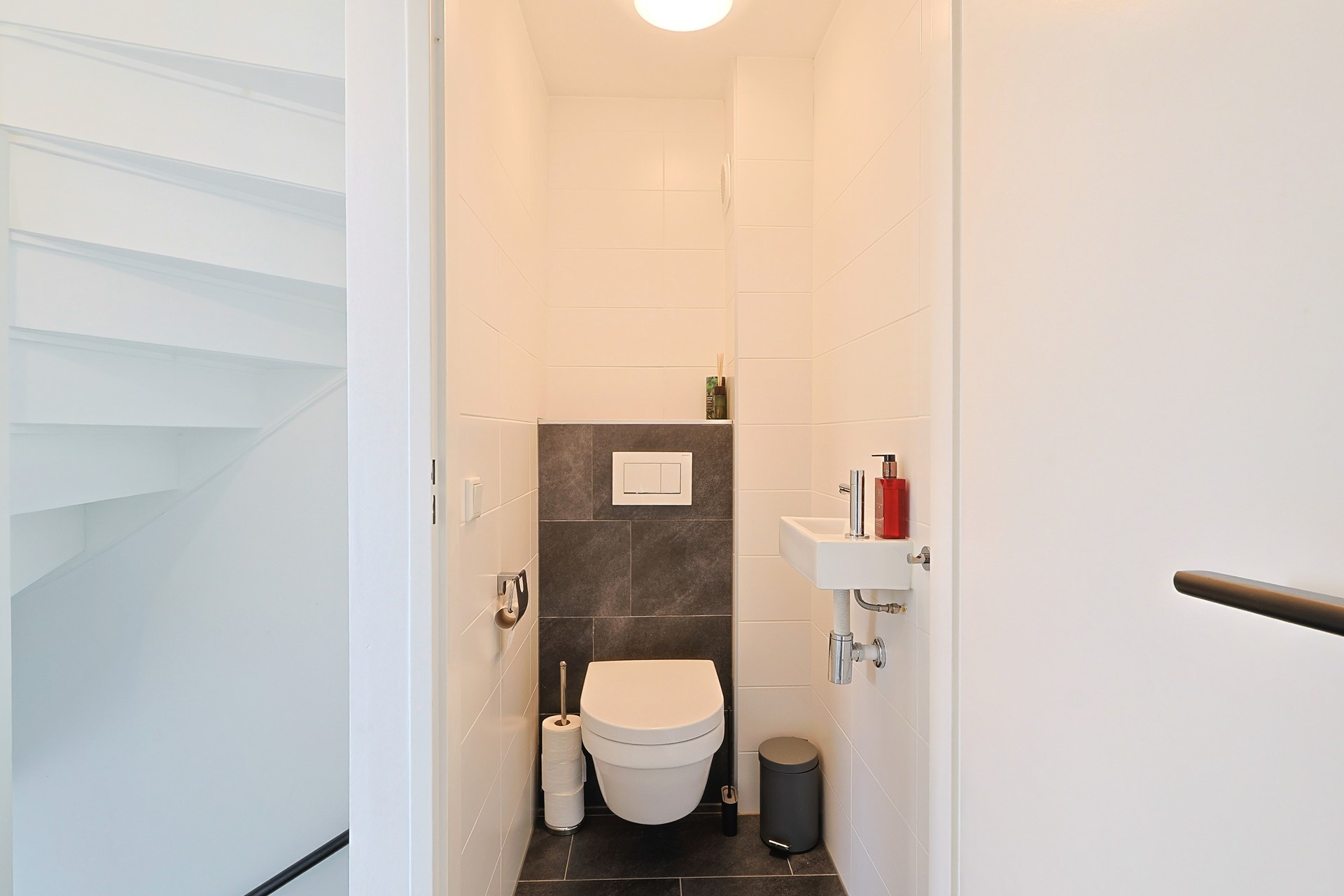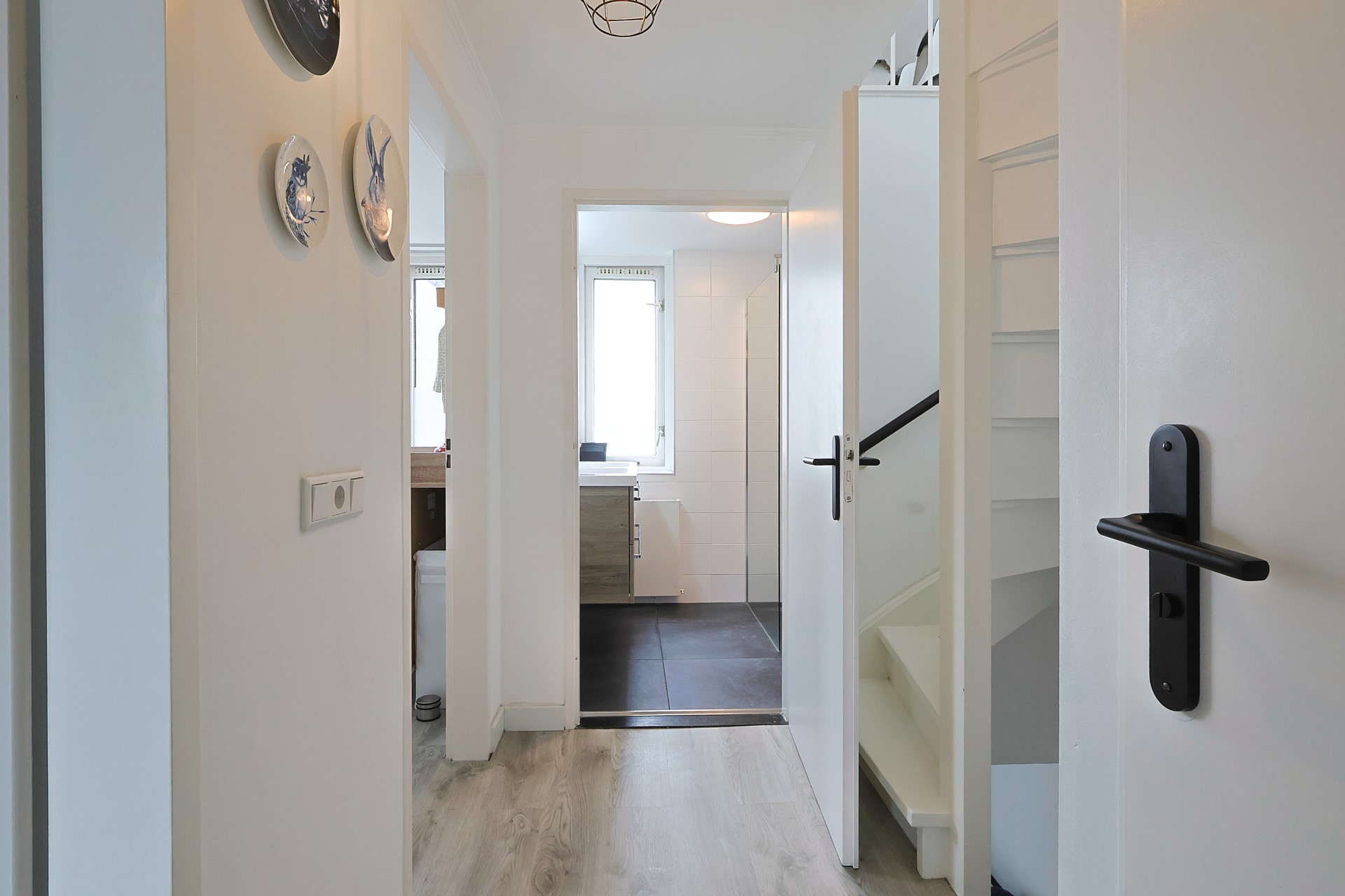 Overloop met drie slaapkamers, een badkamer en een separaat toilet. Een wastafel in meubel in de slaapkamer aan de voorzijde en een airco in de ouderslaapkamer aan achterzijde. De badkamer (2019) is volledig betegeld en uitgerust met een inloopdouche en een dubbele wastafel in meubel.
