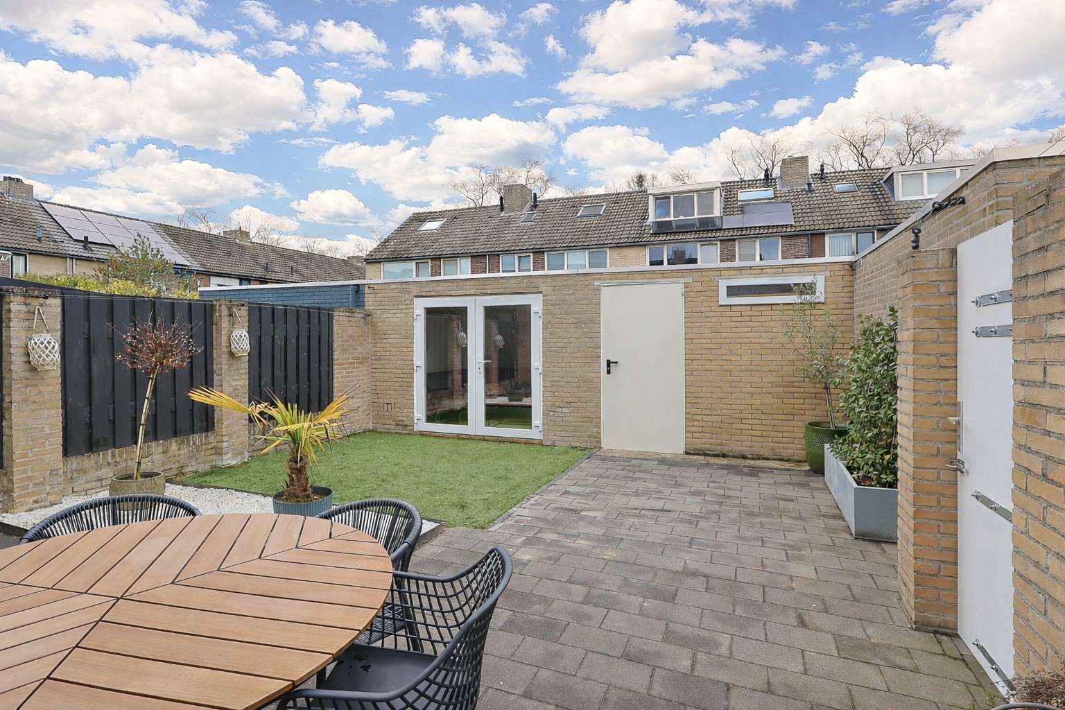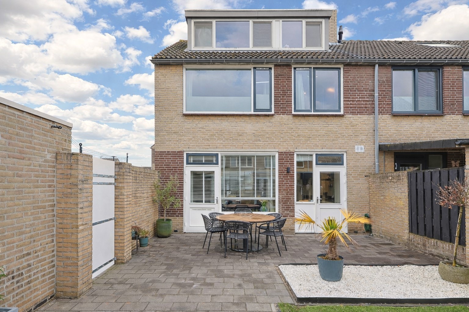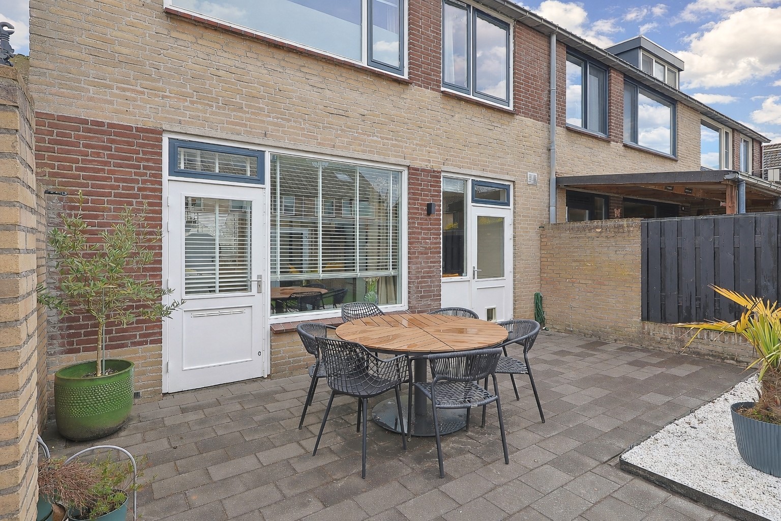 Leuke voortuin grenzend aan een leuk speelpleintje met groen. Achtertuin met terras, poort tuinkamer, berging en de aanpalende garage. In een deel van de oorspronkelijke berging is de sfeervolle tuinkamer met openslaande tuindeuren gerealiseerd, waardoor u hier zowel bij zonnig als minder mooi weer comfortabel van de tuin kunt genieten. Via het resterende deel van de berging is de garage weer toegankelijk. De garage is voorzien van een elektrische sectionaaldeur