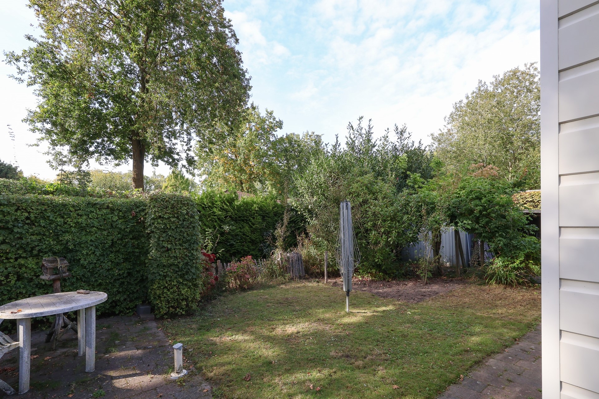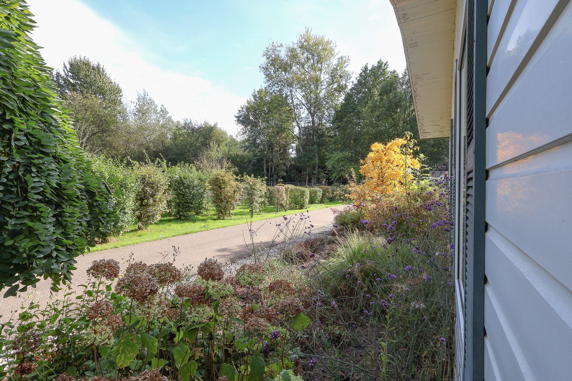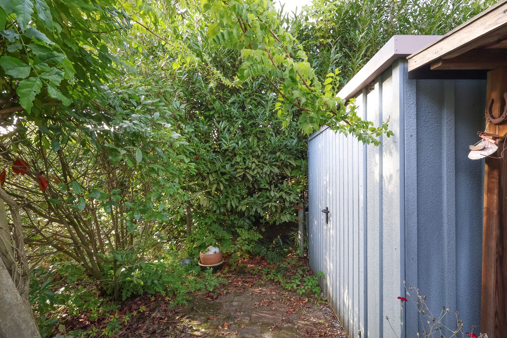 Privacy biedende tuin rondom met veel groen met verhoogd terras, de vrijstaande schuur en een grote oprit.