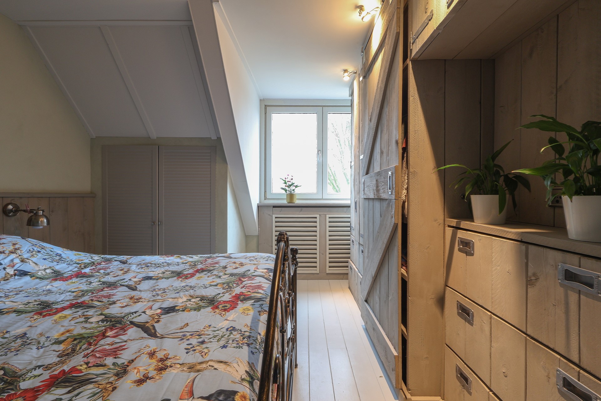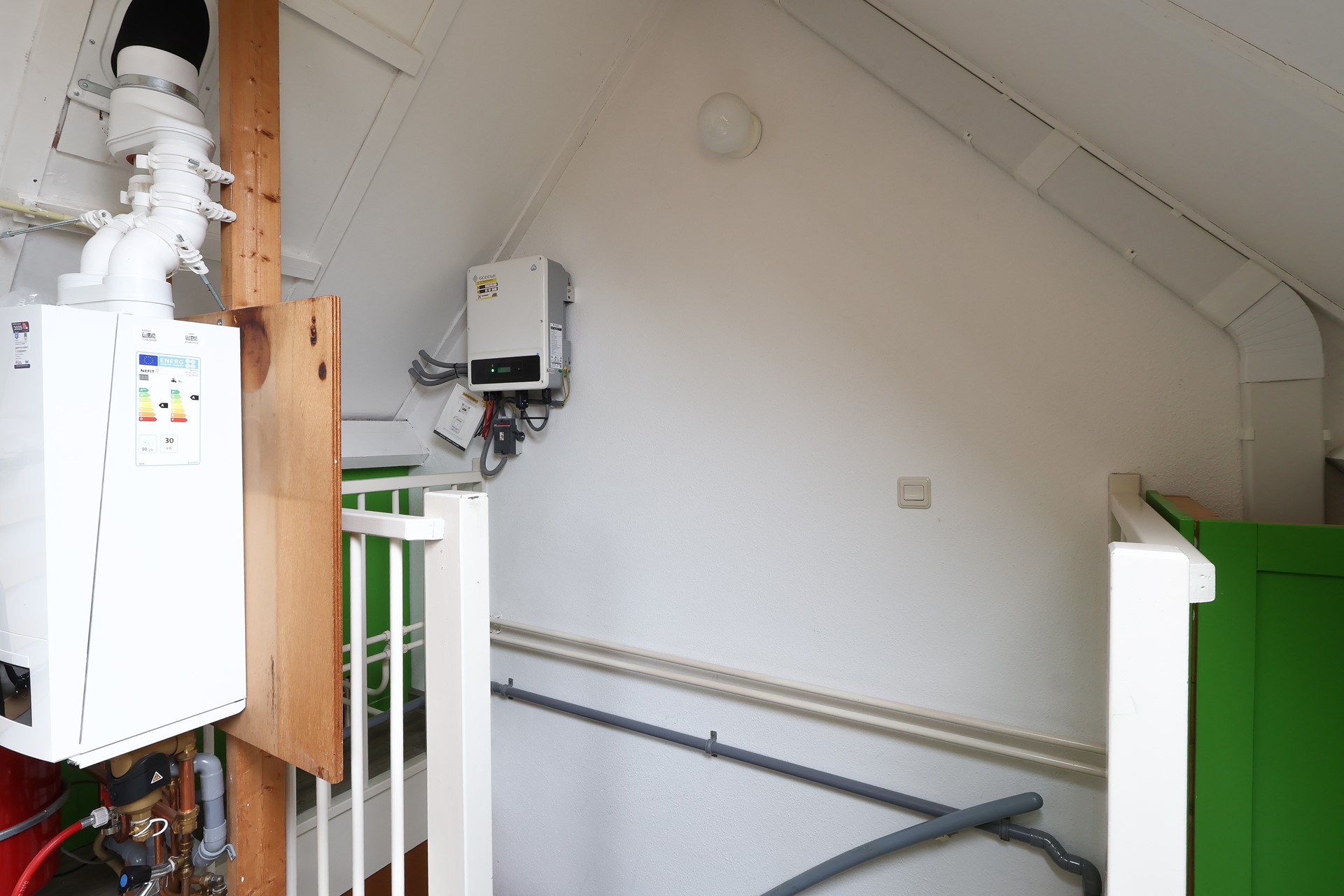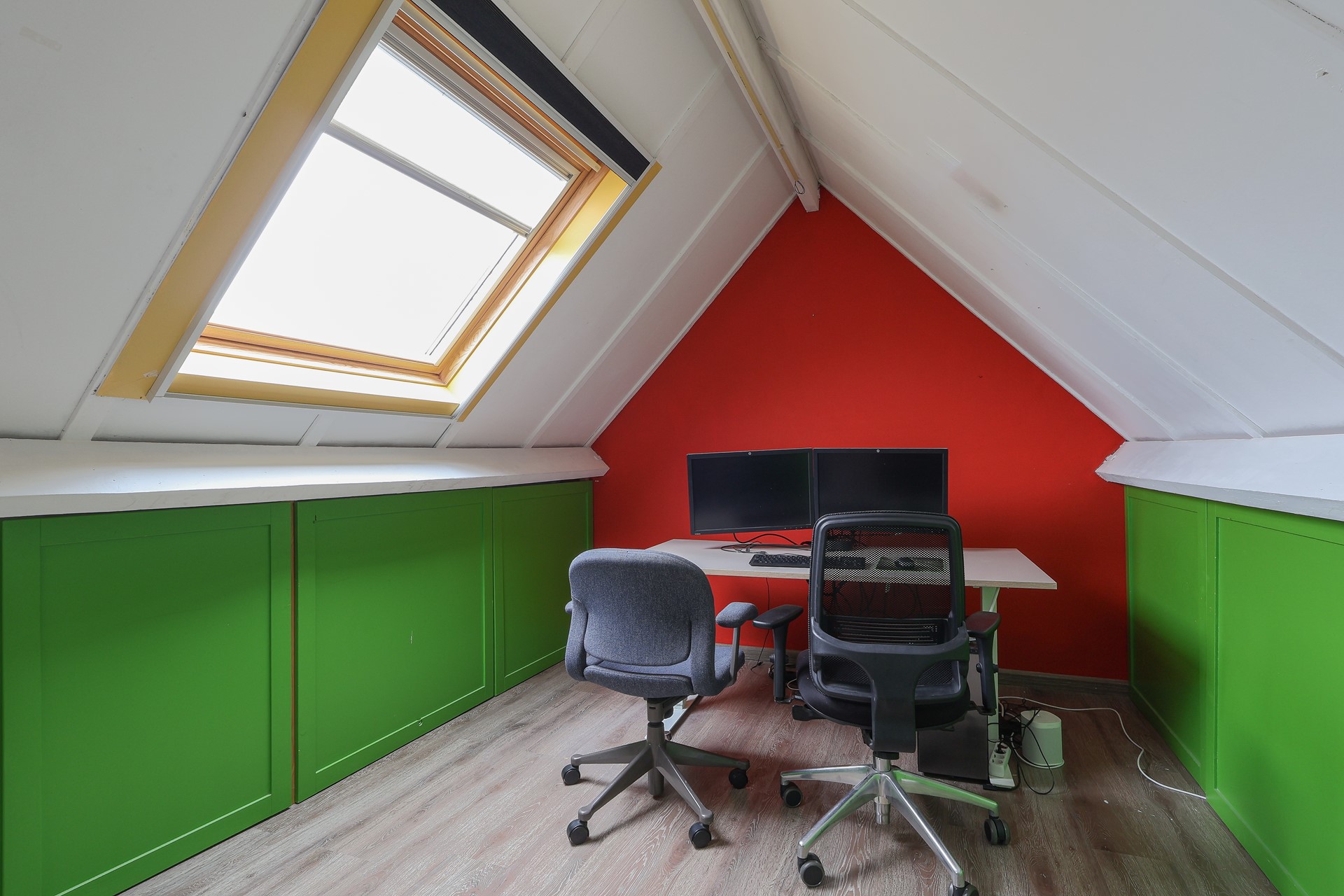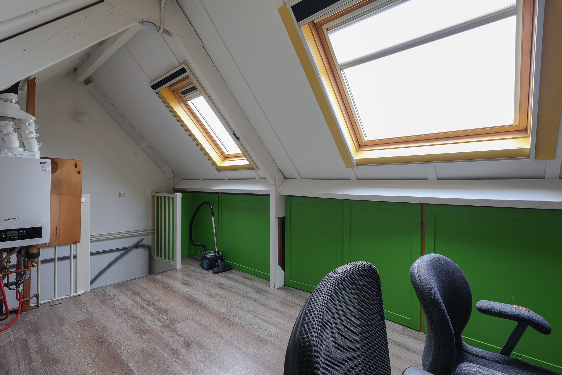 Ruime multifunctionele zolderverdieping, geschikt als extra slaapkamer of werkruimte, met bergruimte onder de schuine kap. Daarnaast bevinden zich hier de afzuigunit voor de centrale afzuiging en de HR-combiketel. De verdieping is voorzien van twee Velux dakramen met horren, plissé gordijnen en verduistering.