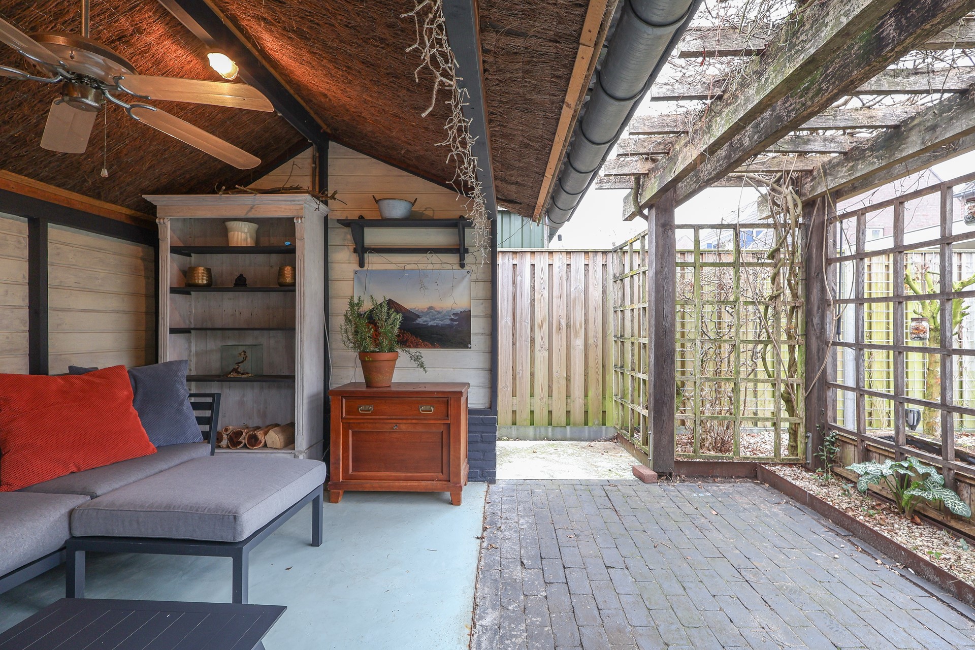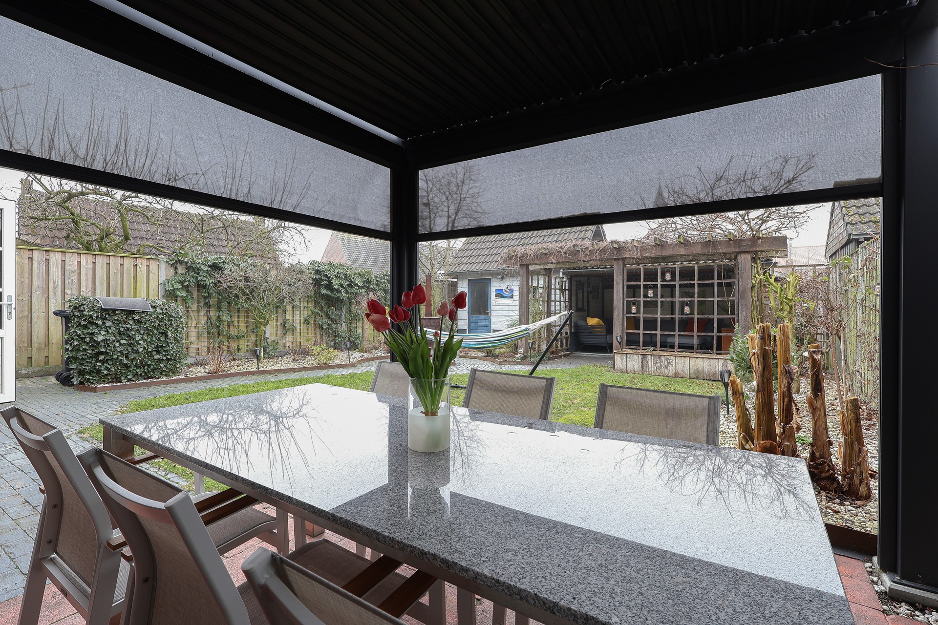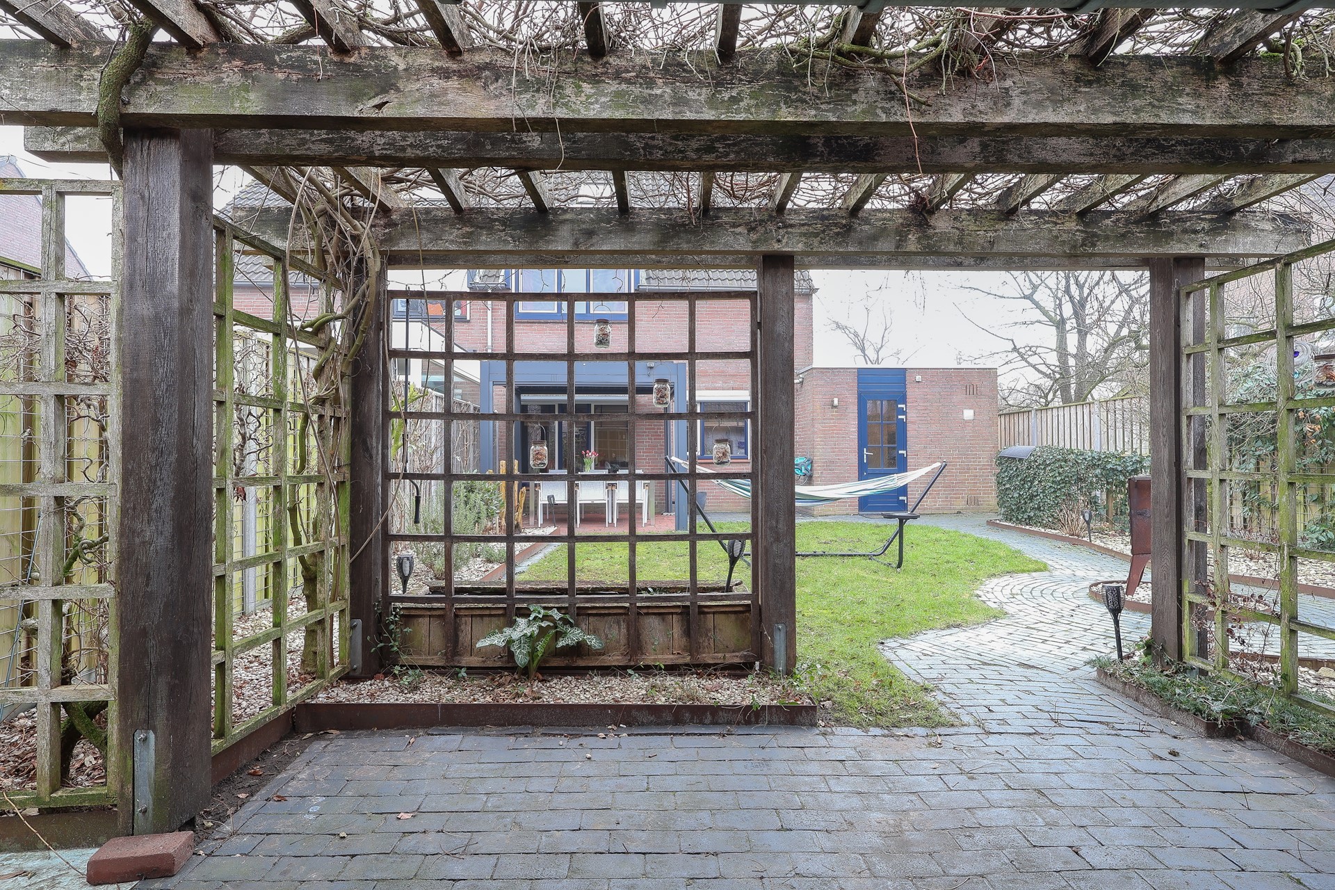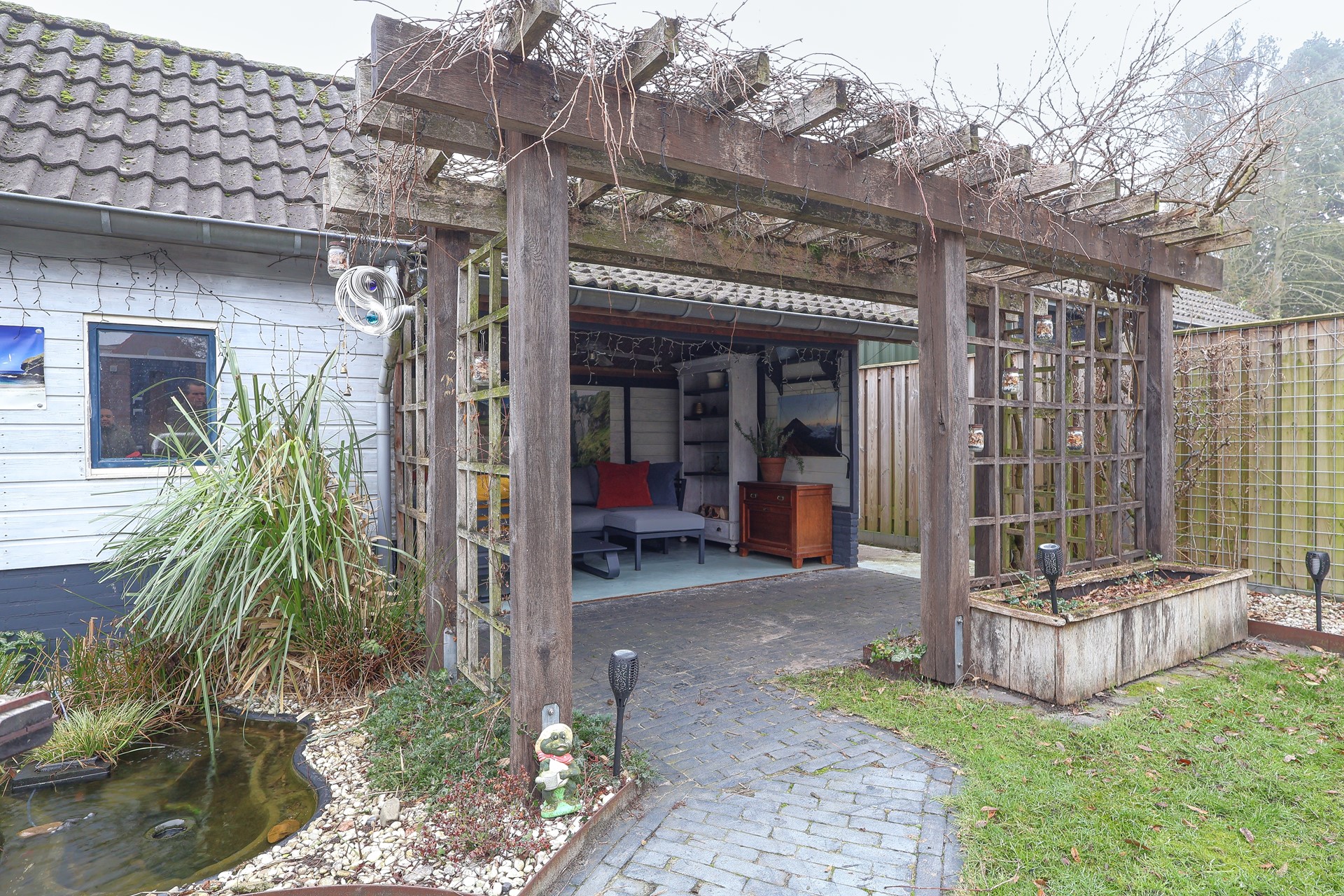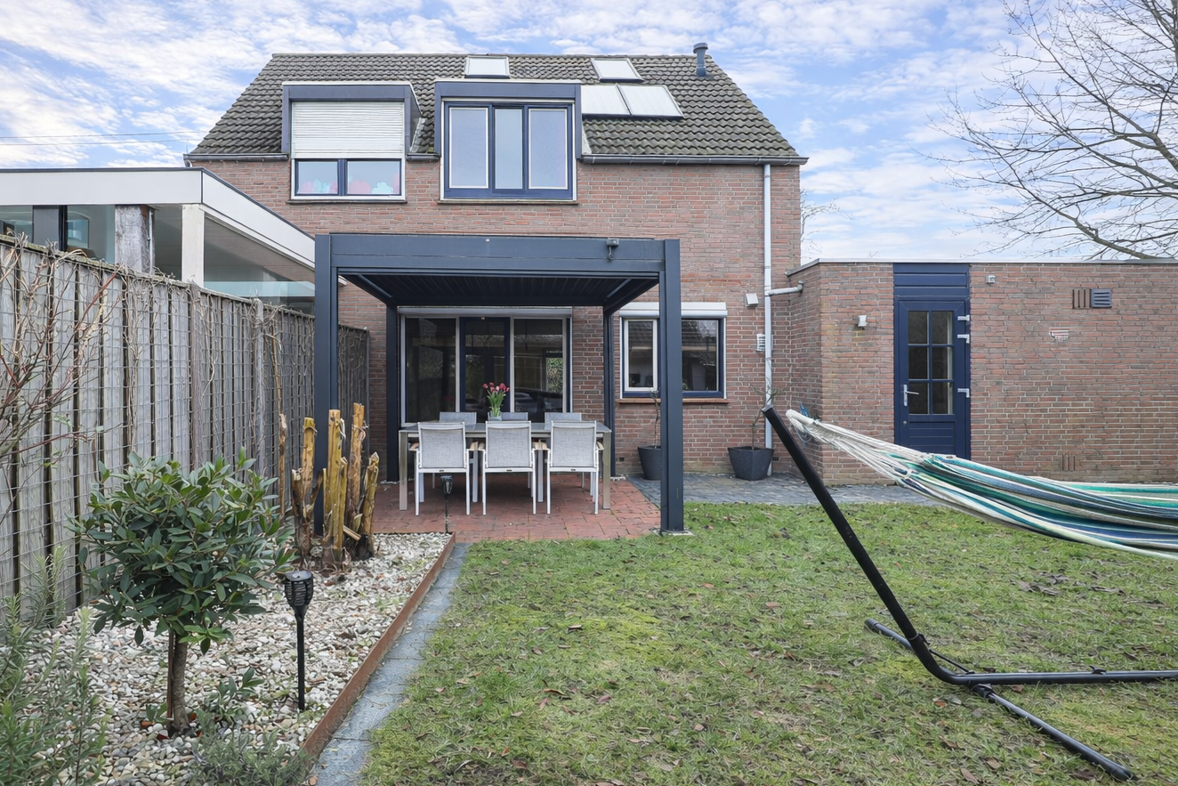 De woning is mooi gelegen aan een rustig, doodlopend hoekje in de wijk. Verzorgde voortuin met een brede oprit en achterom met poort naar de fraai aangelegde achtertuin. Aluminium overkapping met screens direct aan de woning, een schuur met zolder en aangrenzend overdekt terras met prieel. De achtertuin is gunstig gelegen op het westen.