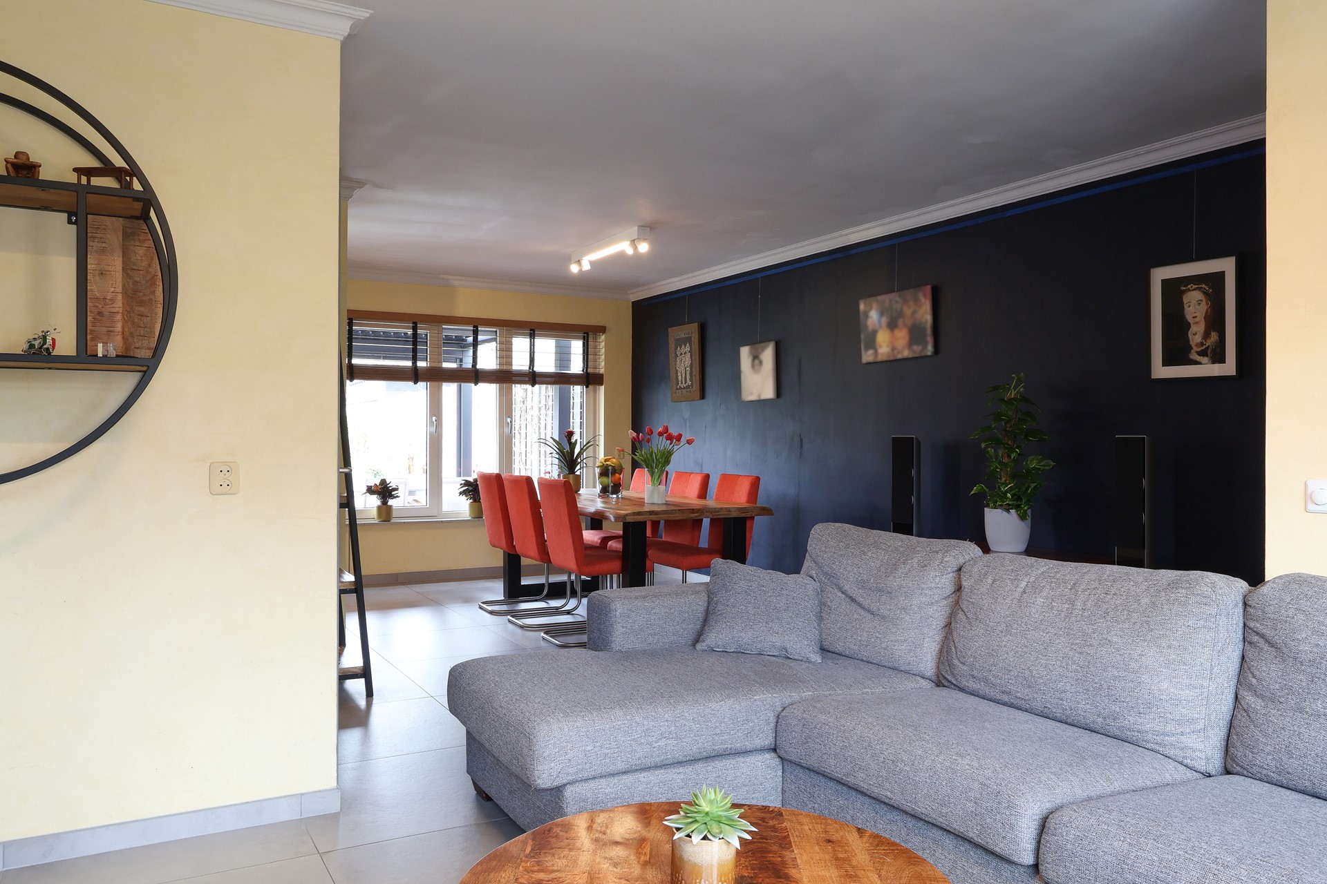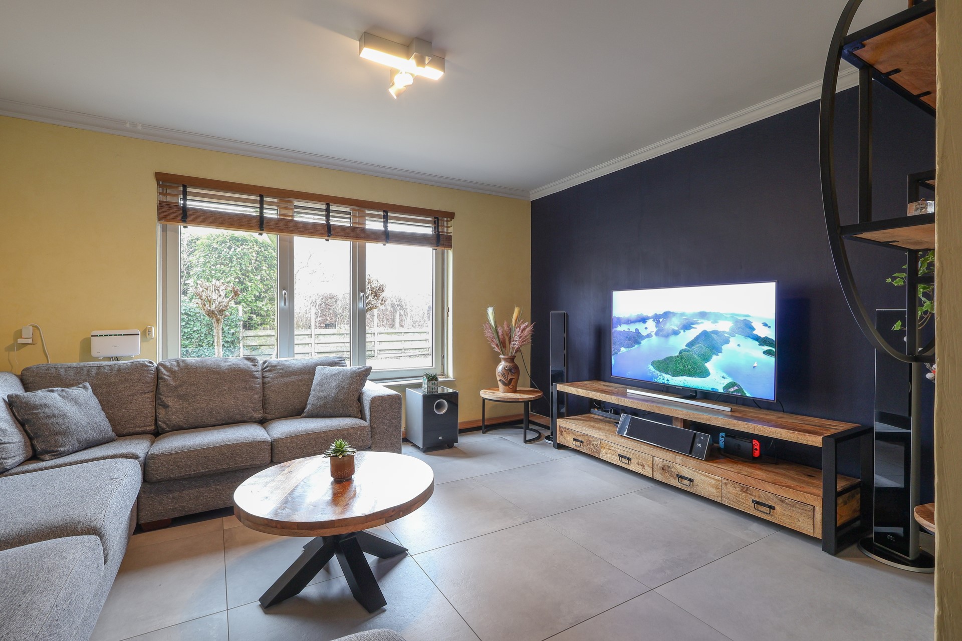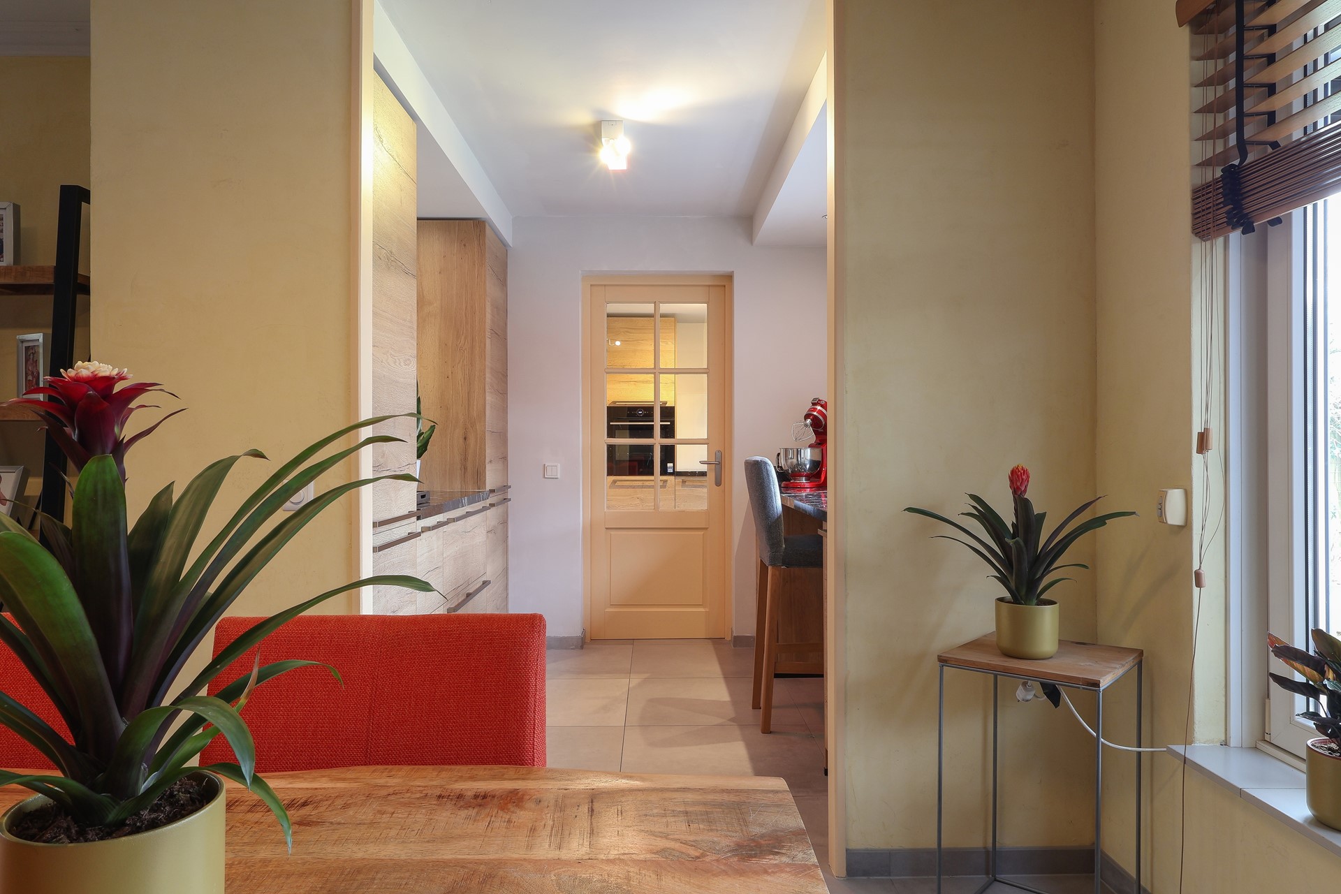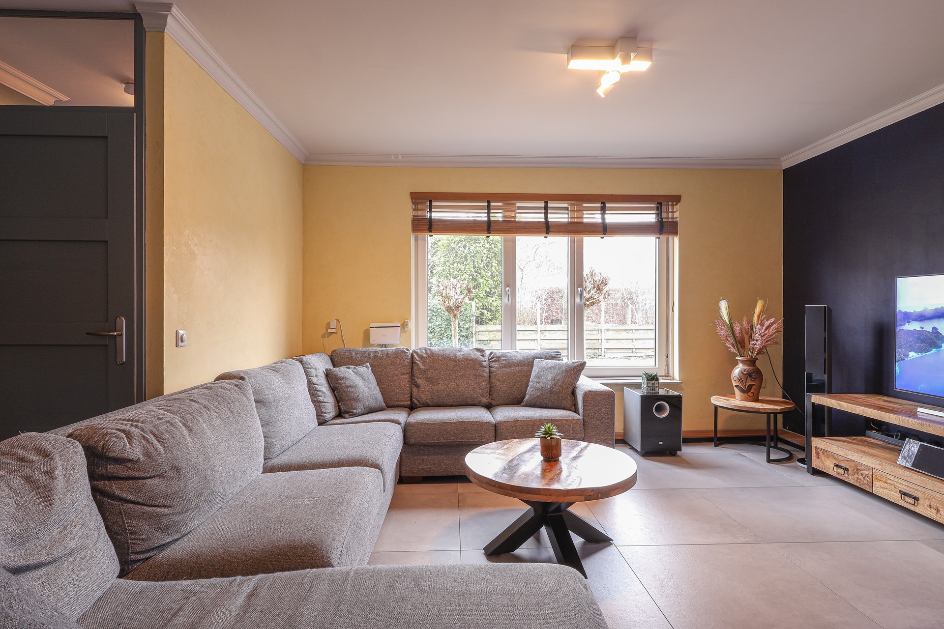 De begane grond is afgewerkt met een moderne tegelvloer met vloerverwarming, echte houten lamellen als binnen-zonwering.