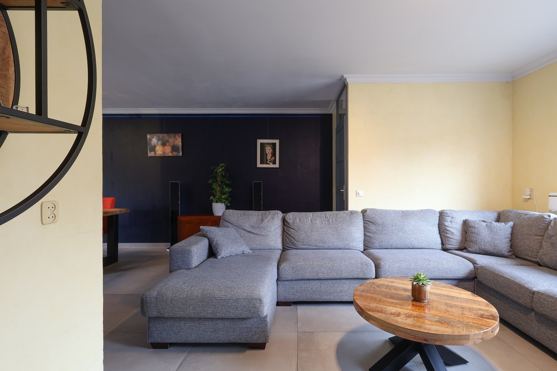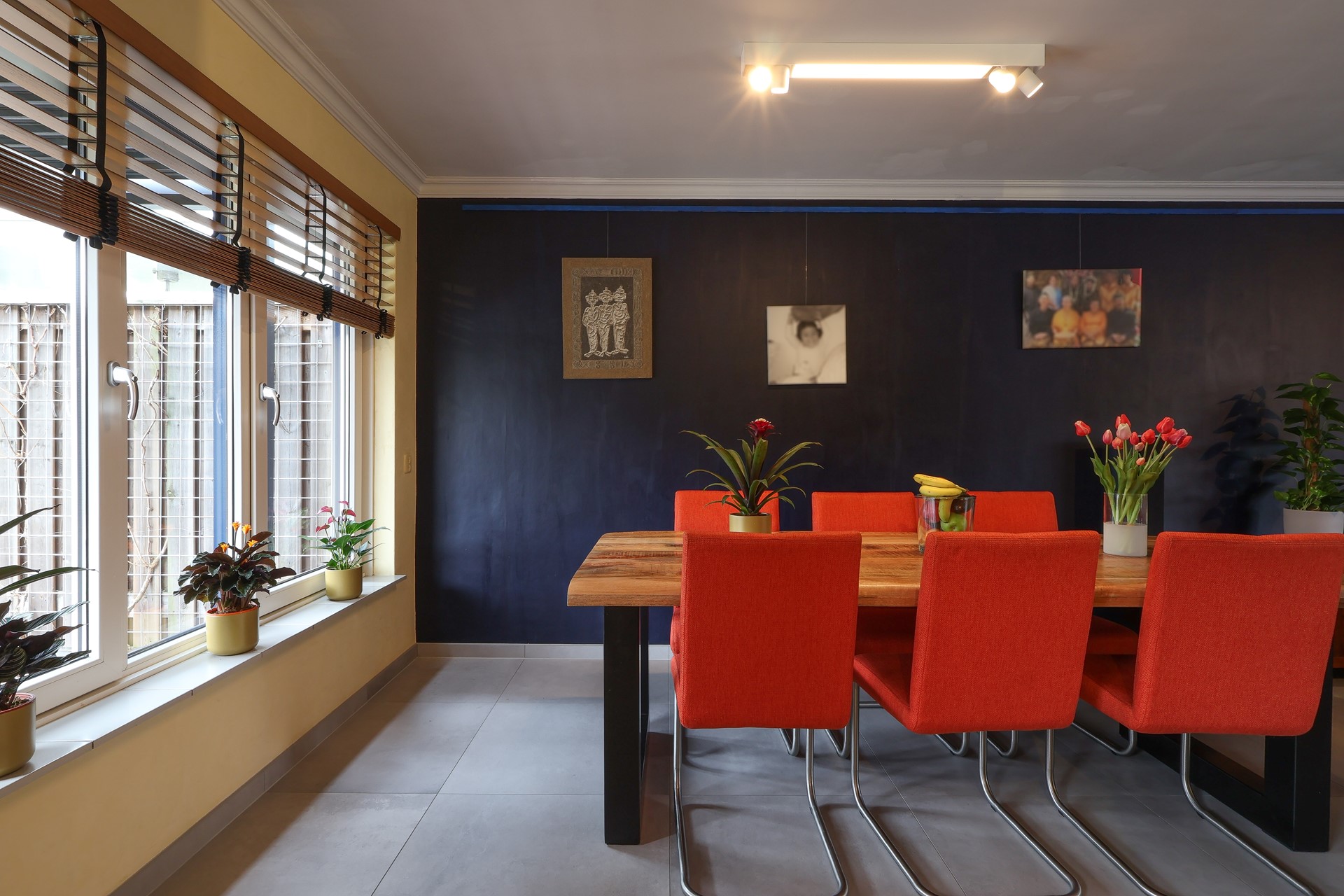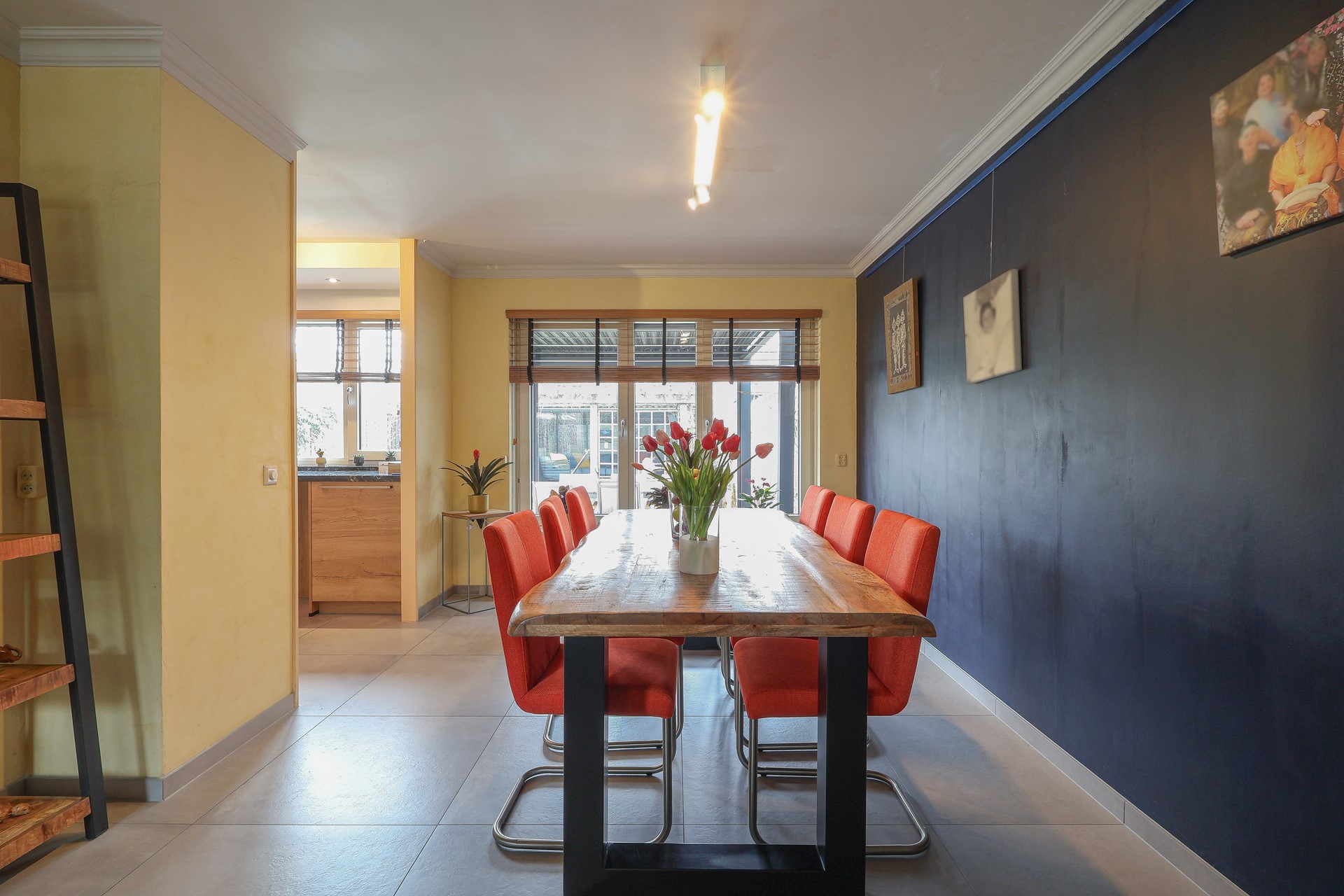 De begane grond is afgewerkt met een moderne tegelvloer met vloerverwarming, echte houten lamellen als binnen-zonwering.