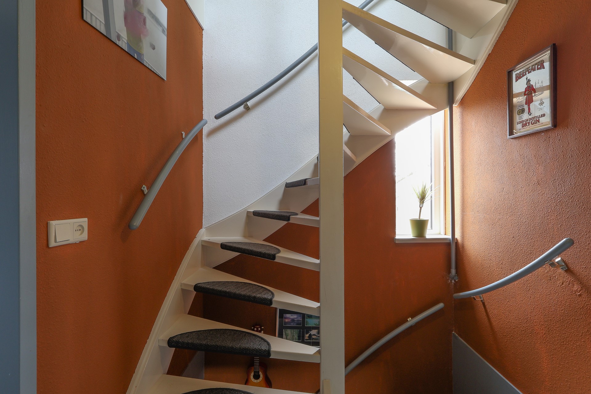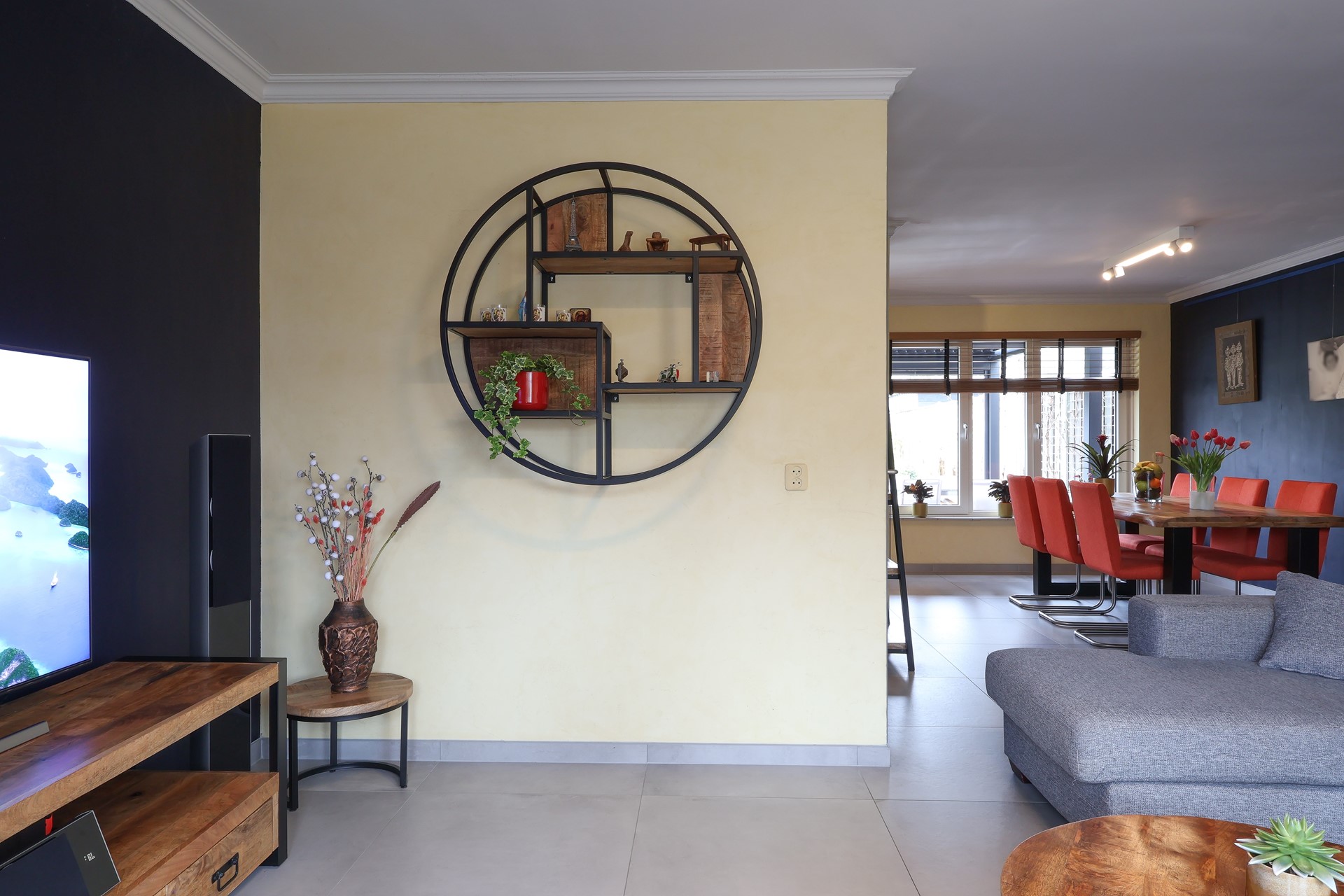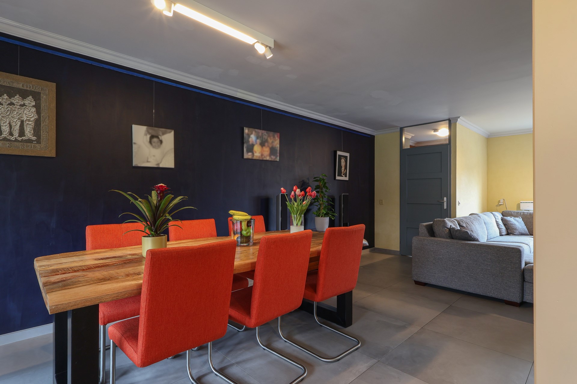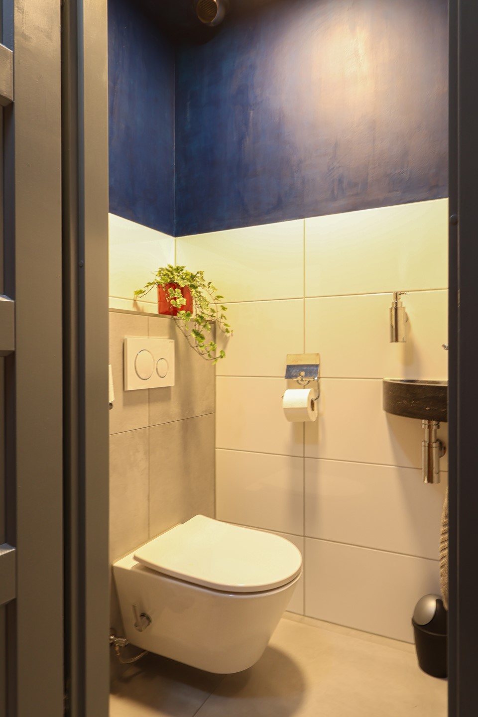 De begane grond is afgewerkt met een moderne tegelvloer met vloerverwarming, echte houten lamellen als binnen-zonwering.