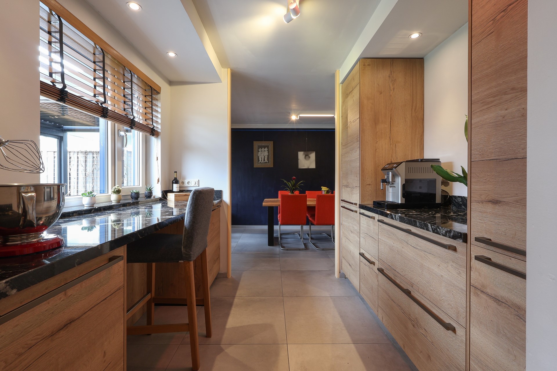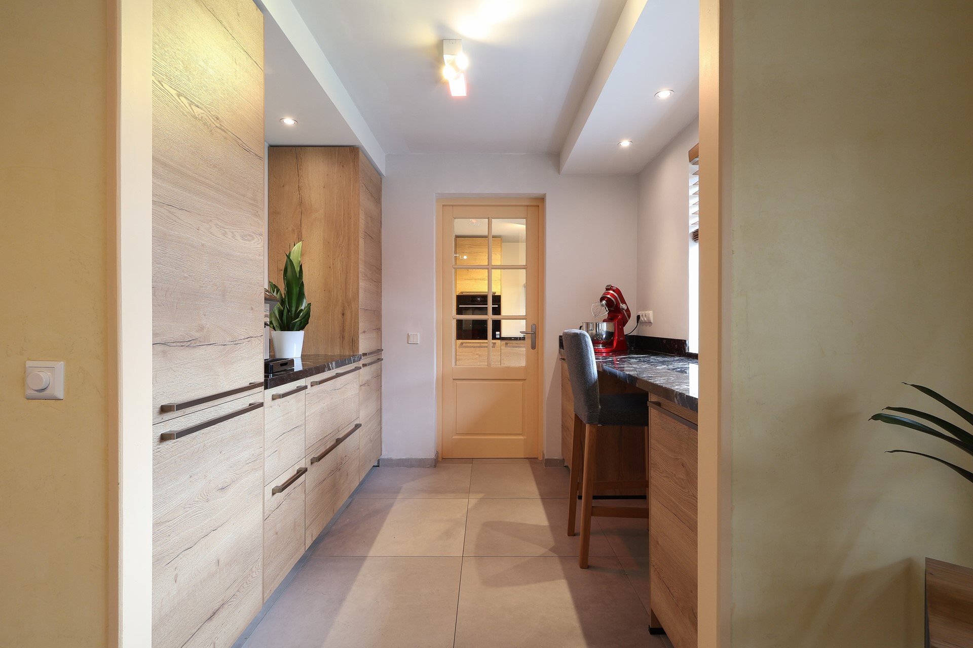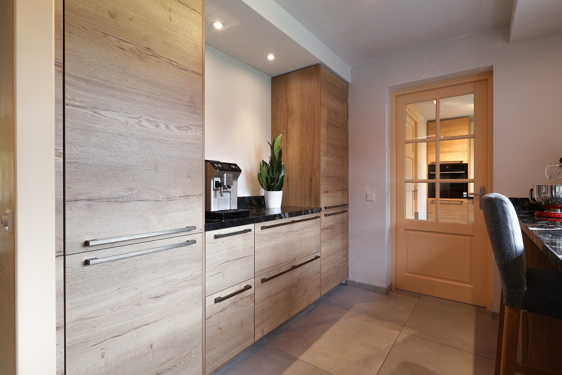 In de aanbouw de tweede keukenruimte-hoofdkeuken (2024), met o.a. een flexibele inductiekookplaat, een smart-oven en vaatwasser. In dit deel van de keuken de achterom en deur naar de ruime inpandige garage met witgoedaansluitingen en sectionaal garagedeur.