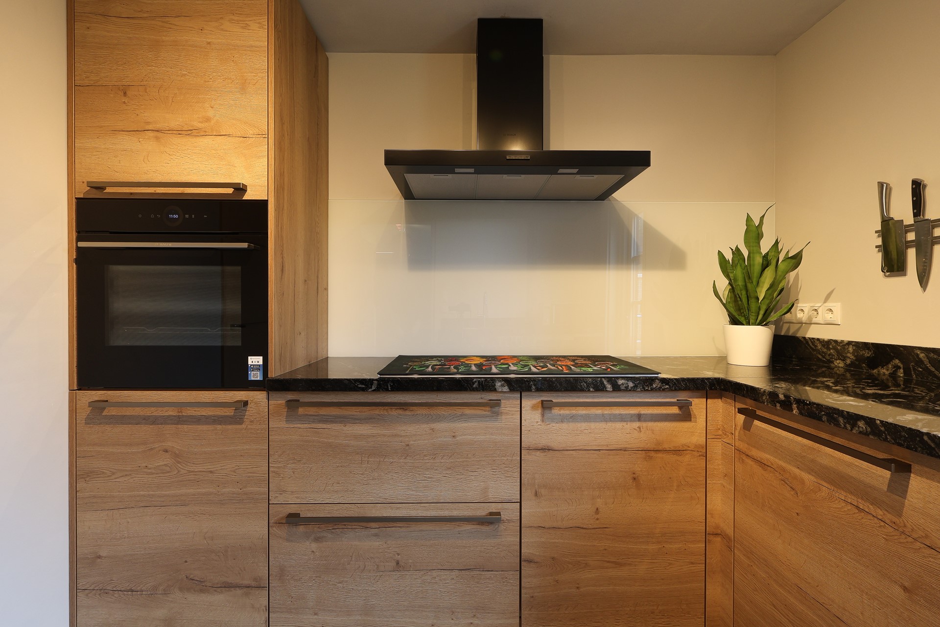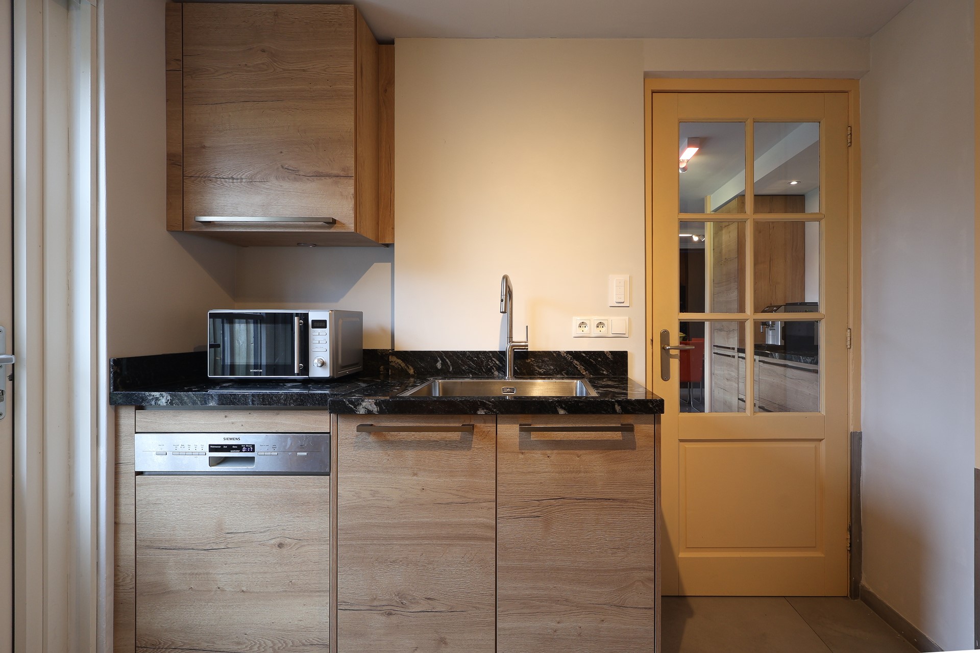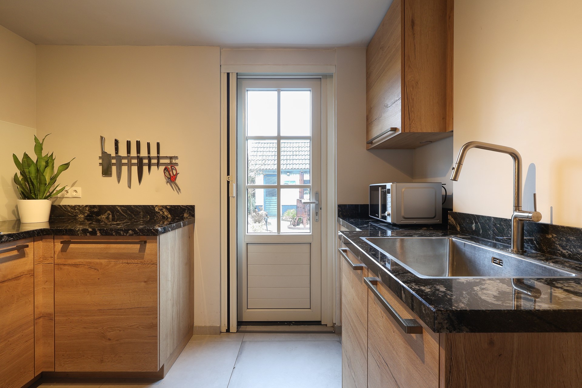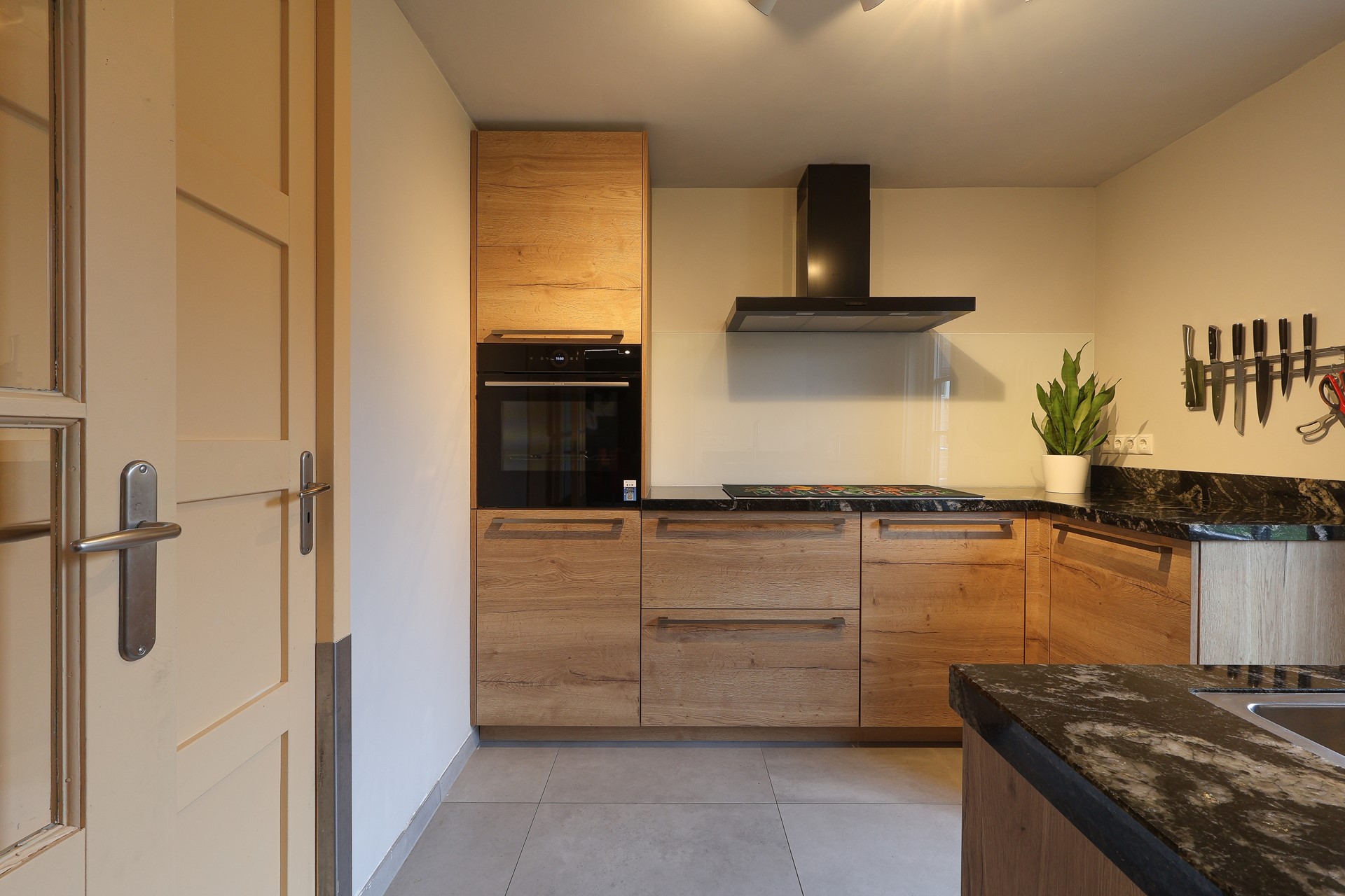 In de aanbouw de tweede keukenruimte-hoofdkeuken (2024), met o.a. een flexibele inductiekookplaat, een smart-oven en vaatwasser. In dit deel van de keuken de achterom en deur naar de ruime inpandige garage met witgoedaansluitingen en sectionaal garagedeur.