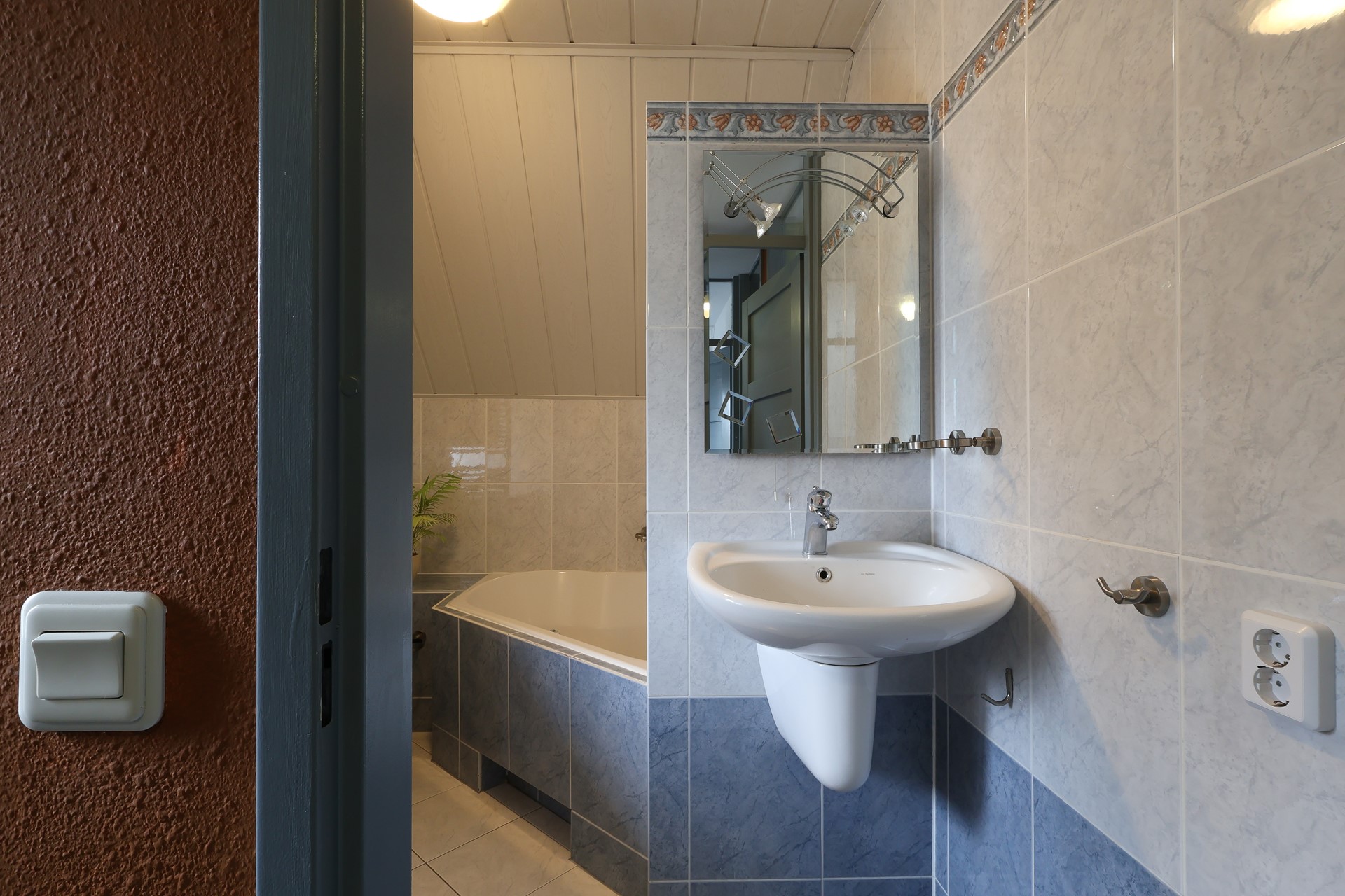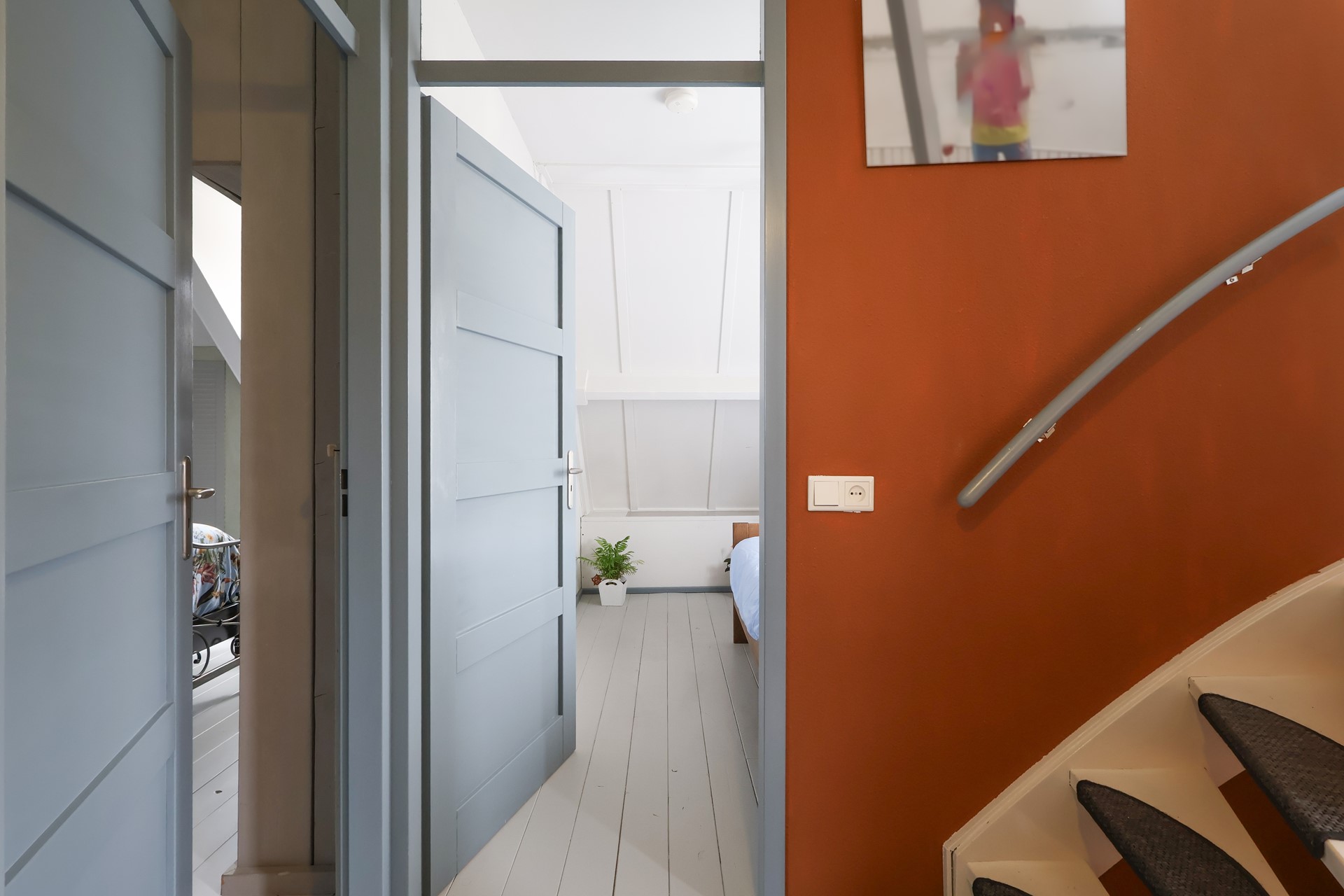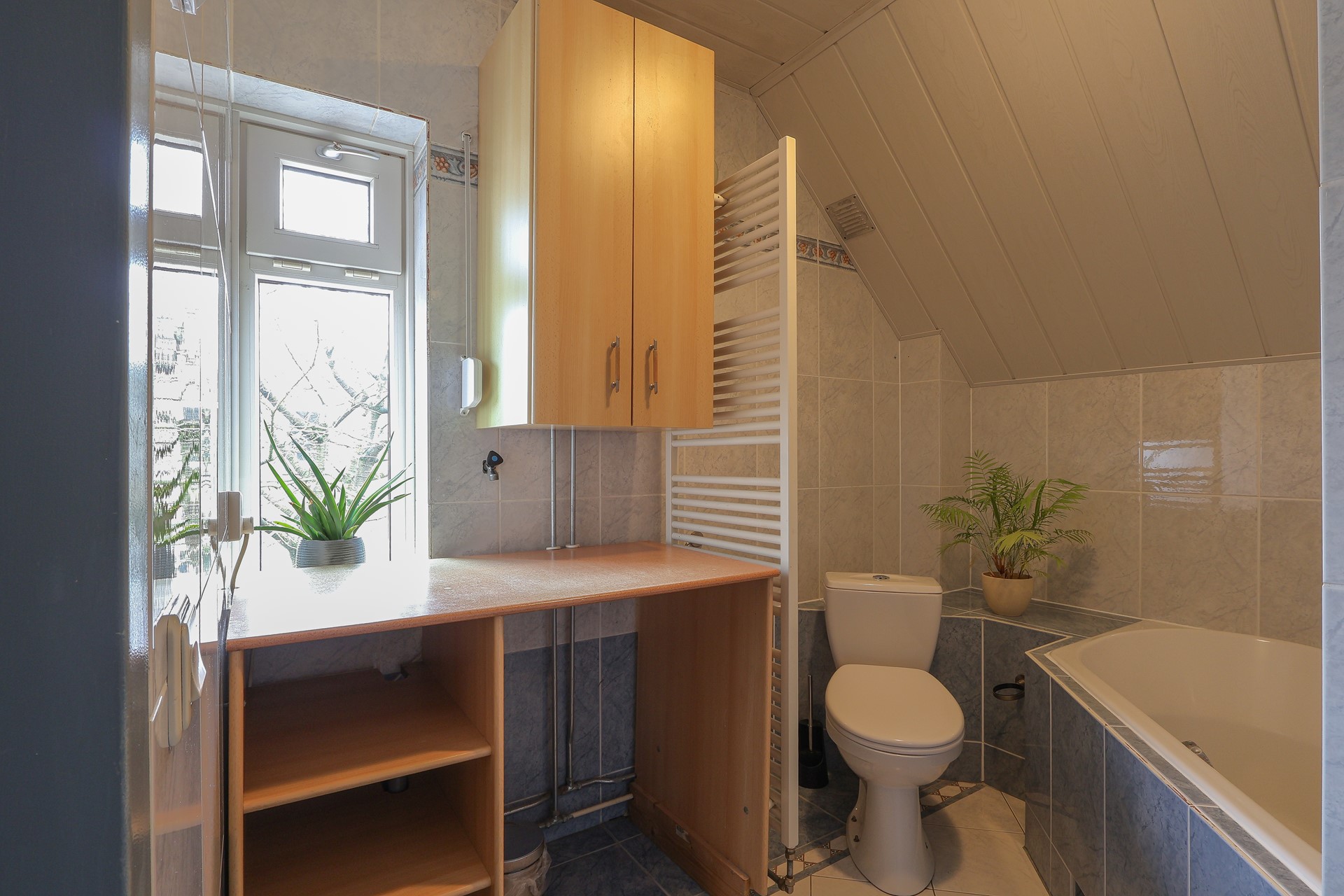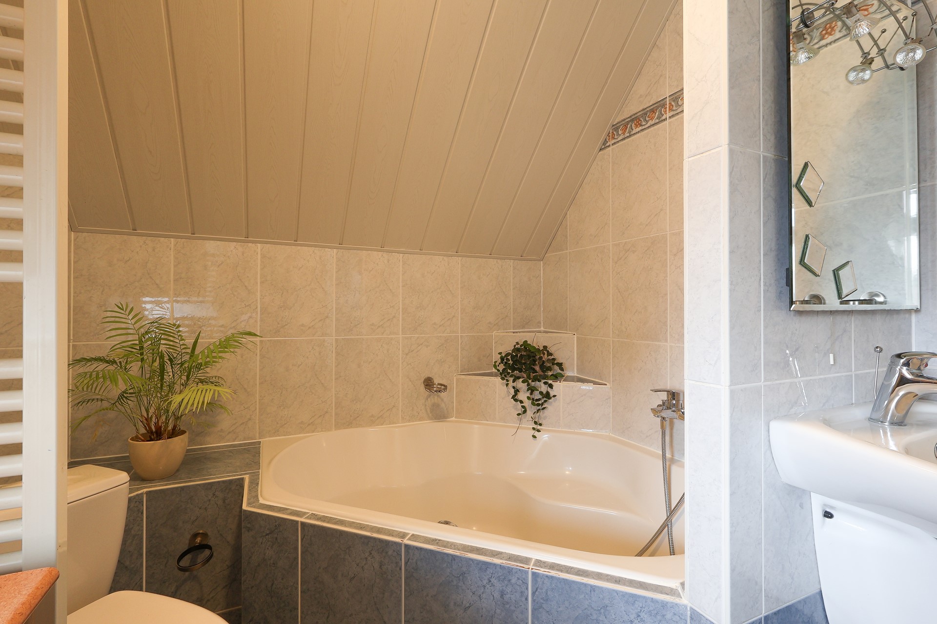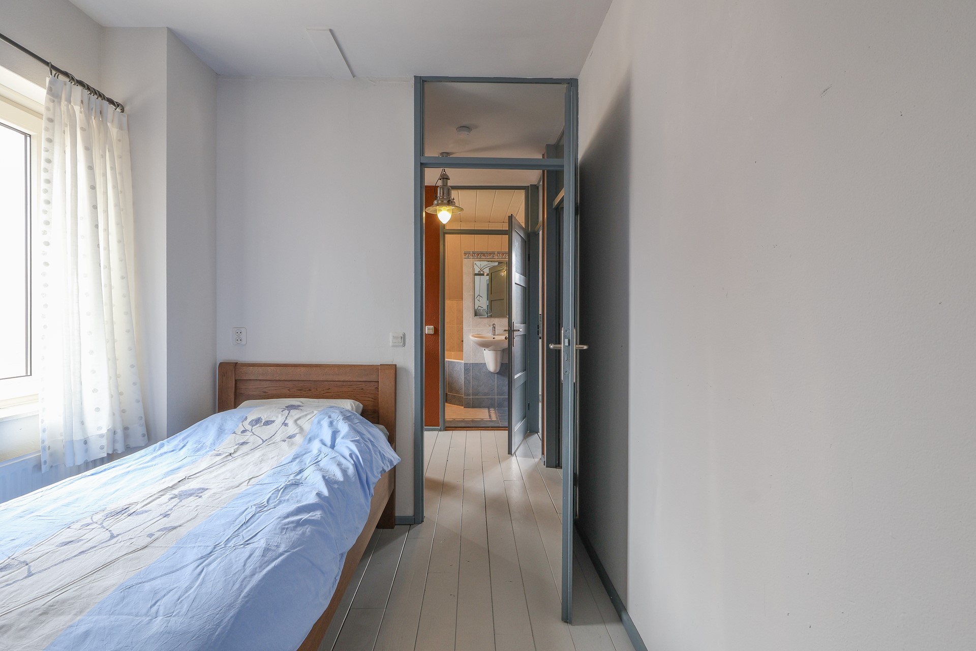 Ruime en lichte overloop met drie slaapkamers, waarvan de ouderslaapkamer is voorzien van lambrisering en een royaal wandmeubel. De badkamer beschikt over een wastafel, toilet, ruim hoekbad, designradiator en wasmachineopstelling. De slaapkamers en overloop zijn afgewerkt met een grenen houten vloer.