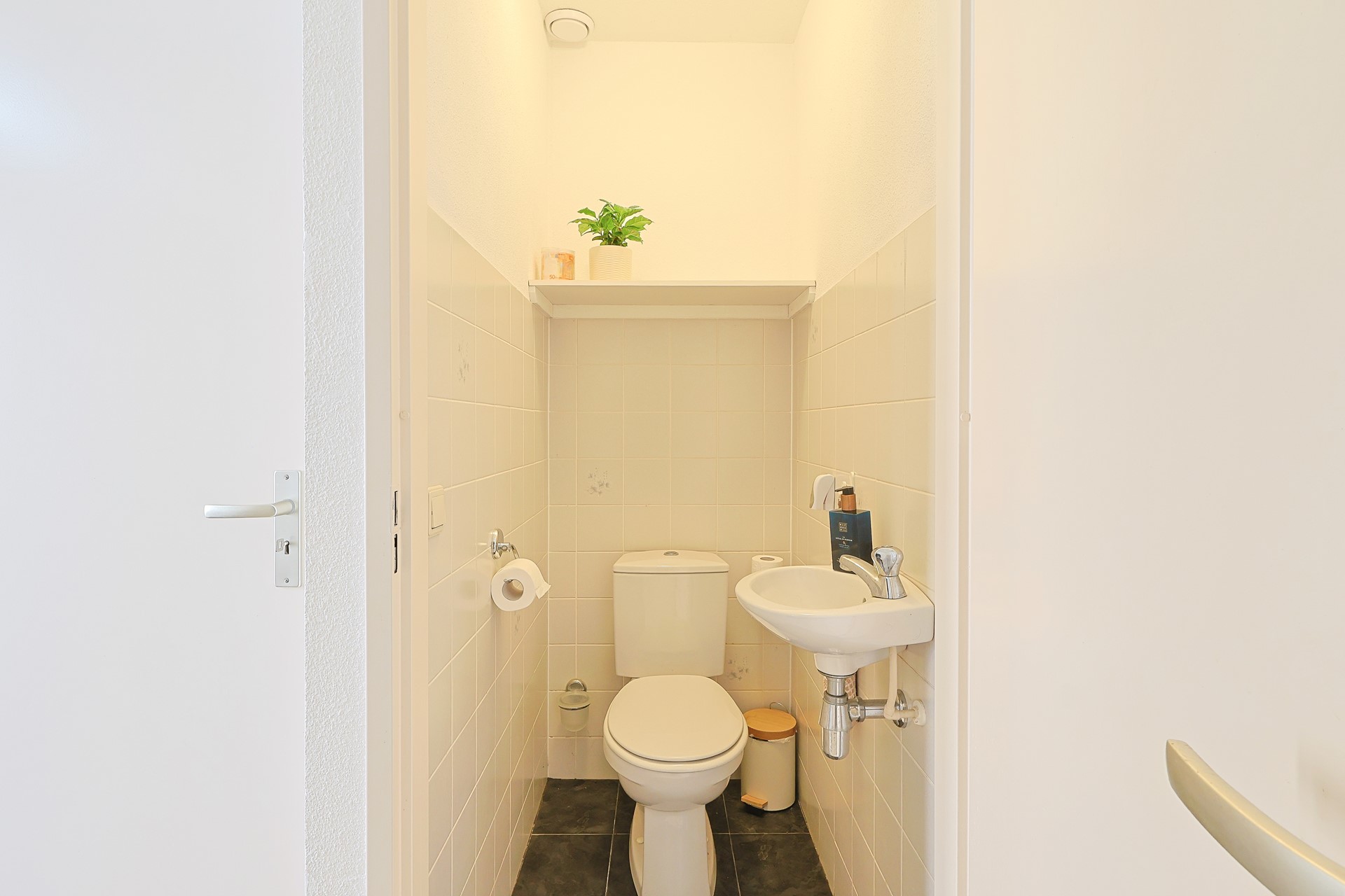 Entree, hal met opgaande trap, trapkast, toiletruimte en meterkast. Ruime lichte woonkamer met een stijlvolle erker. Aansluitend een semi-dichte keuken met splinternieuw keukenmeubel (2026) inclusief nieuwe inbouwapparatuur (vaatwasser, recirculatie afzuigkap, oven, koel vries combinatie, inductiekookplaat). Naast de keuken bevindt zich een moderne badkamer (2015) met hangcloset, inloopdouche en designradiator. Via de grote pui met loopdeur bereikt u vanuit de keuken het overdekte terras in de achtertuin. De hele begane grond is in 2015 afgewerkt met strak gestucte wanden en met een mooie tegelvloer met vloerverwarming (in afzonderlijke compartimenten aan of uit te zetten).