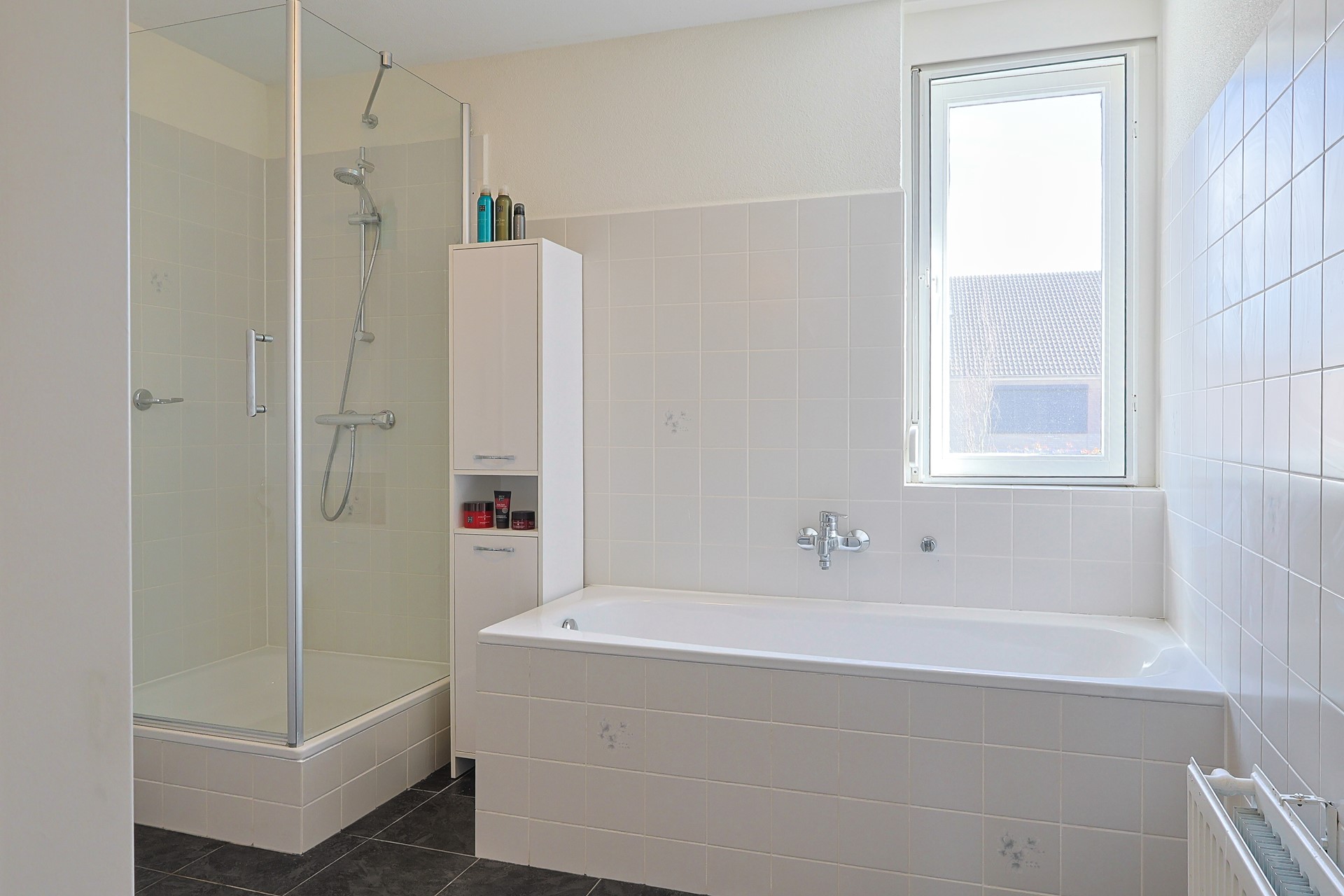 Ruime overloop met een praktische nis, ideaal voor bijvoorbeeld het opbergen van kleding en schoenen (inloop kledingkast). De overloop geeft toegang tot een tweetal slaapkamers en de tweede badkamer. Slaapkamer 1 is een riante ouderslaapkamer aan de voorzijde van de woning (ca. 23 m²) waarvan eventueel ook makkelijk weer 2 slaapkamers te maken zijn (zoals het oorspronkelijk ook was). Aan de achterzijde bevindt zich slaapkamer 2: een ruime slaapkamer met rolluik. Beide slaapkamers zijn voorzien van gestucte wanden. Grote tweede badkamer voorzien van ligbad, aparte douche, toilet, wastafel en een te openen raam met rolluik. Alle ramen op de 1e verdieping zijn voorzien van afneembare hor-ramen