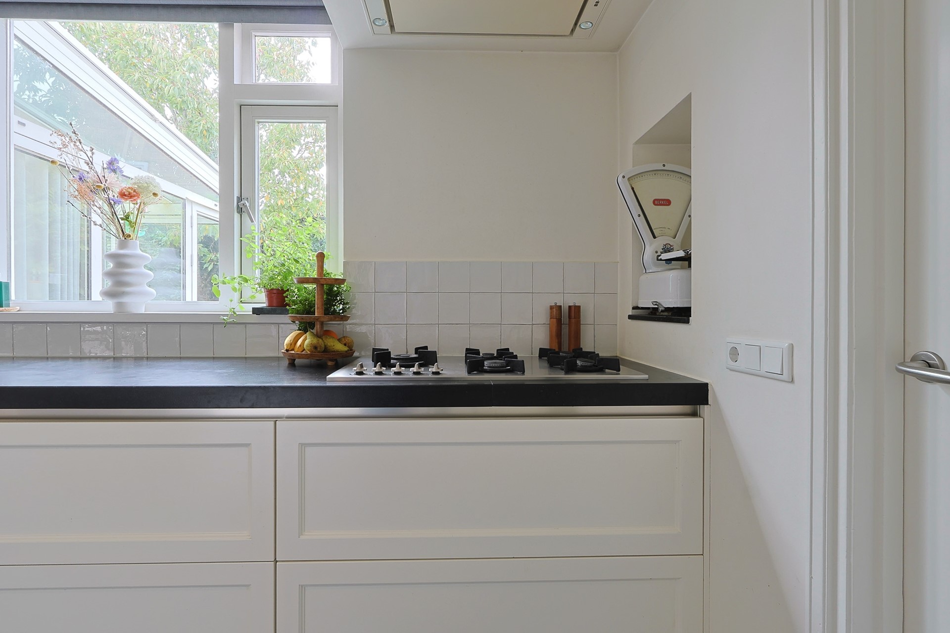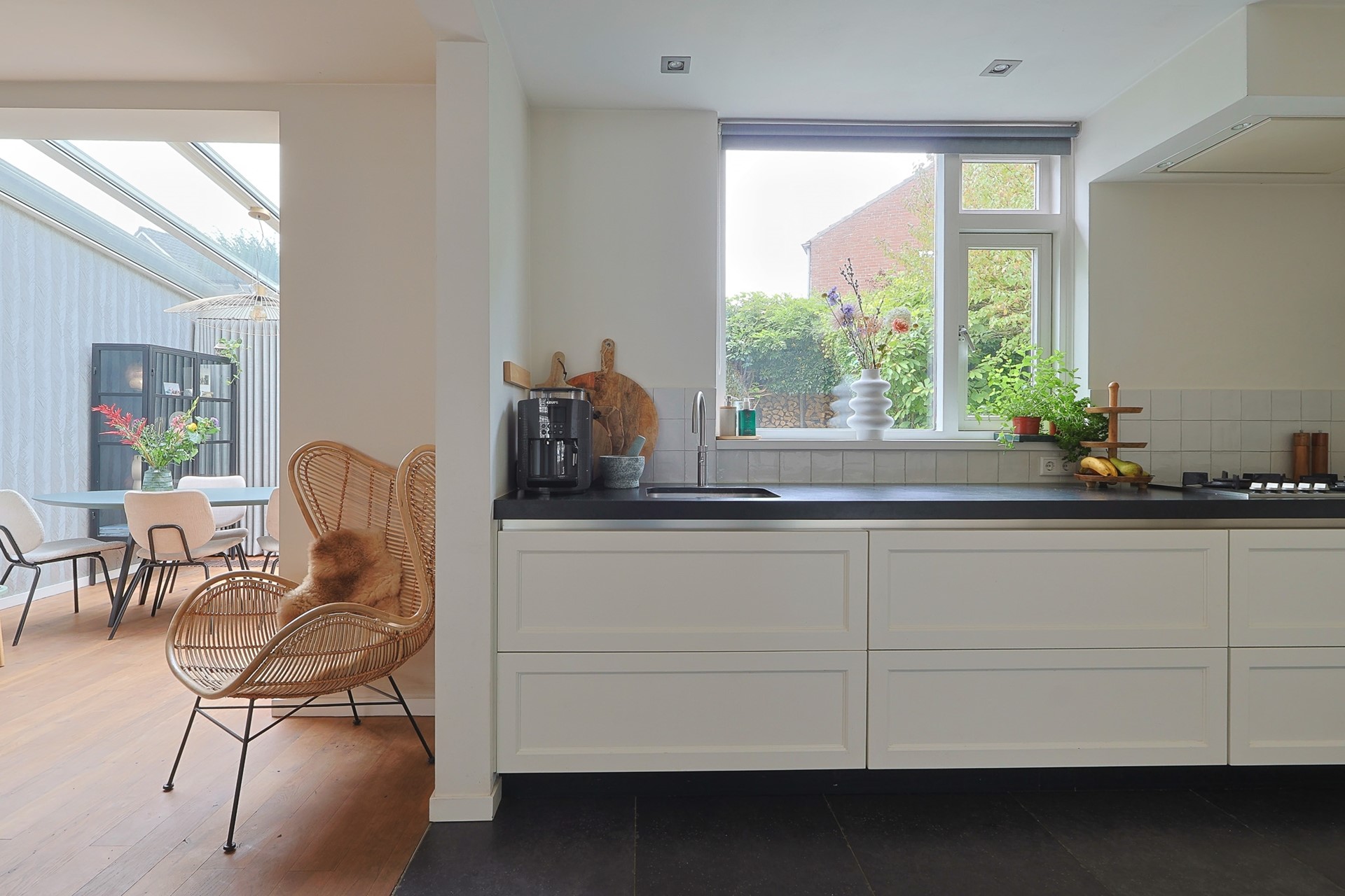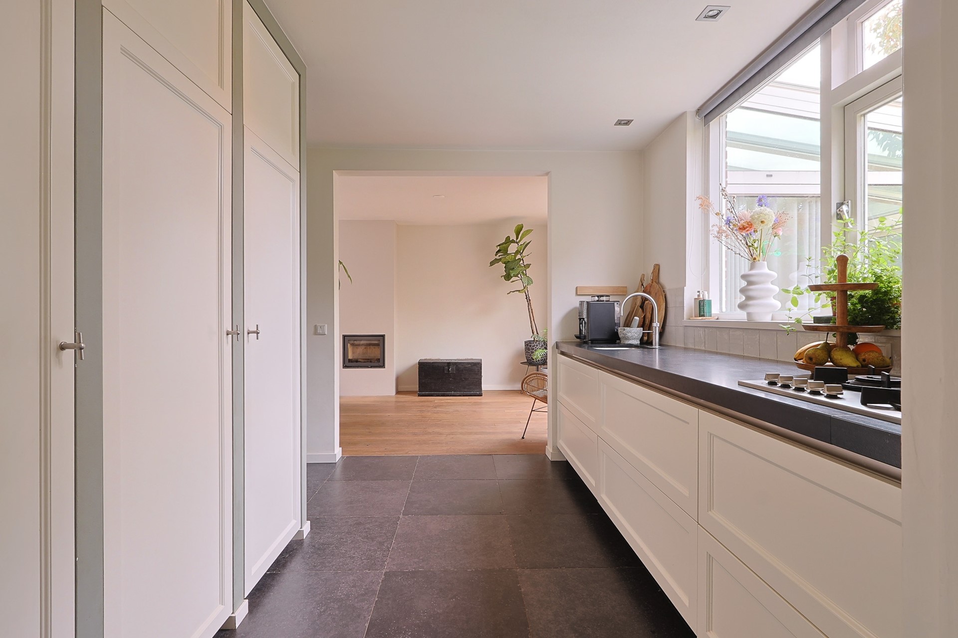 Je betreedt de woning via een nette hal met toiletruimte, vernieuwde meterkast en trapopgang. Vanuit hier loop je door naar de luxe keuken met natuurstenen werkblad, karakteristiek wandmeubel, diverse inbouwapparatuur en een royale wijnkelder. De praktische bijkeuken met haar grote wandkast biedt volop opbergruimte, aansluitingen voor witgoed én toegang tot de tuin. Terug naar de keuken die “geruisloos” overgaat in de sfeervolle en ruime woonkamer met massief eikenvloer, inbouw-houtkachel en doorloop naar de geweldige serre met schuifpui naar de tuin. Dankzij de serre en grote raampartijen geniet je van veel natuurlijk licht