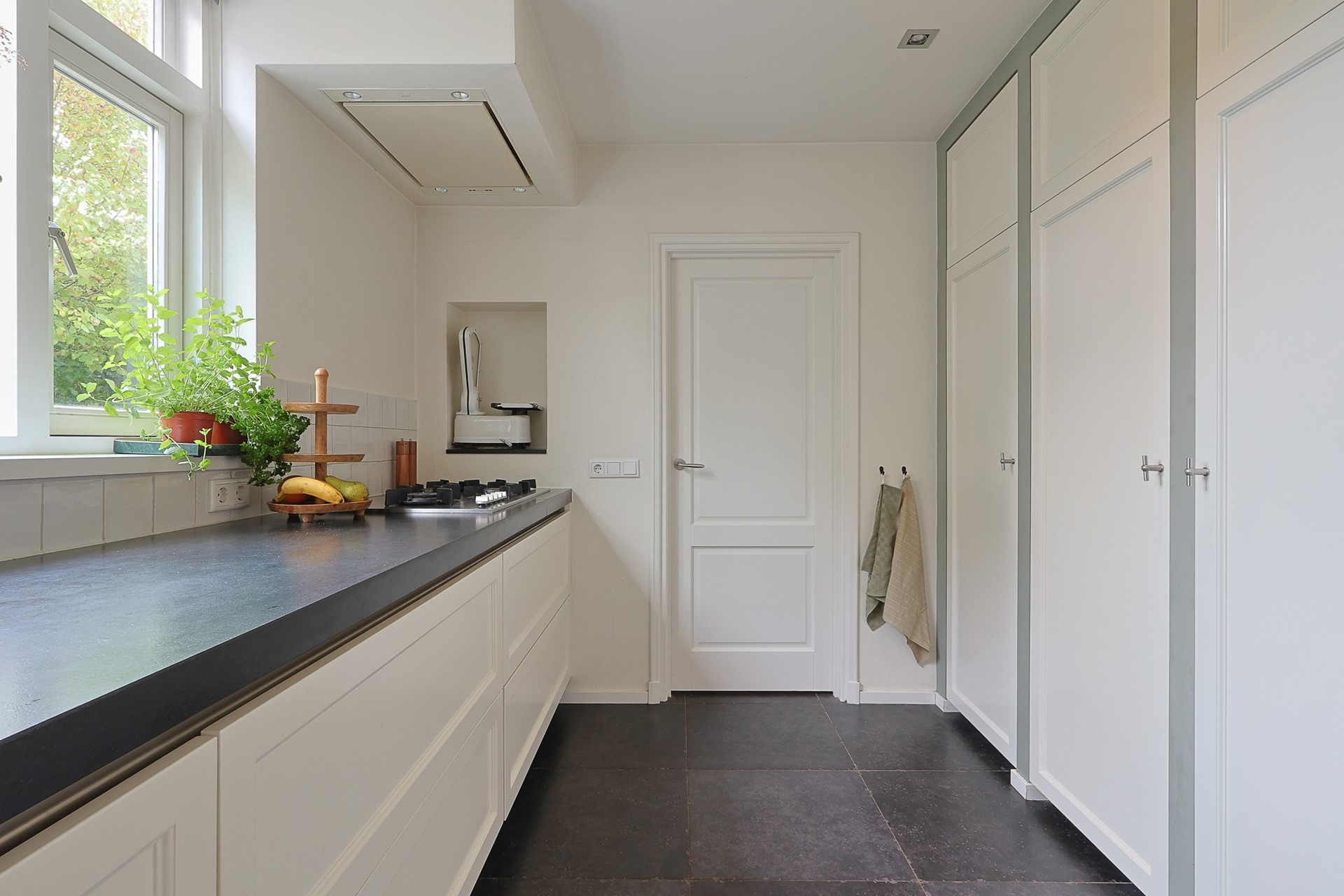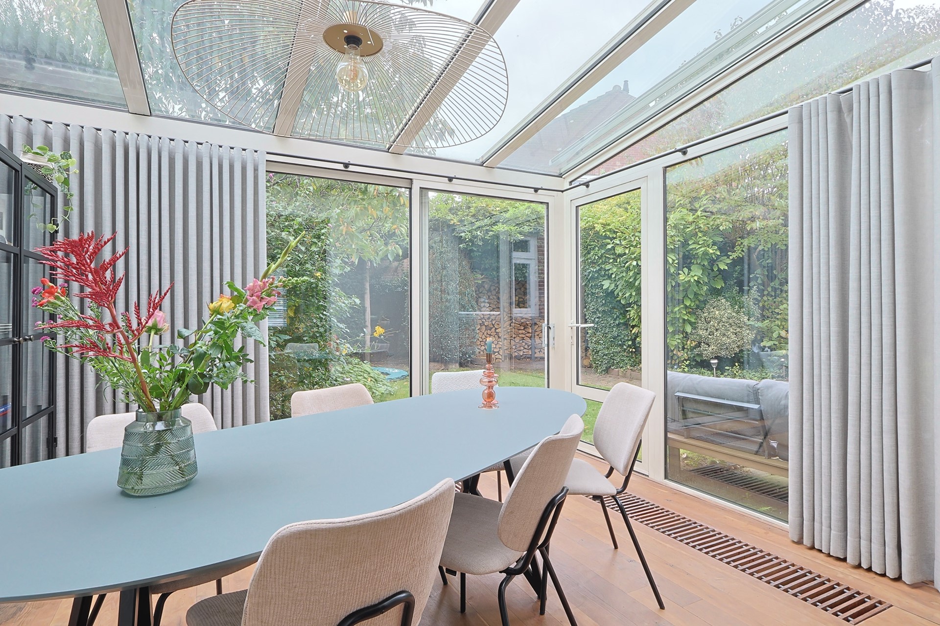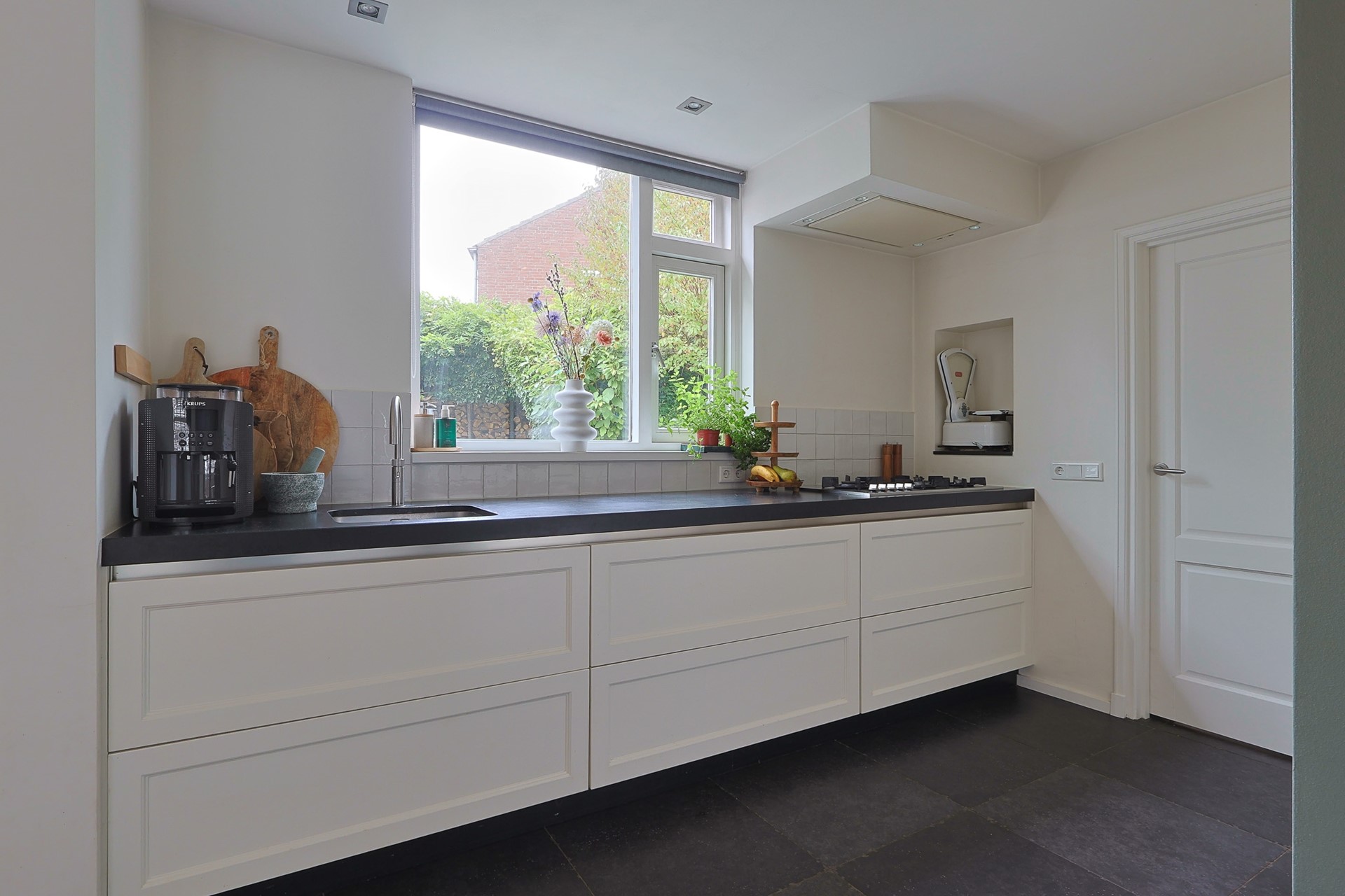 Je betreedt de woning via een nette hal met toiletruimte, vernieuwde meterkast en trapopgang. Vanuit hier loop je door naar de luxe keuken met natuurstenen werkblad, karakteristiek wandmeubel, diverse inbouwapparatuur en een royale wijnkelder. De praktische bijkeuken met haar grote wandkast biedt volop opbergruimte, aansluitingen voor witgoed én toegang tot de tuin. Terug naar de keuken die “geruisloos” overgaat in de sfeervolle en ruime woonkamer met massief eikenvloer, inbouw-houtkachel en doorloop naar de geweldige serre met schuifpui naar de tuin. Dankzij de serre en grote raampartijen geniet je van veel natuurlijk licht