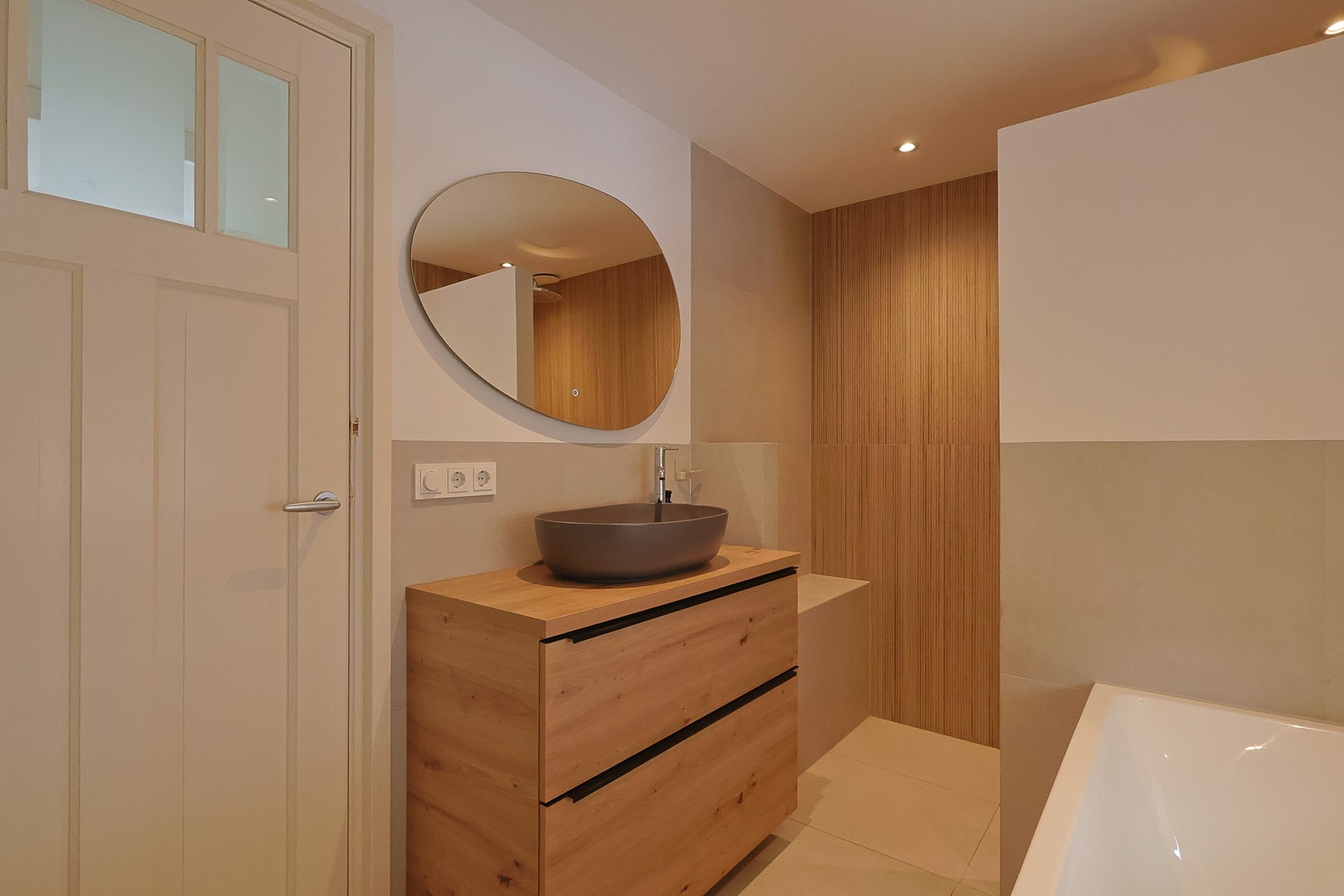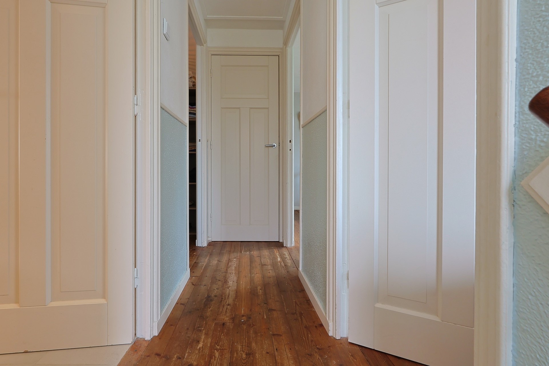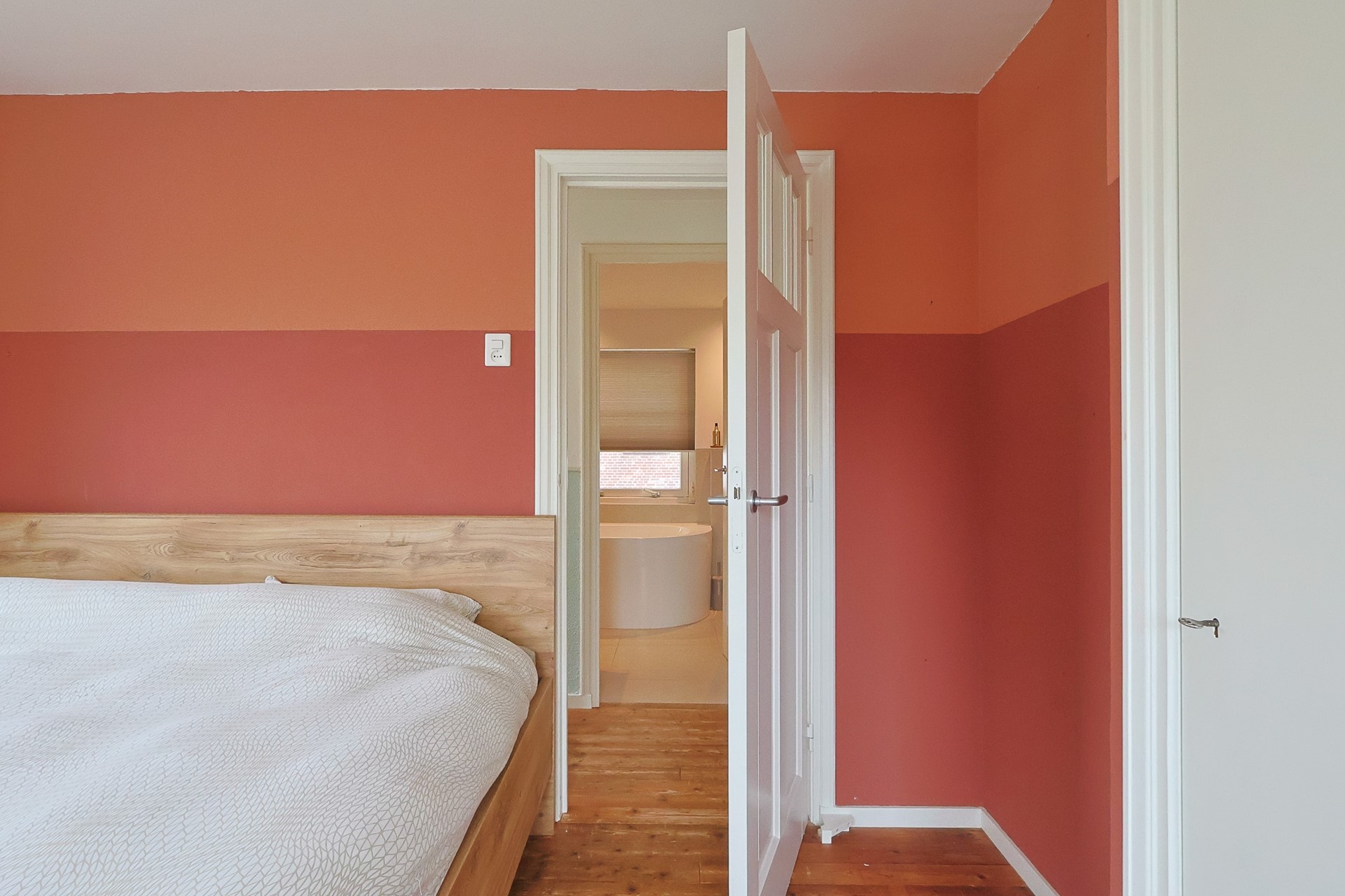 Op de eerste verdieping bevinden zich twee ruime slaapkamers, een kastenkamer (eventueel derde slaapkamer) en een moderne badkamer met hangcloset, ligbad, grote inloopdouche, wat bergruimte en wastafel met meubel. Vanuit de ouderkamer heeft u toegang tot een zonnig dakterras met houten vlonders. Onder andere de paneeldeuren en houten vloeren op geven de verdieping een warme, stijlvolle uitstraling.