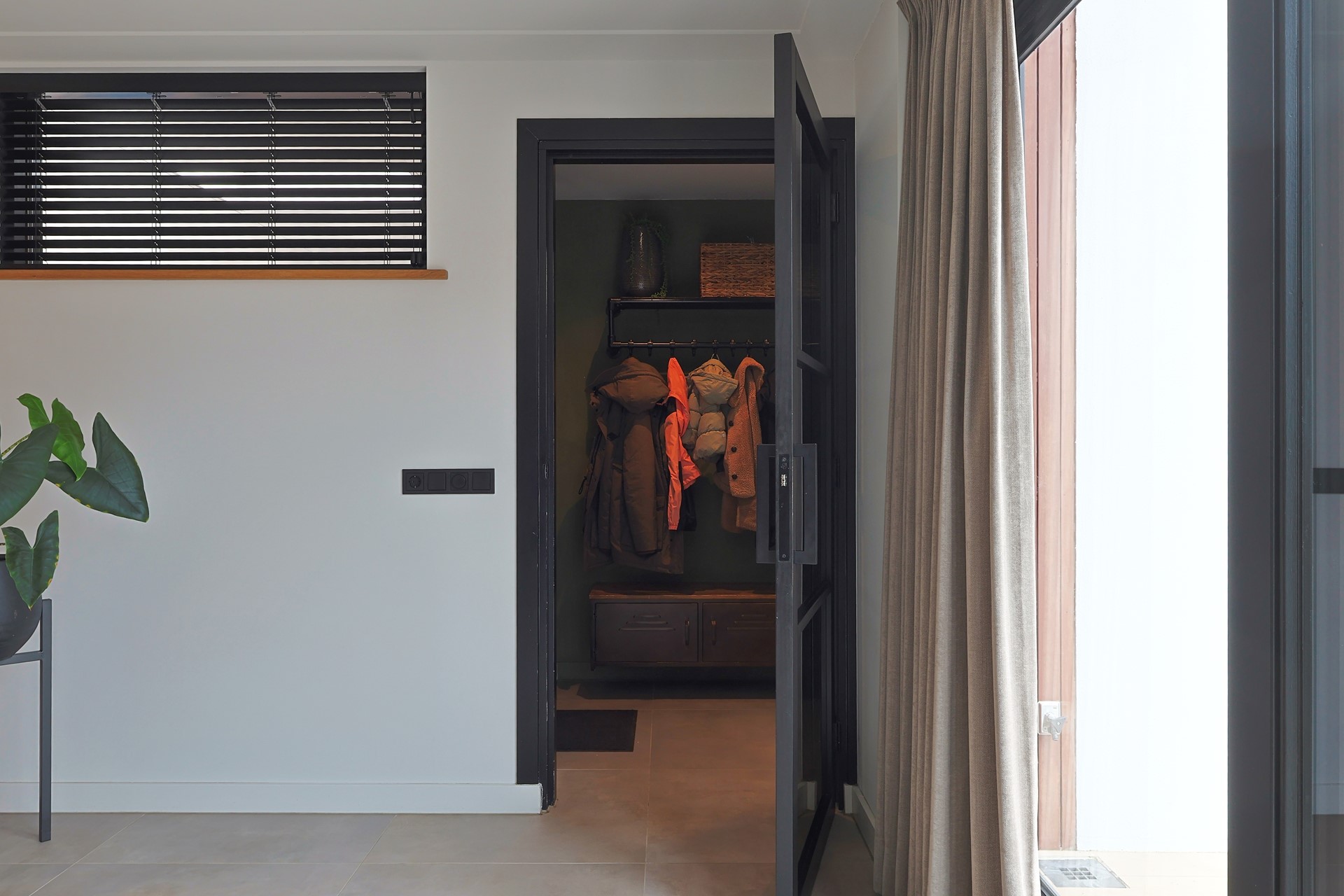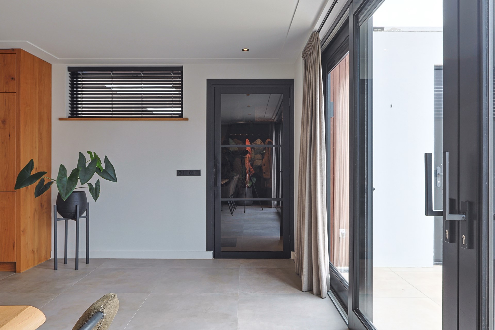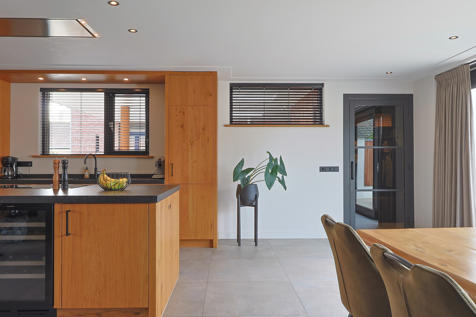 Entree/hal met meterkast, toilet en kelderkast. Glazen deur naar de royale en lichte woonkamer met open keuken en grote glazen pui met schuifdeuren naar de tuin. De luxe keuken met wandmeubel en kookeiland is voorzien van een inductiefornuis met heteluchtoven, grill en warmhoudlade, Quooker, koel-vriescombinatie, vaatwasser, magnetron en wijnklimaatkast. Aan de straatzijde een ruime zithoek, aan de tuinzijde de eethoek. In het midden van de woonkamer de open trap. Via een glazen deur bereik je het portaal in de aanbouw als eerste achterom met garderobe en doorgang naar de ruime berging met kasten. In deze berging een tweede deur als tweede achterom direct naar de carport en een derde deur naar de achtertuin.
