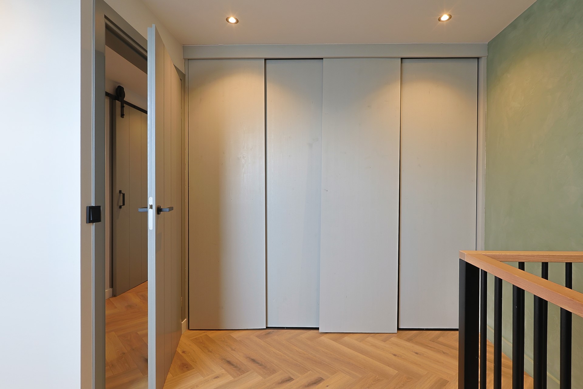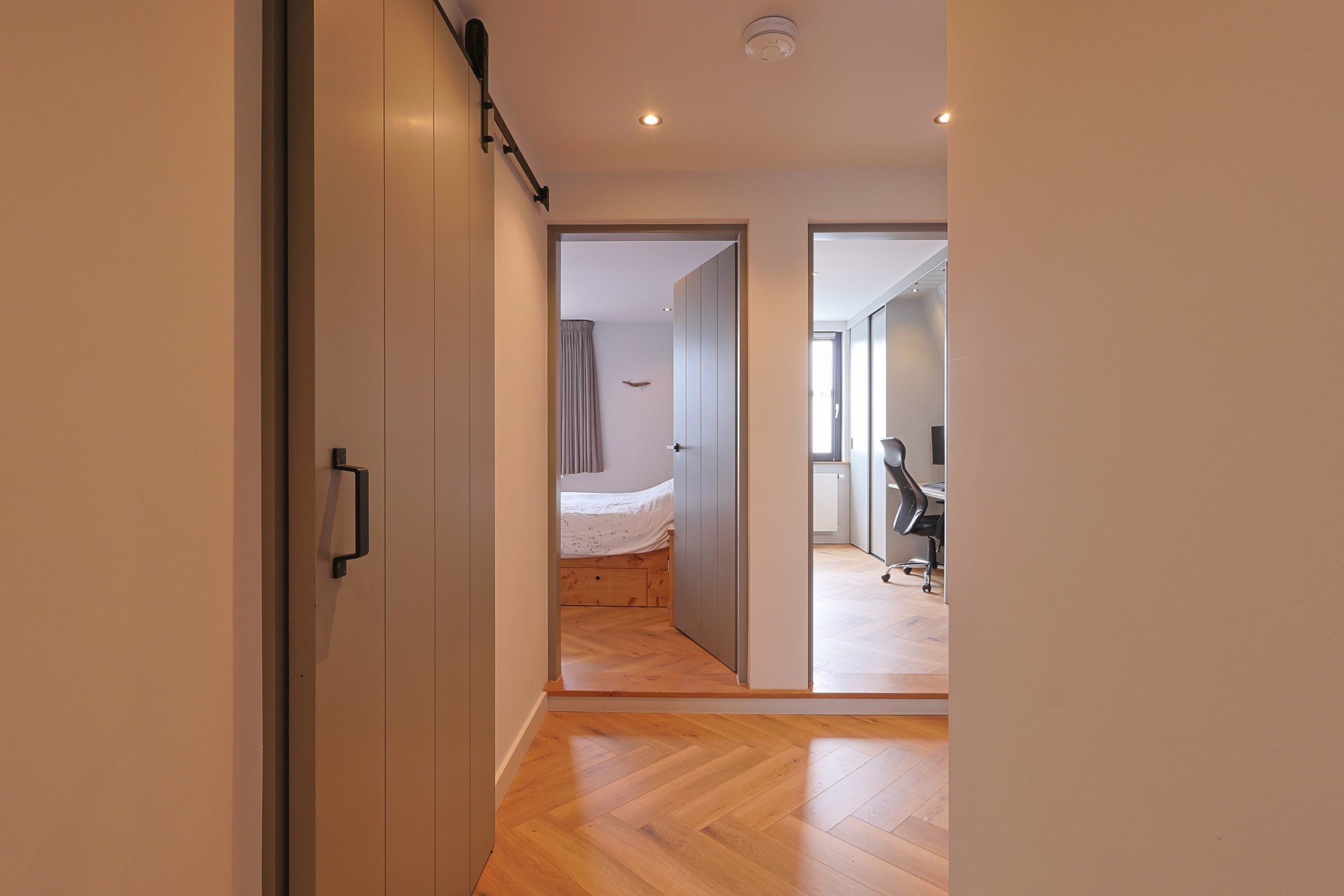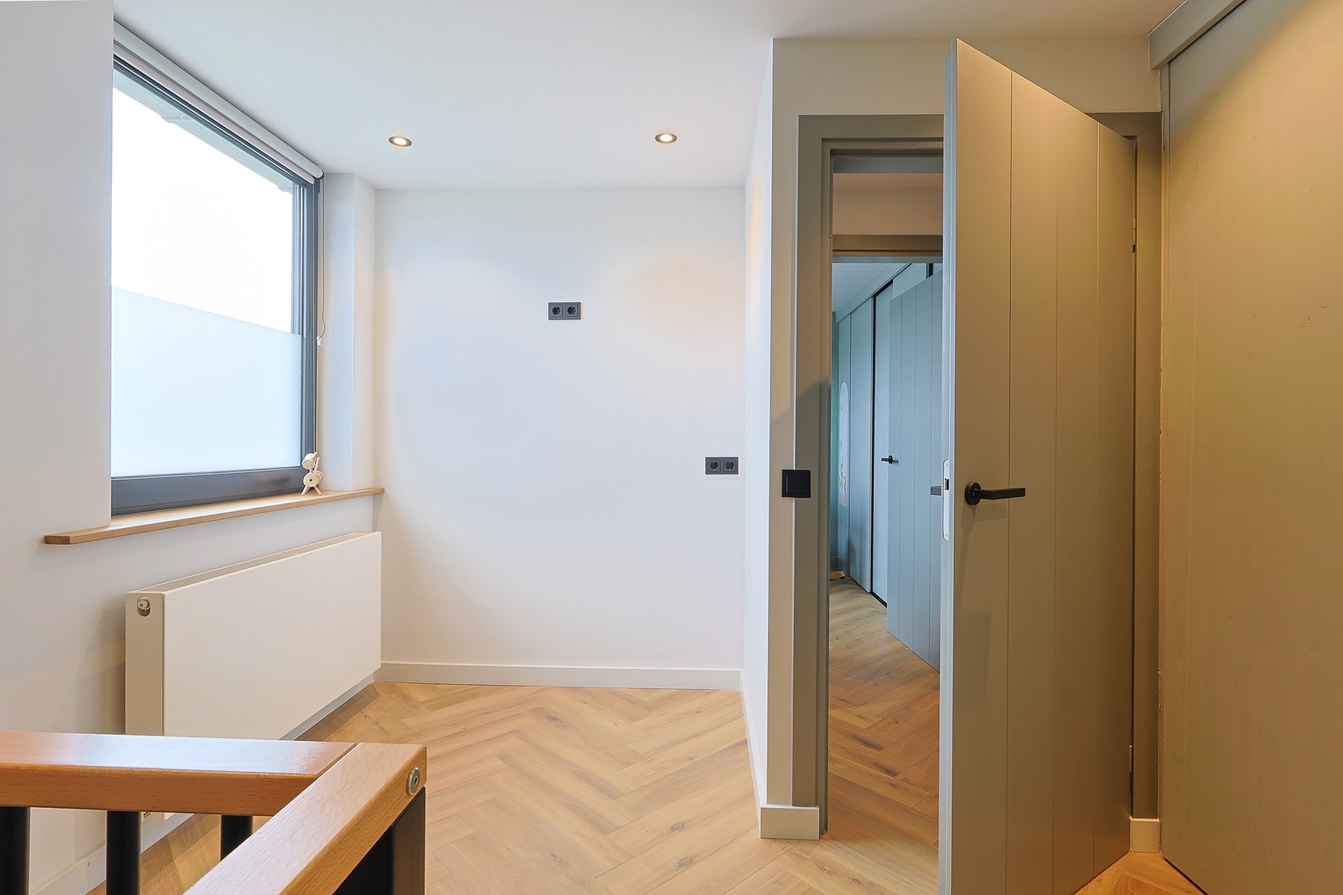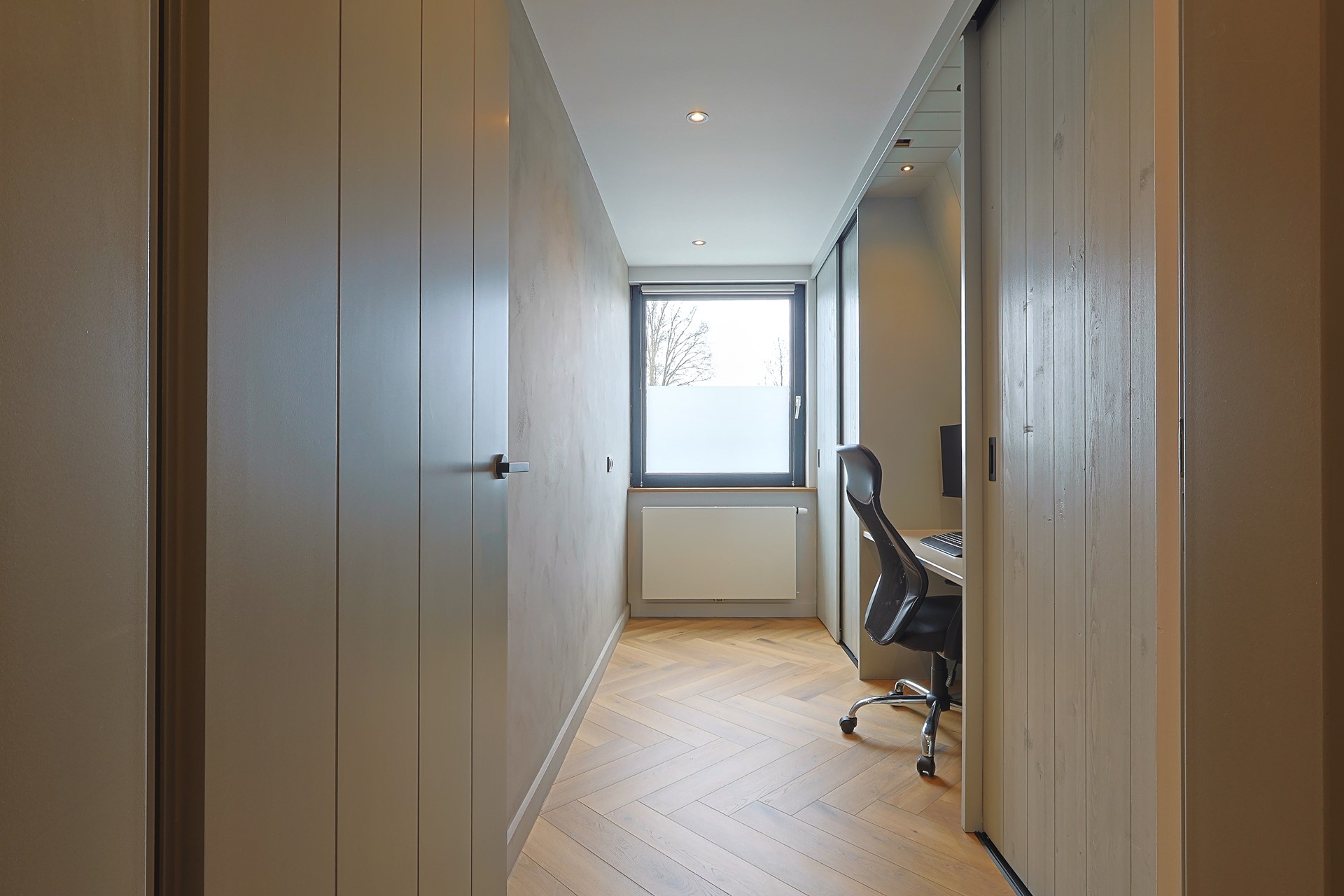 Overloop met toegang tot vier slaapkamers, waarvan één in gebruik als werk-/studeerkamer. Alle kamers zijn strak afgewerkt en voorzien van een laminaatvloer en vaste kasten. Moderne badkamer met ligbad, douchecabine, toilet, wastafelmeubel en elektrische vloerverwarming.