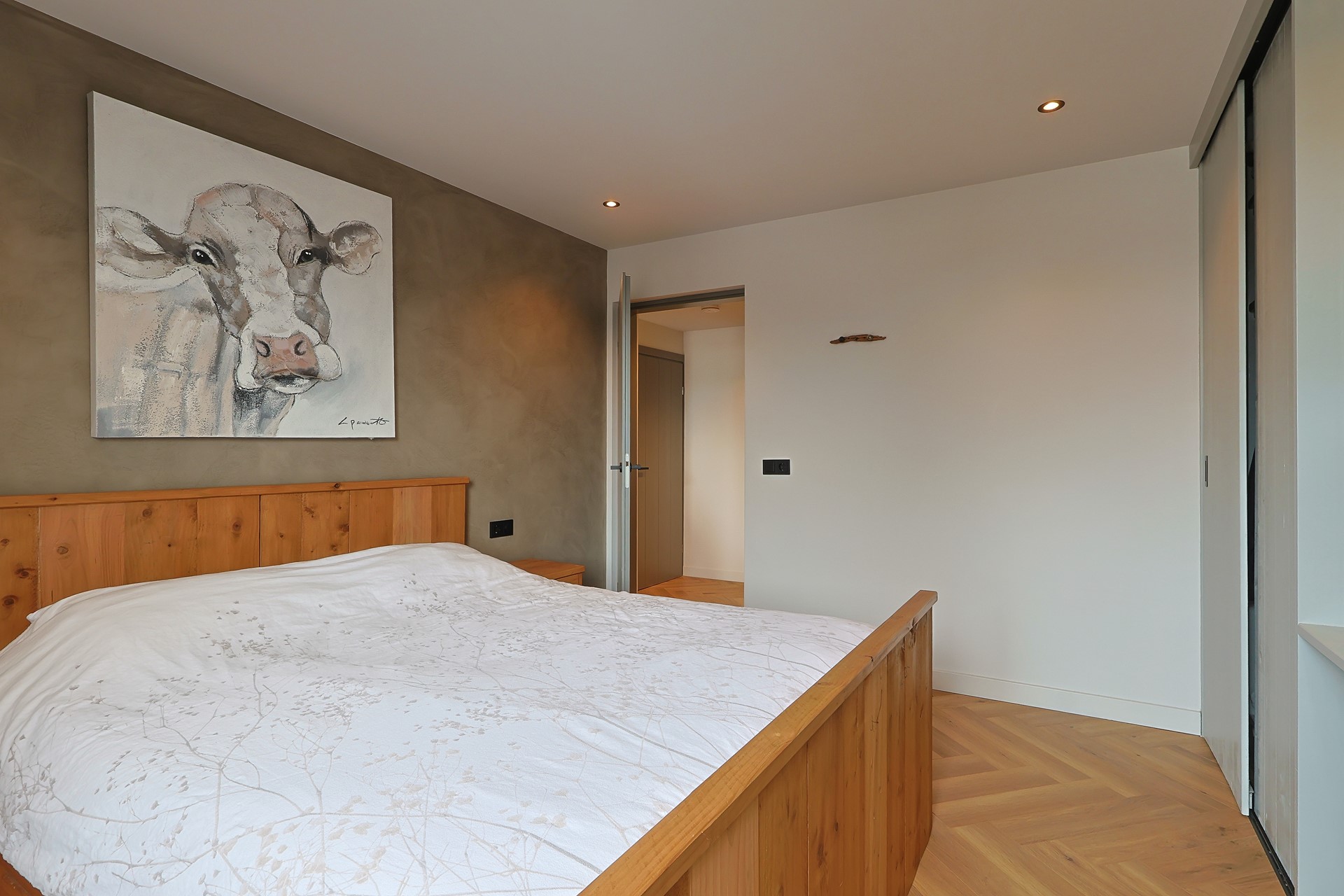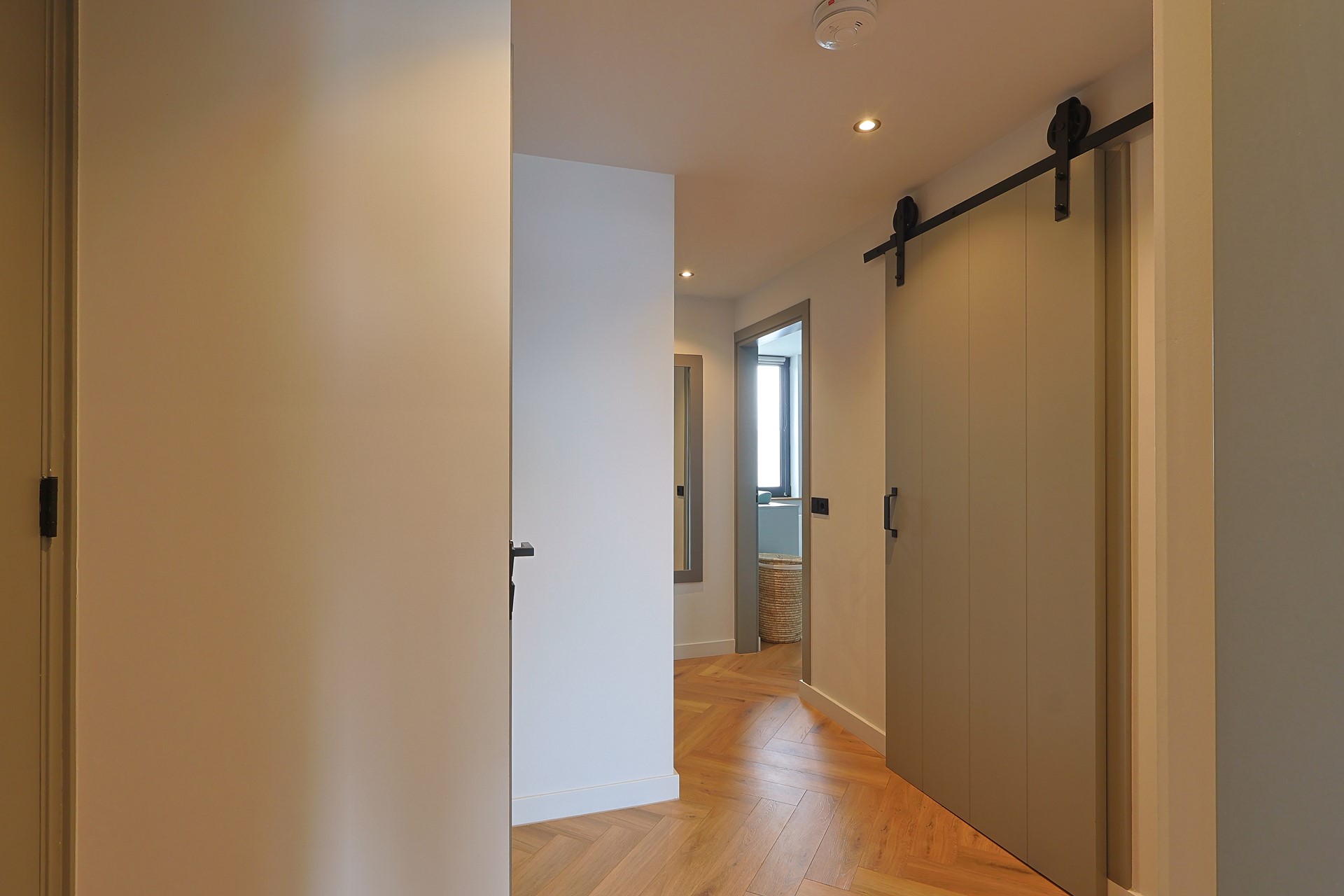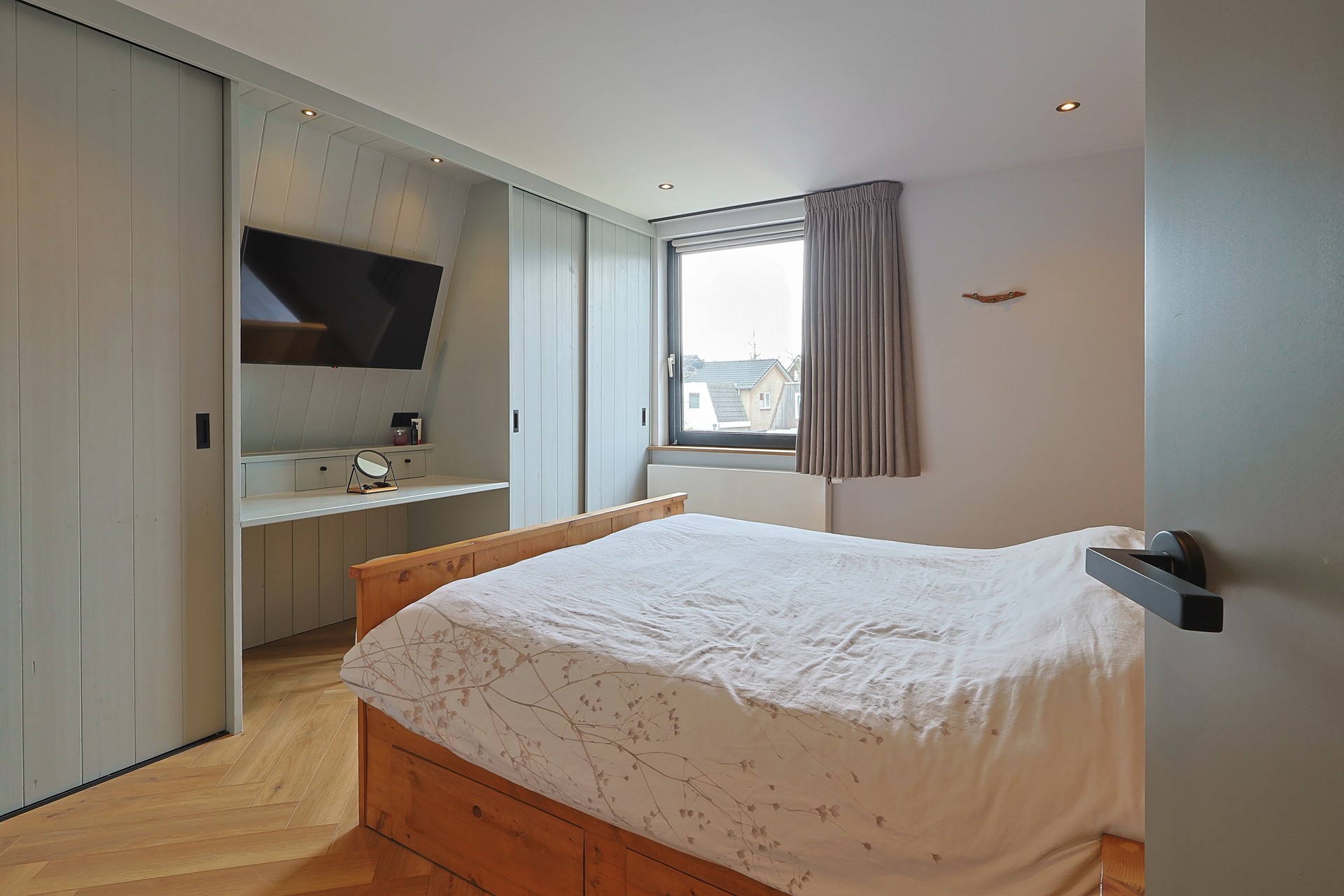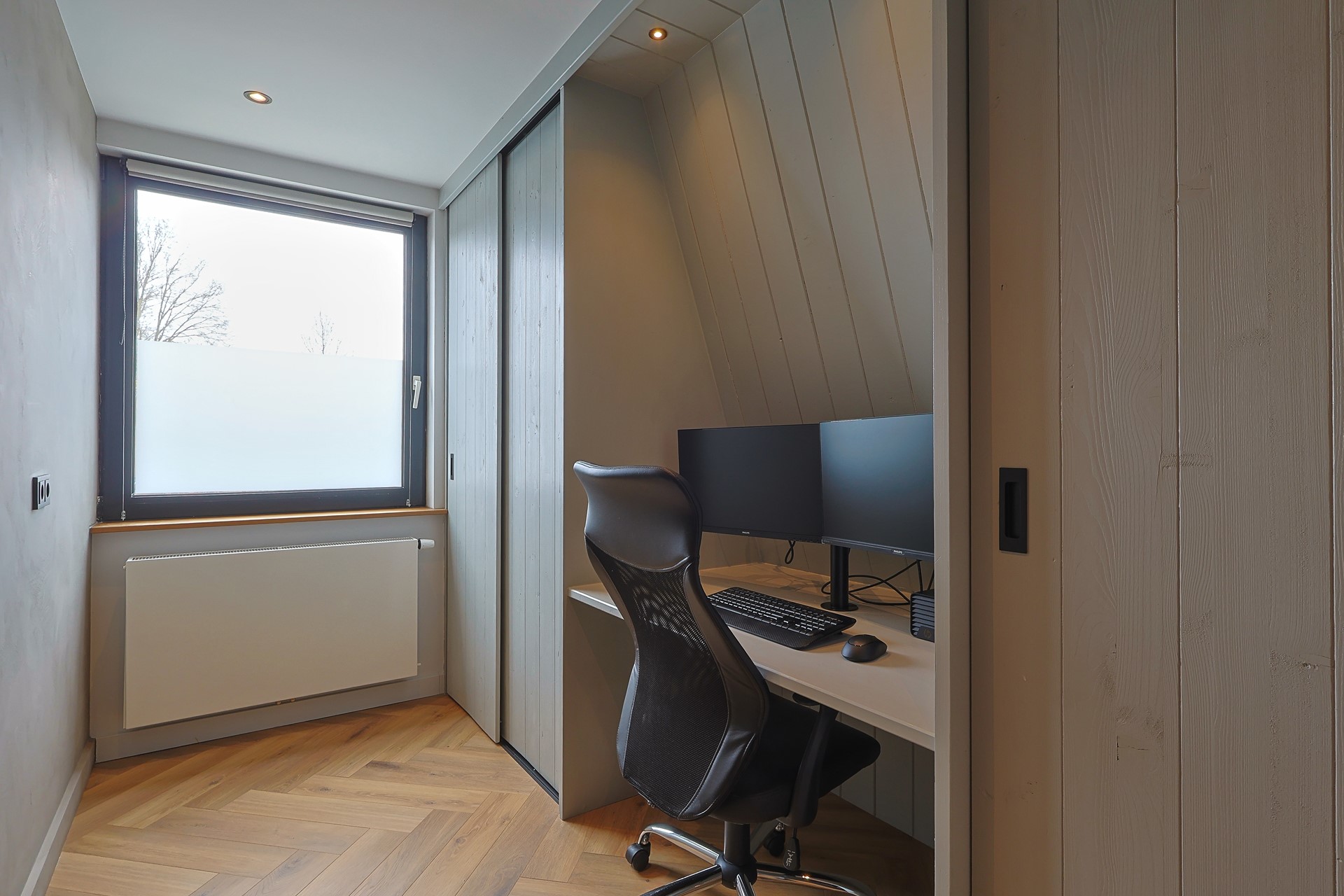 Overloop met toegang tot vier slaapkamers, waarvan één in gebruik als werk-/studeerkamer. Alle kamers zijn strak afgewerkt en voorzien van een laminaatvloer en vaste kasten. Moderne badkamer met ligbad, douchecabine, toilet, wastafelmeubel en elektrische vloerverwarming.