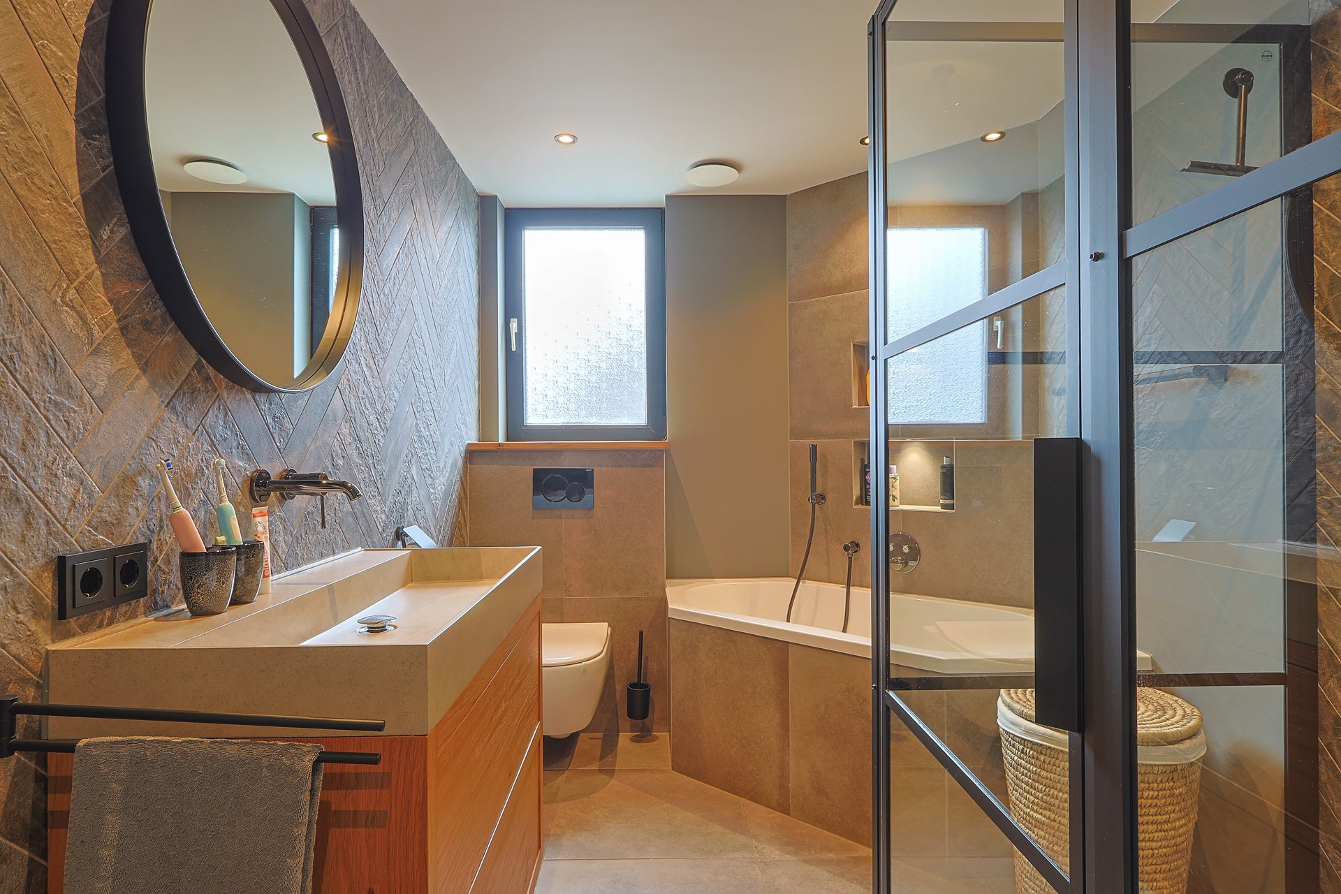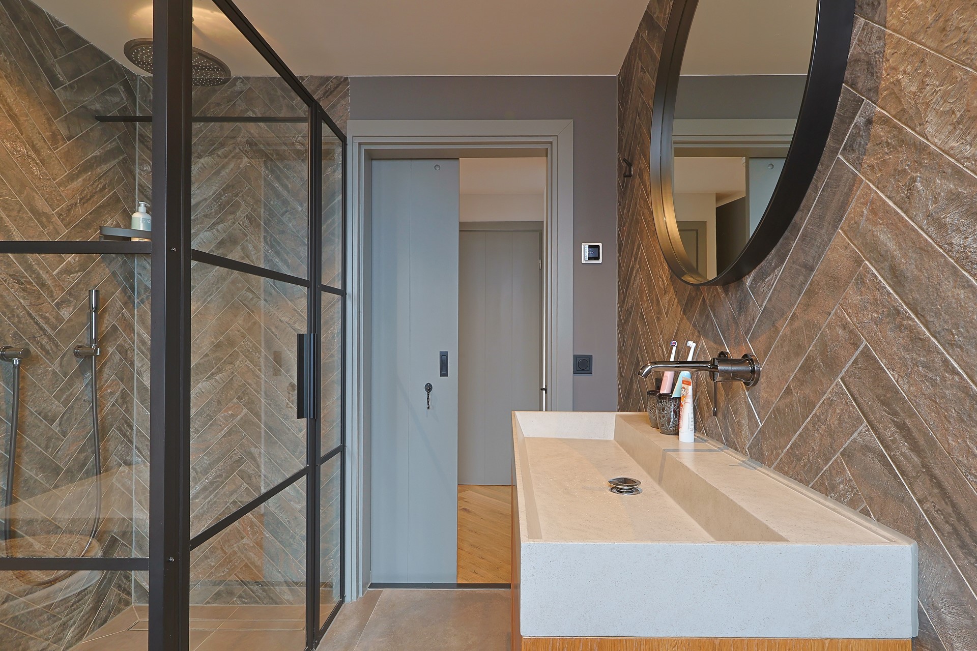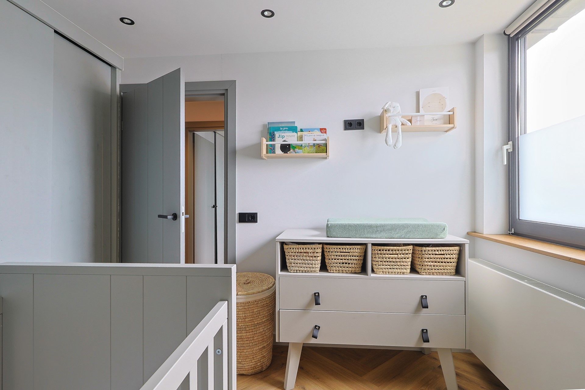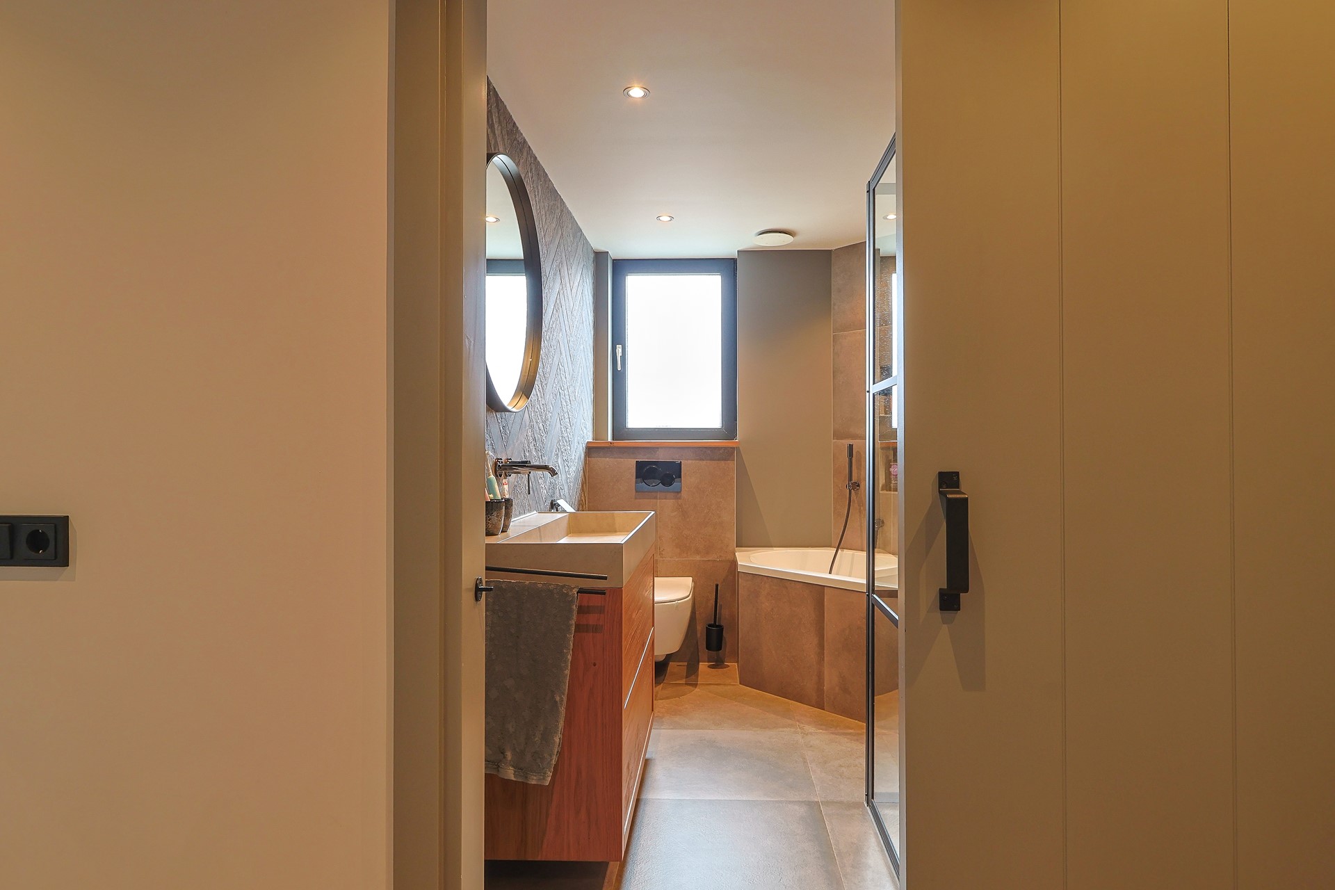 Overloop met toegang tot vier slaapkamers, waarvan één in gebruik als werk-/studeerkamer. Alle kamers zijn strak afgewerkt en voorzien van een laminaatvloer en vaste kasten. Moderne badkamer met ligbad, douchecabine, toilet, wastafelmeubel en elektrische vloerverwarming.