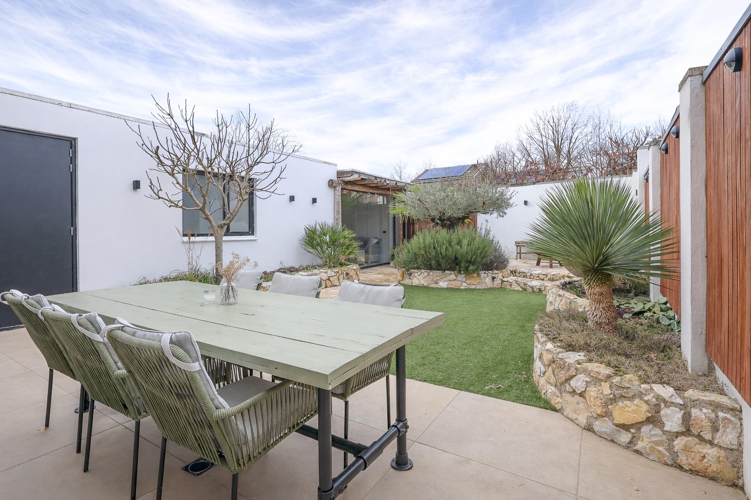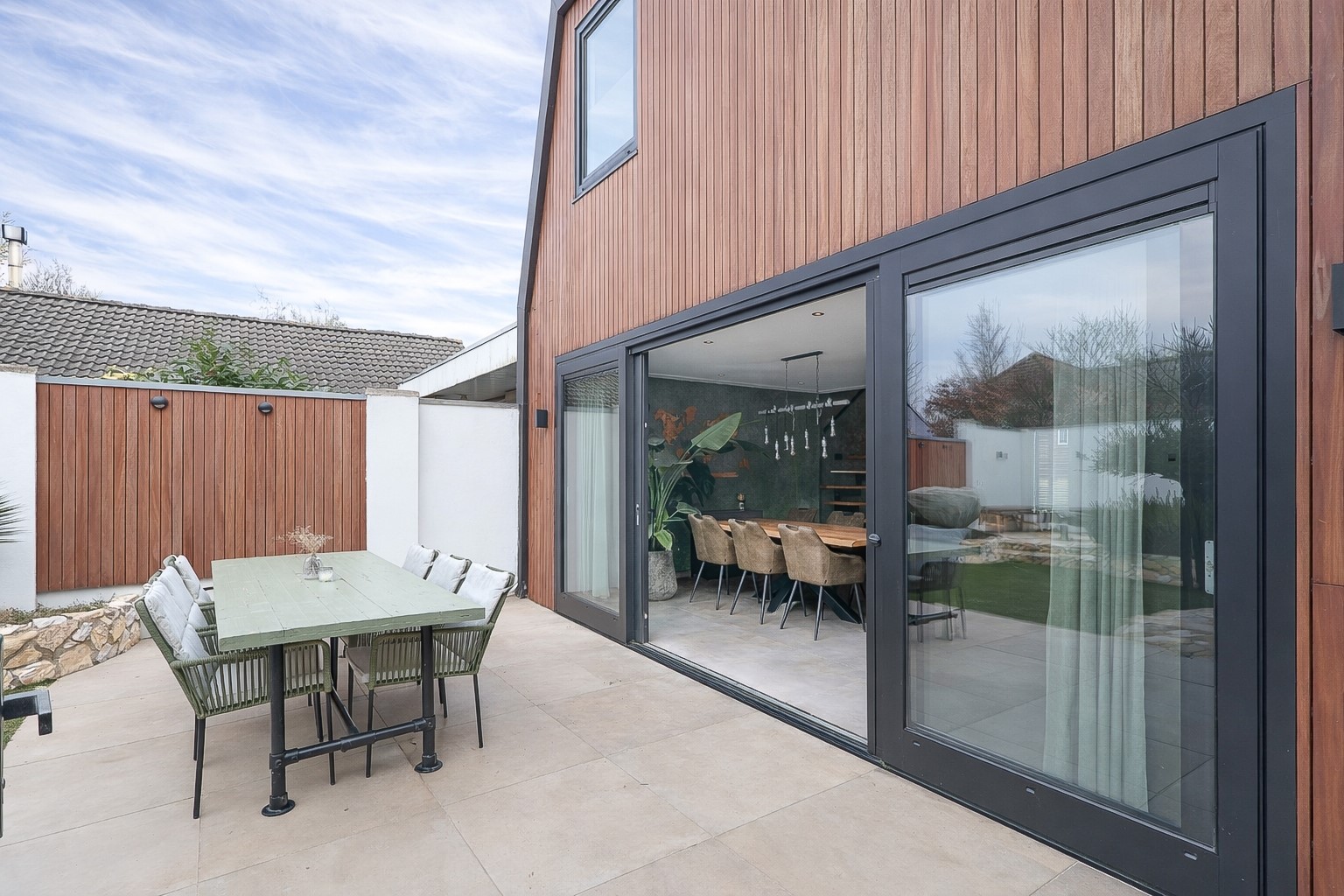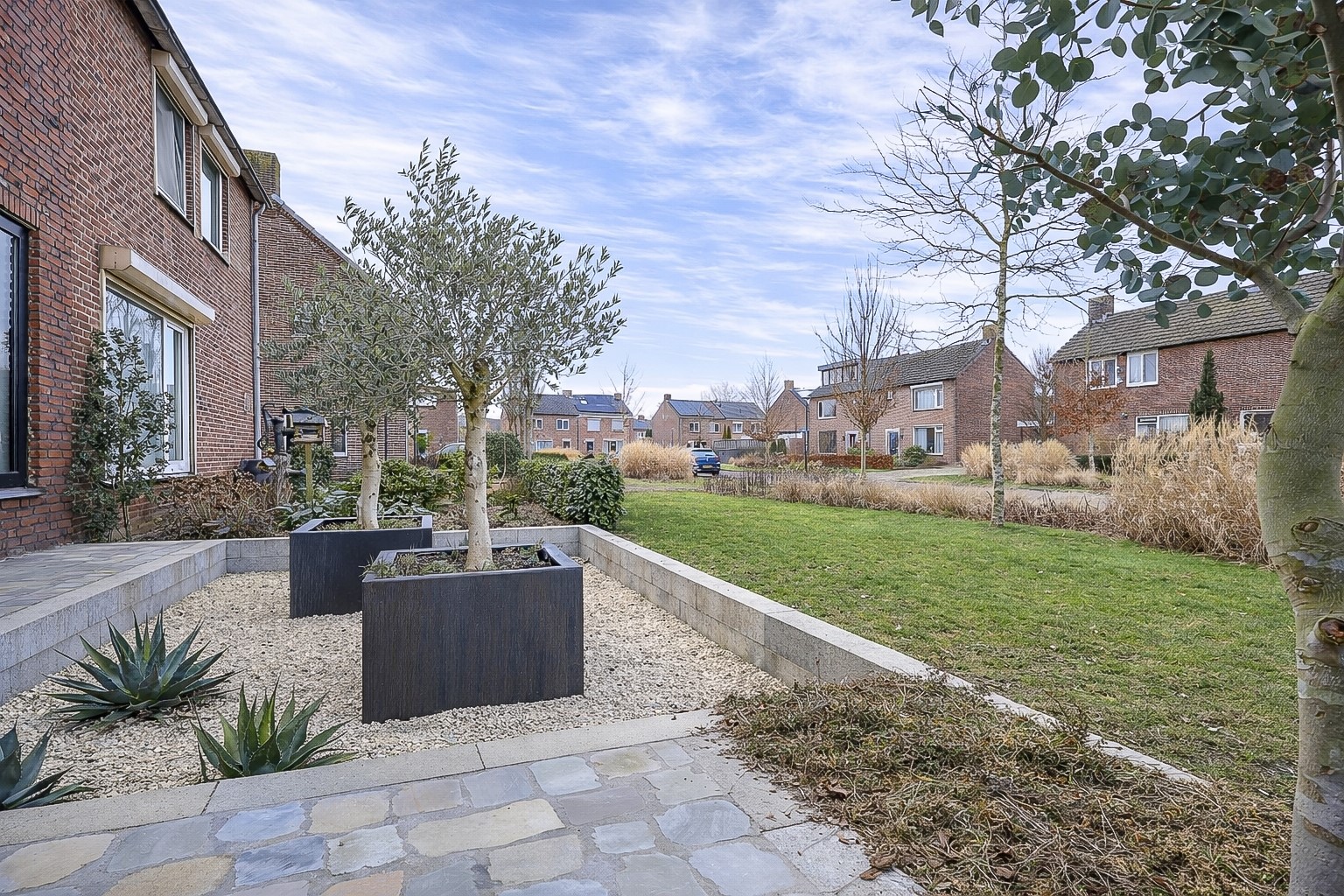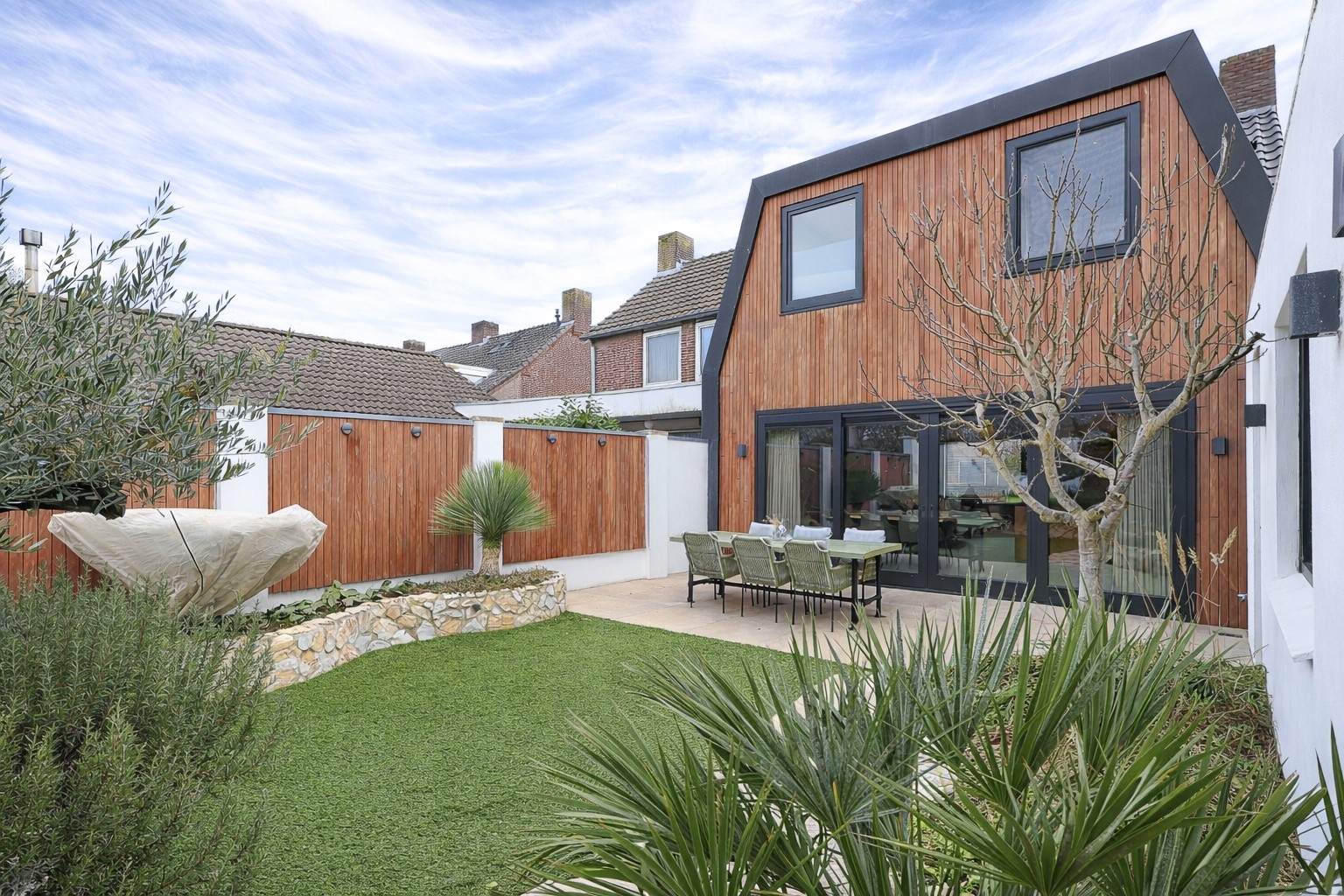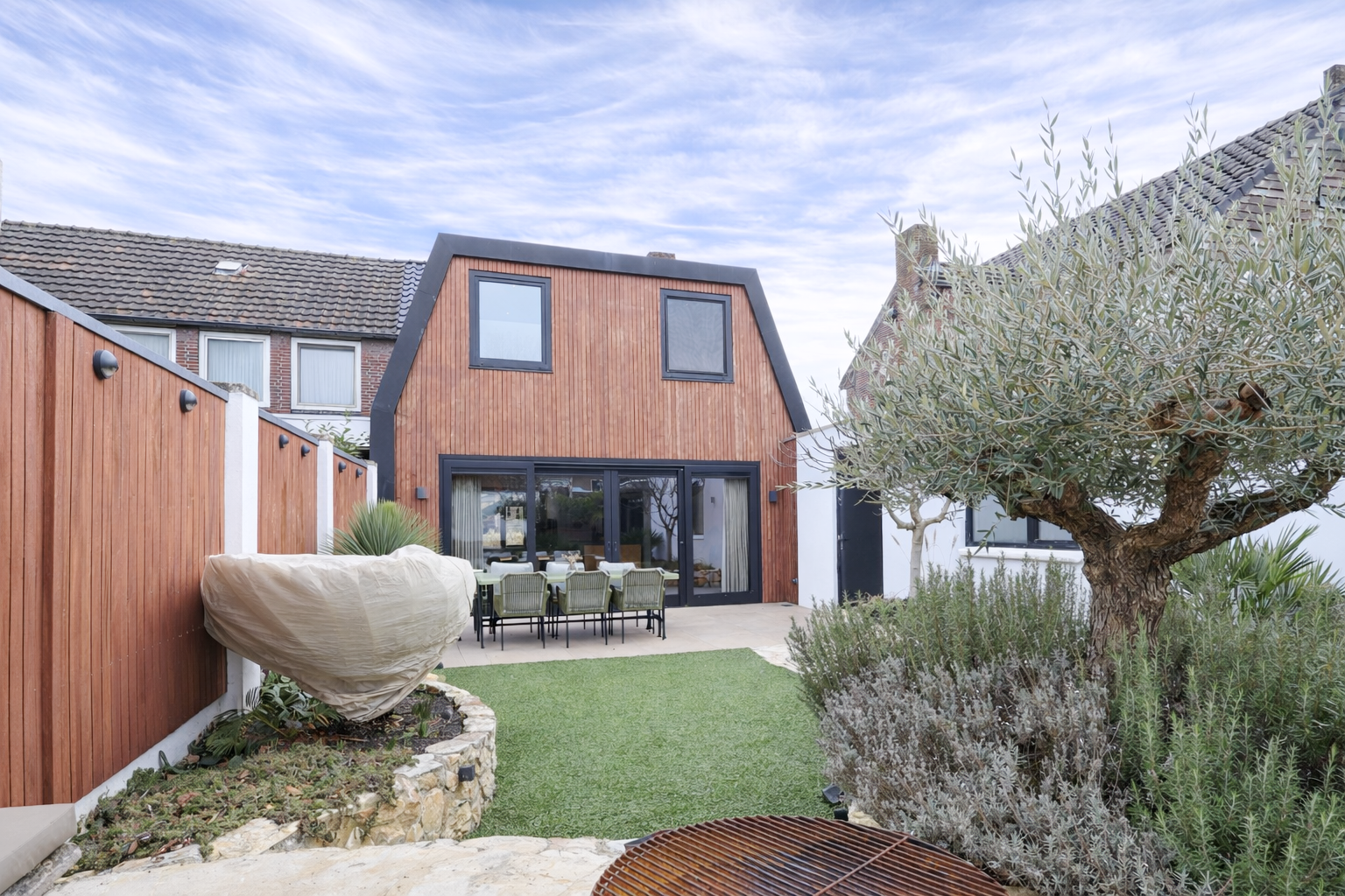 Via de brede schuifpui stap je zo het terras op van de achtertuin. De achtertuin is fraai aangelegd met olijfbomen, lichte bestrating en meerdere zitplekken, waardoor je je hier in Spanje waant. Achter de berging een tuinkamer met glazen schuifwand, buitenkeuken en loungehoek. Aan de voorzijde een rustige breed opgezette straat met groenstrook. Oprit en een strakke carport met lichtkoepel en de twee deuren in aanbouw als dubbele achterom.