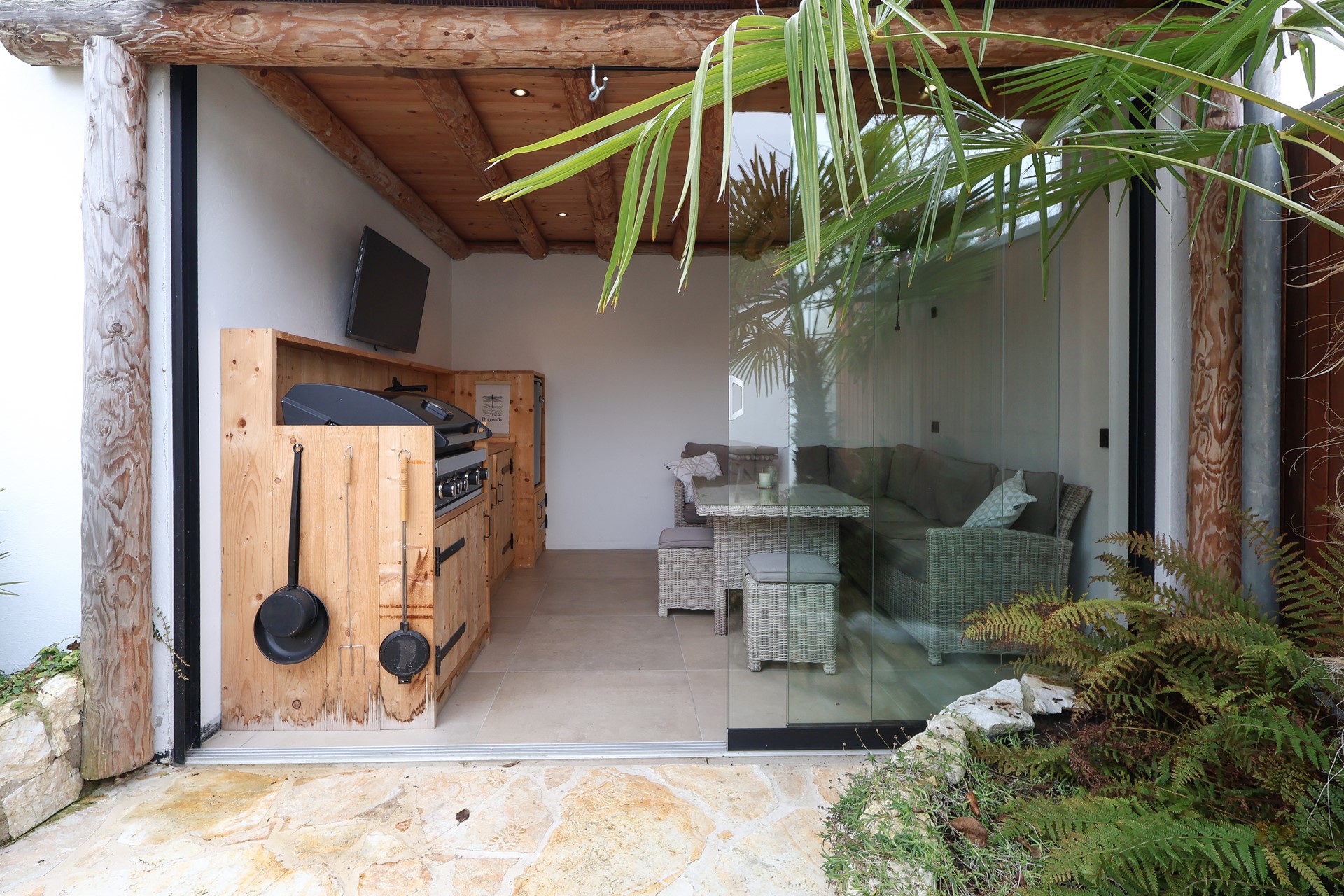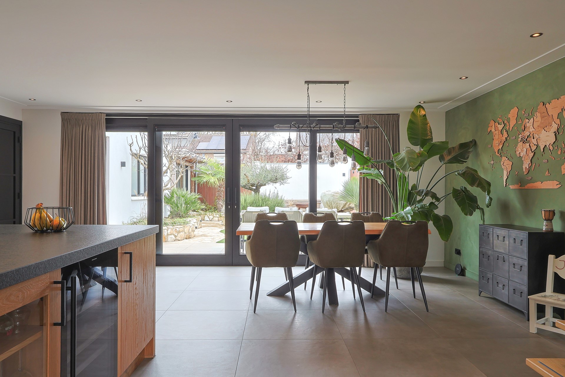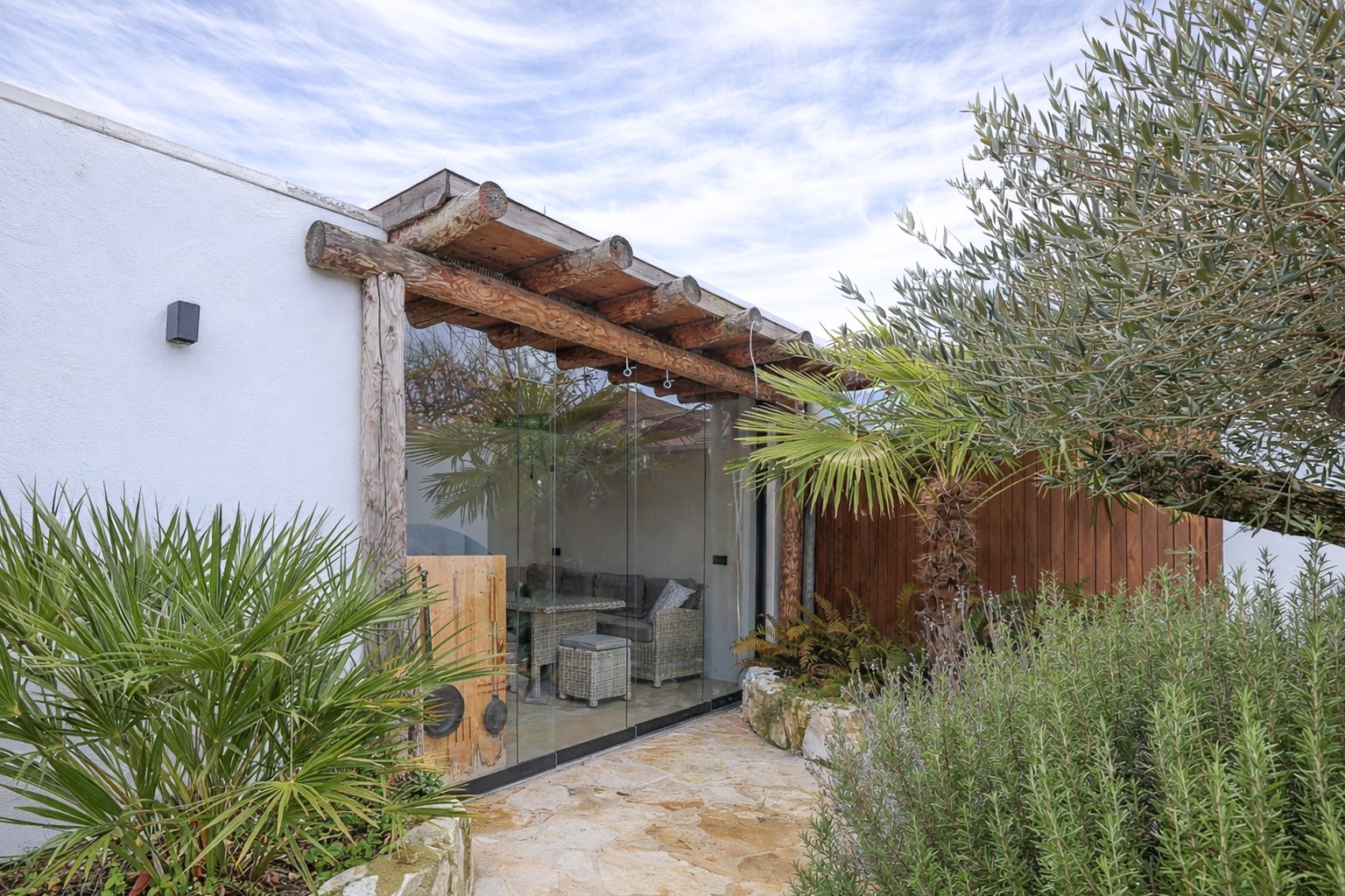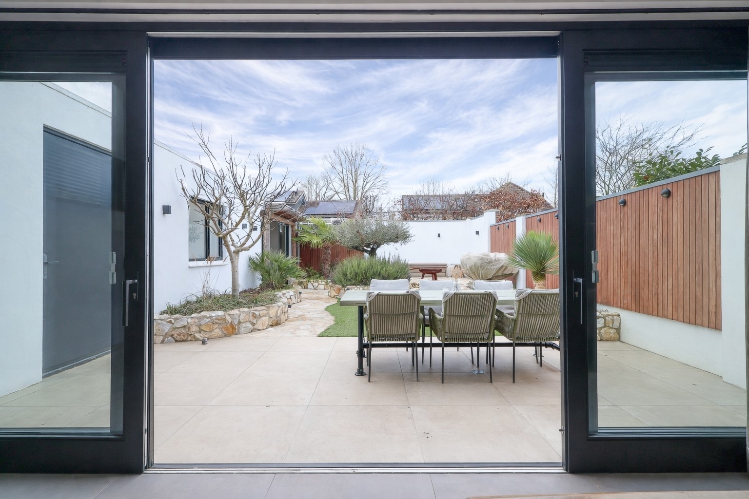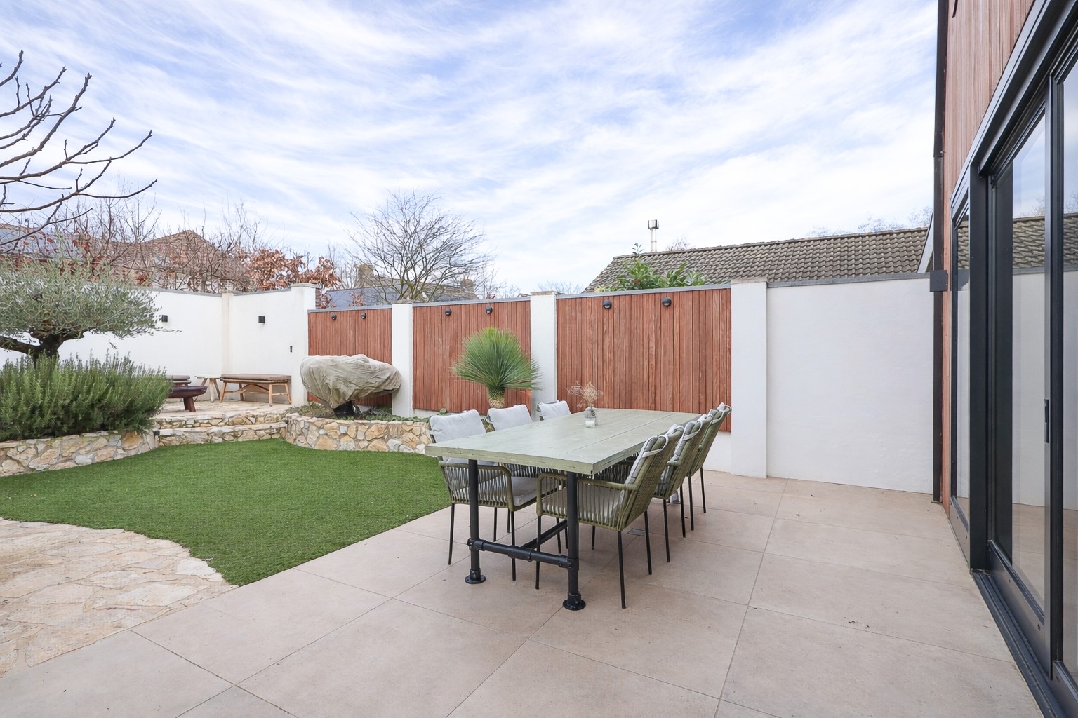 Via de brede schuifpui stap je zo het terras op van de achtertuin. De achtertuin is fraai aangelegd met olijfbomen, lichte bestrating en meerdere zitplekken, waardoor je je hier in Spanje waant. Achter de berging een tuinkamer met glazen schuifwand, buitenkeuken en loungehoek. Aan de voorzijde een rustige breed opgezette straat met groenstrook. Oprit en een strakke carport met lichtkoepel en de twee deuren in aanbouw als dubbele achterom.