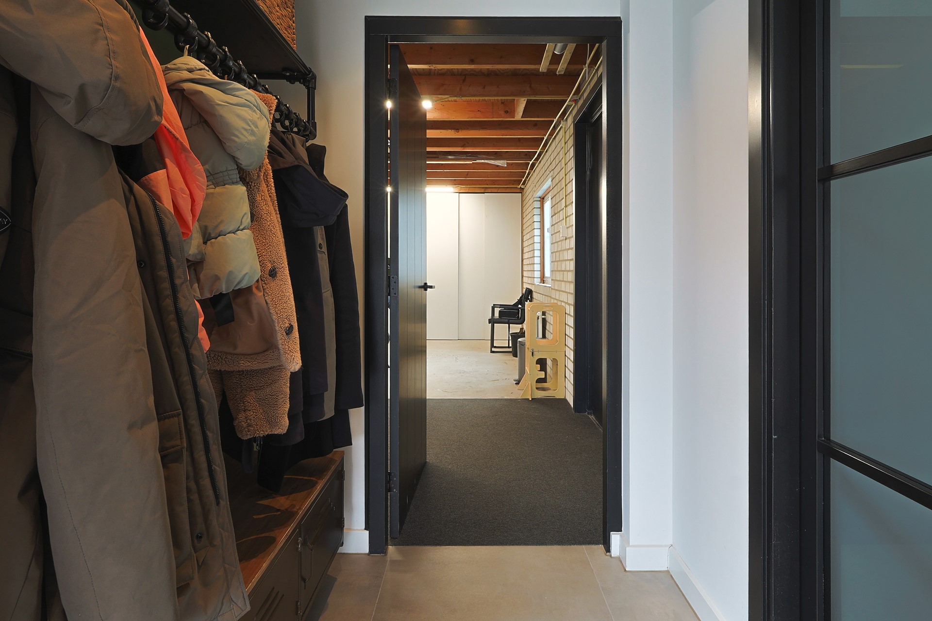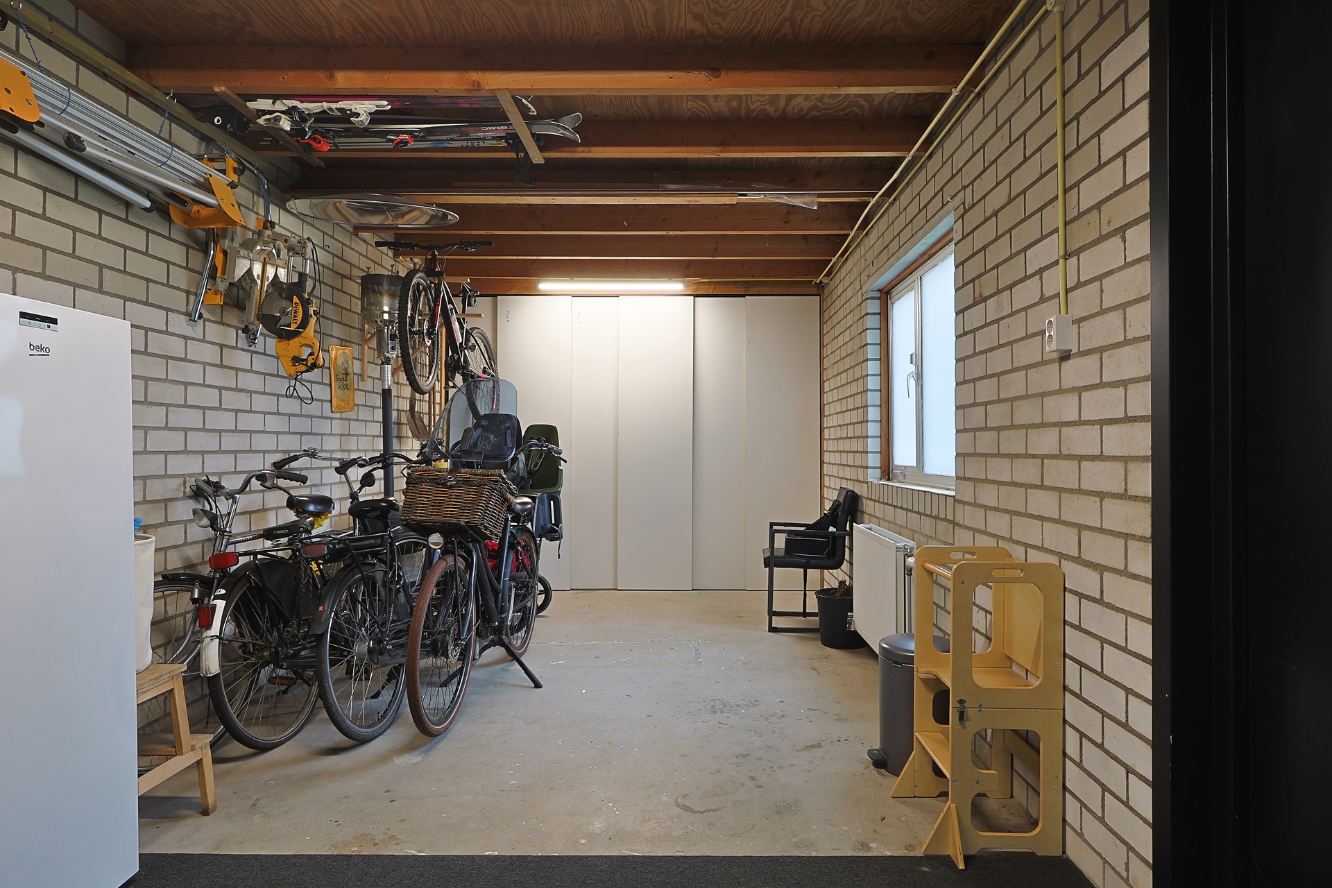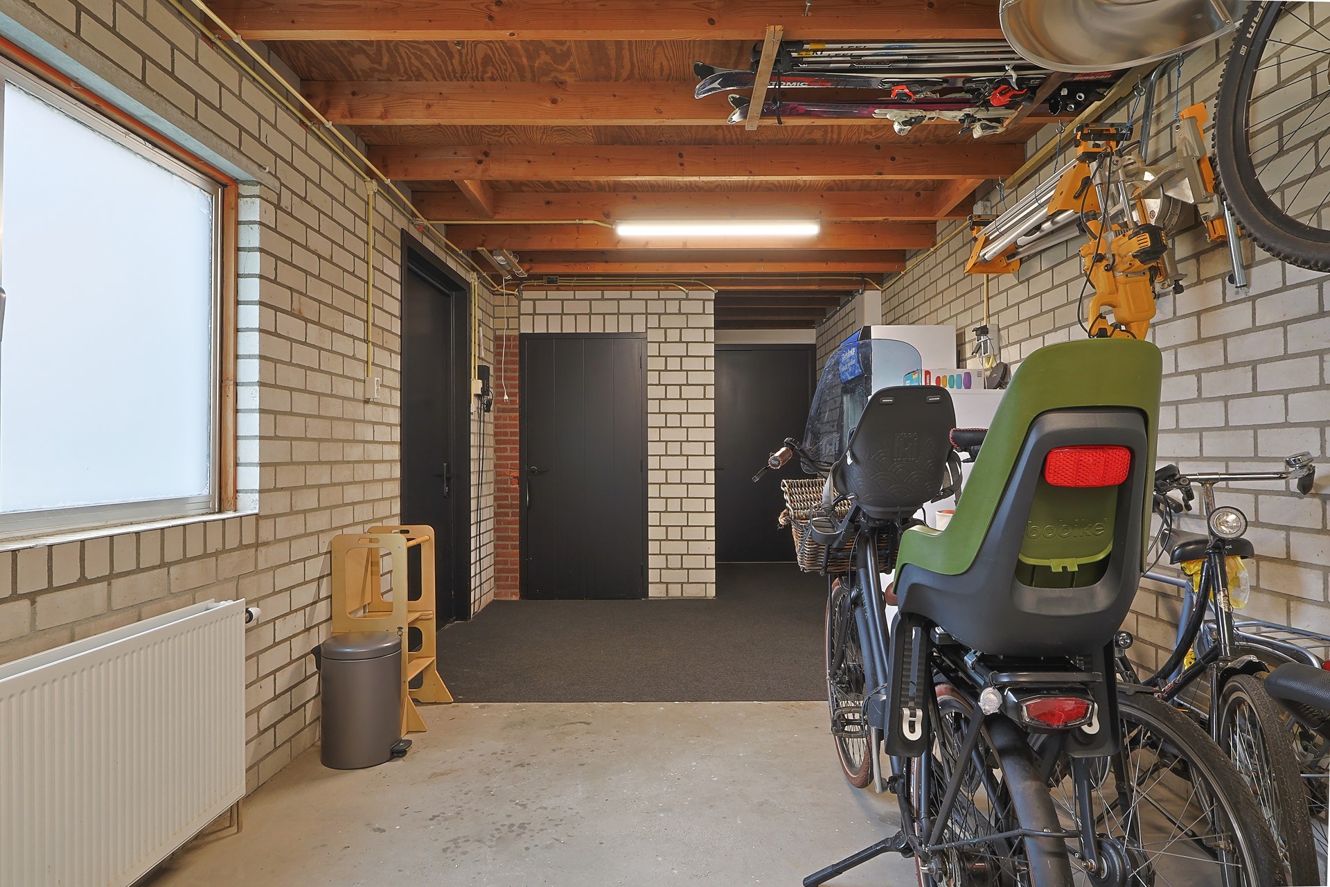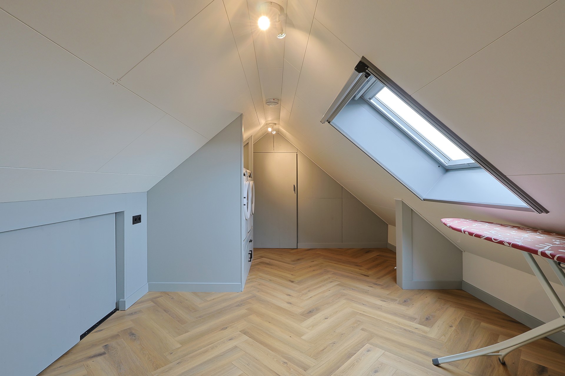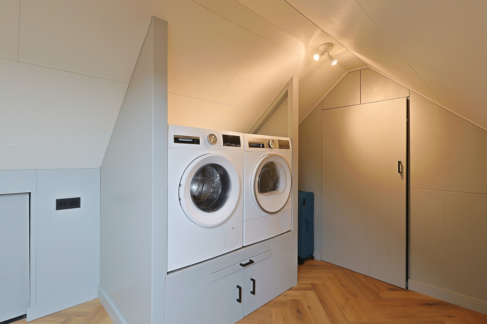 Open ruimte met witgoedaansluitingen, bergruimte achter de knieschotten en een aparte technische ruimte met warmtepomp en elektrische boiler.