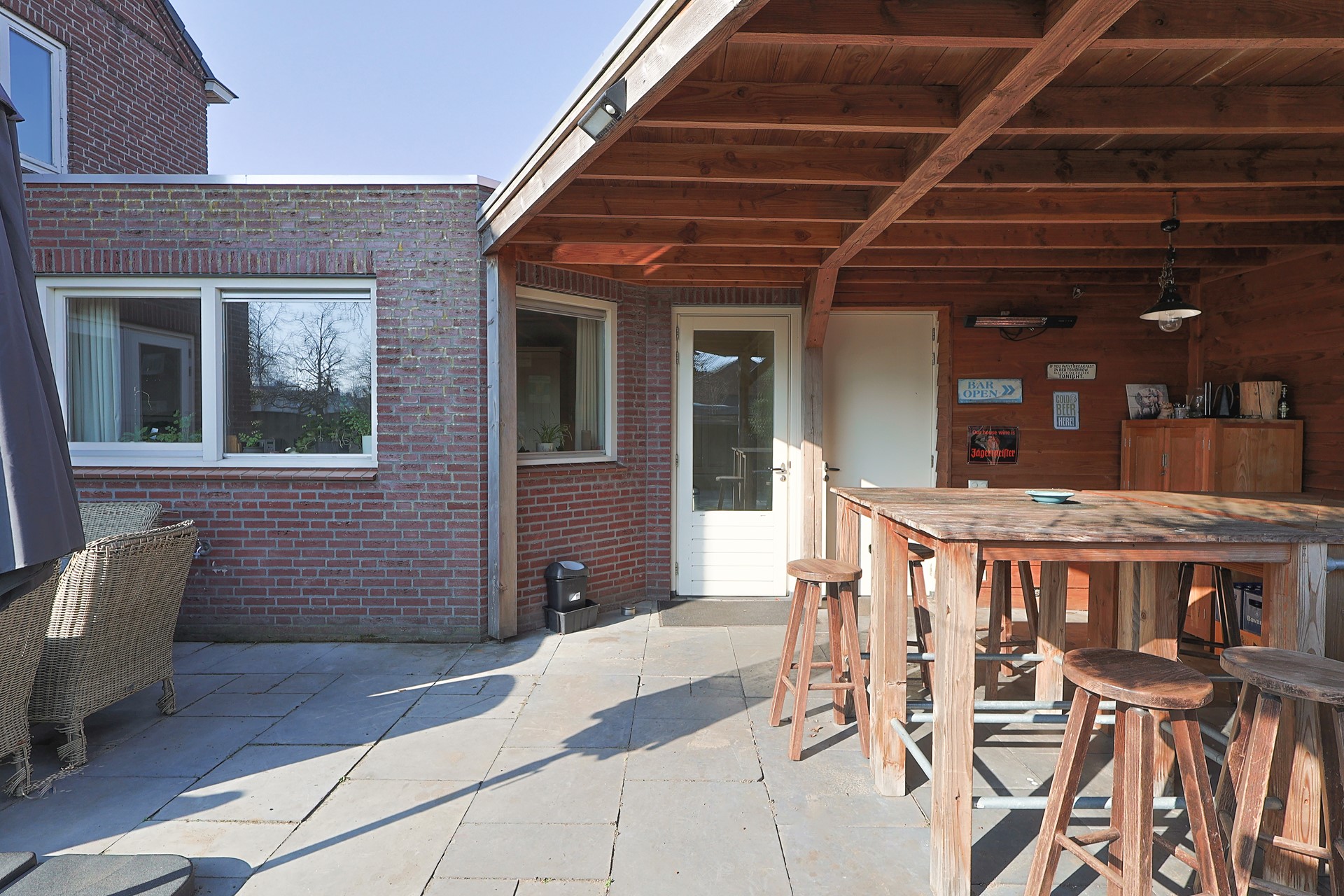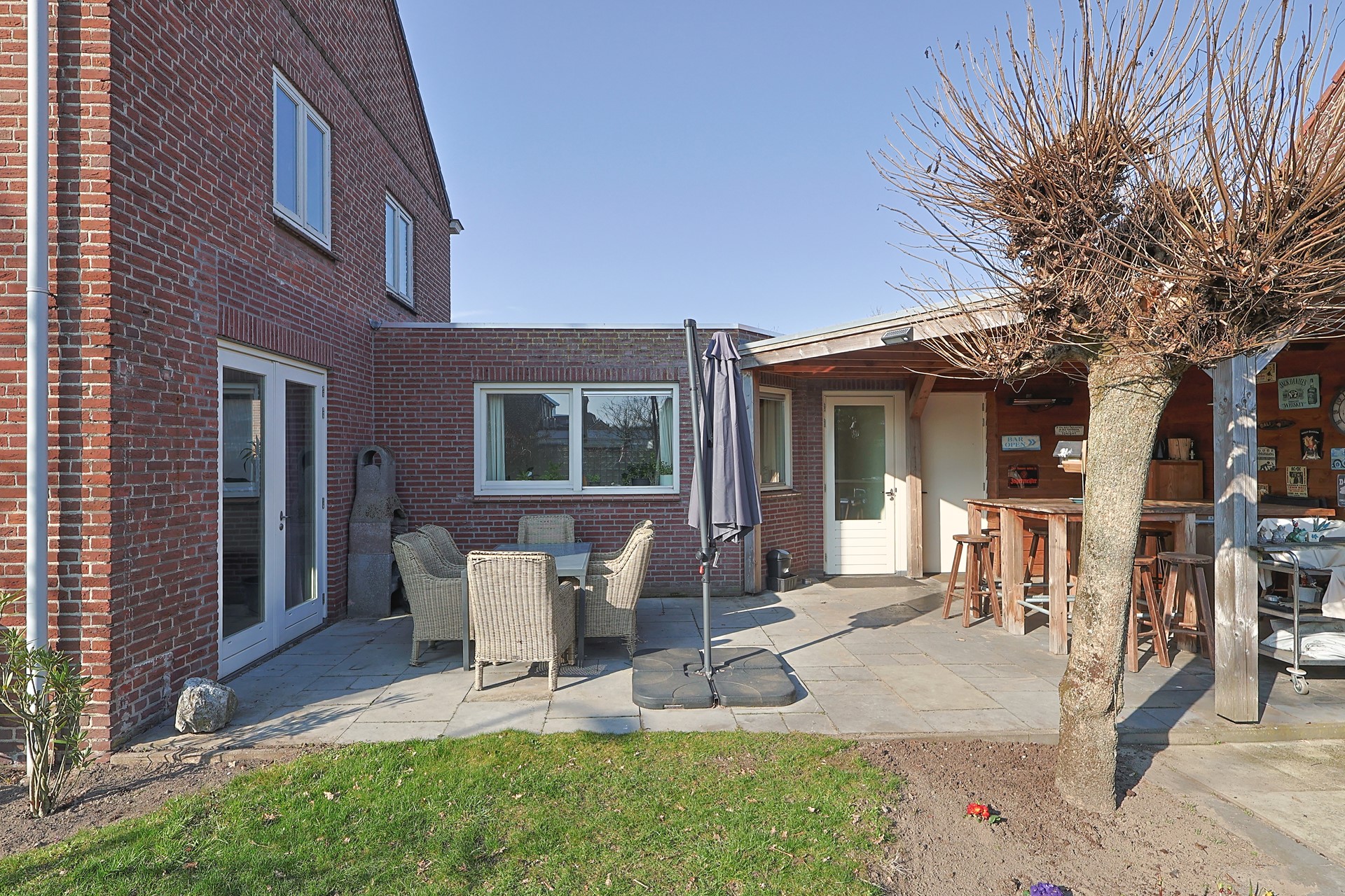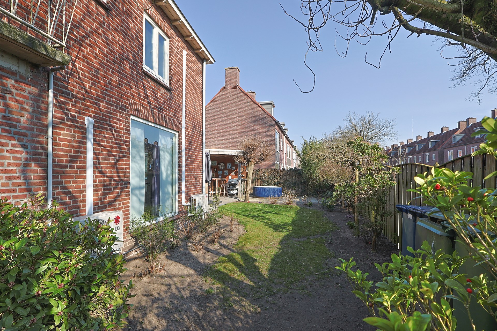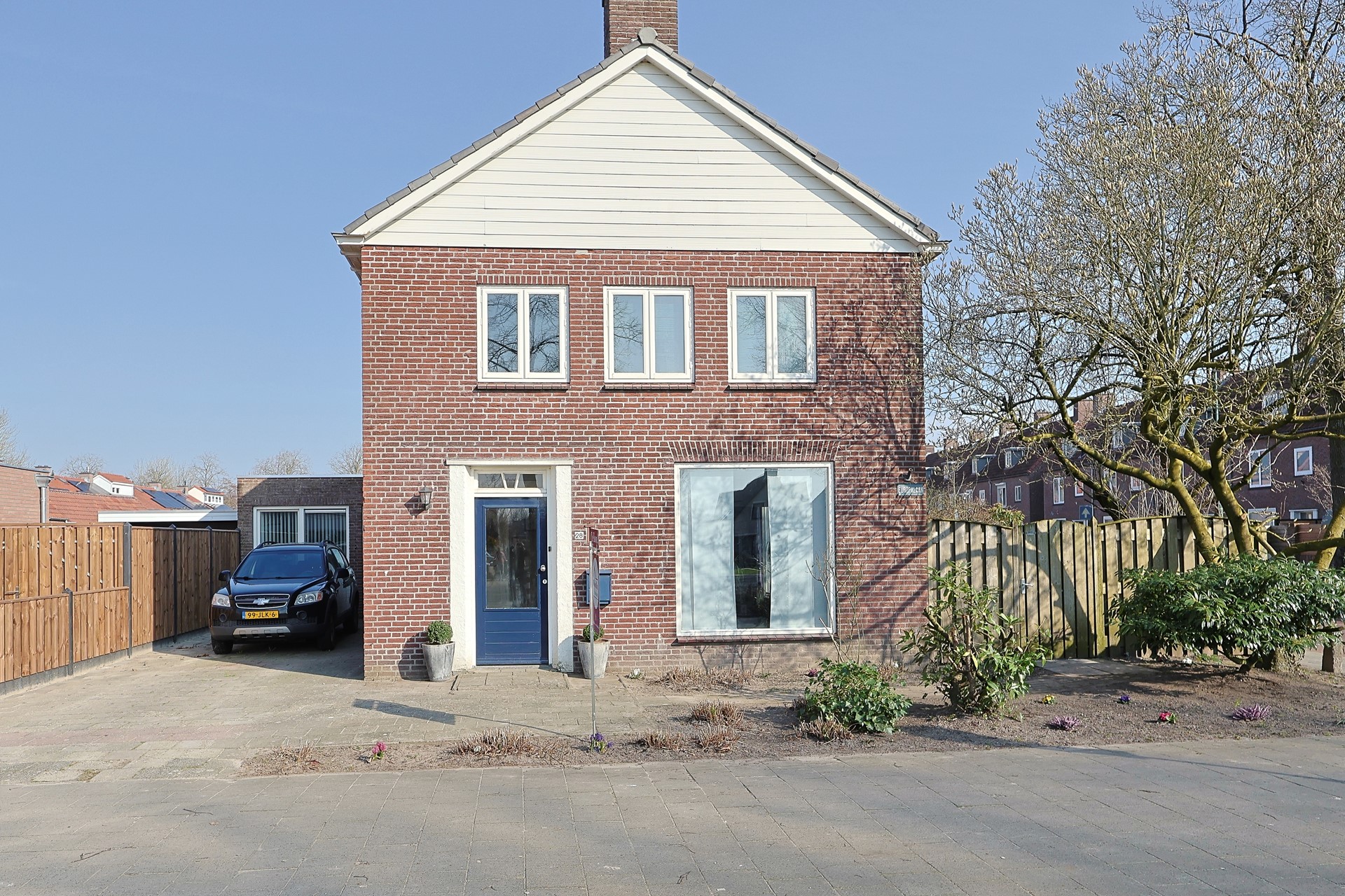 Voortuin met oprit bij de aanbouw. Privacy biedende zij- en achtertuin met poort, veel groen, terras en een grote veranda direct grenzend aan de achterdeur.