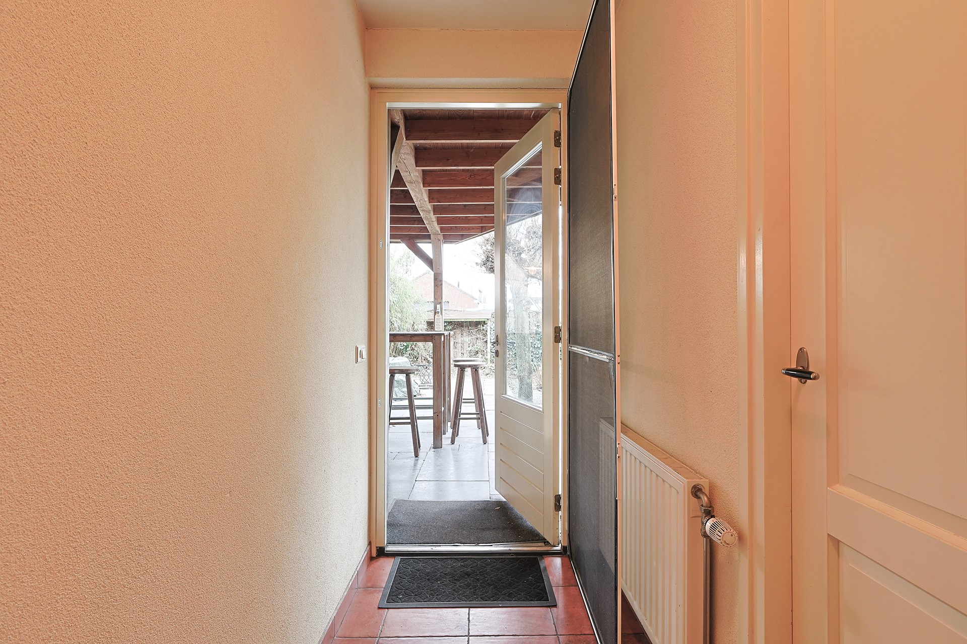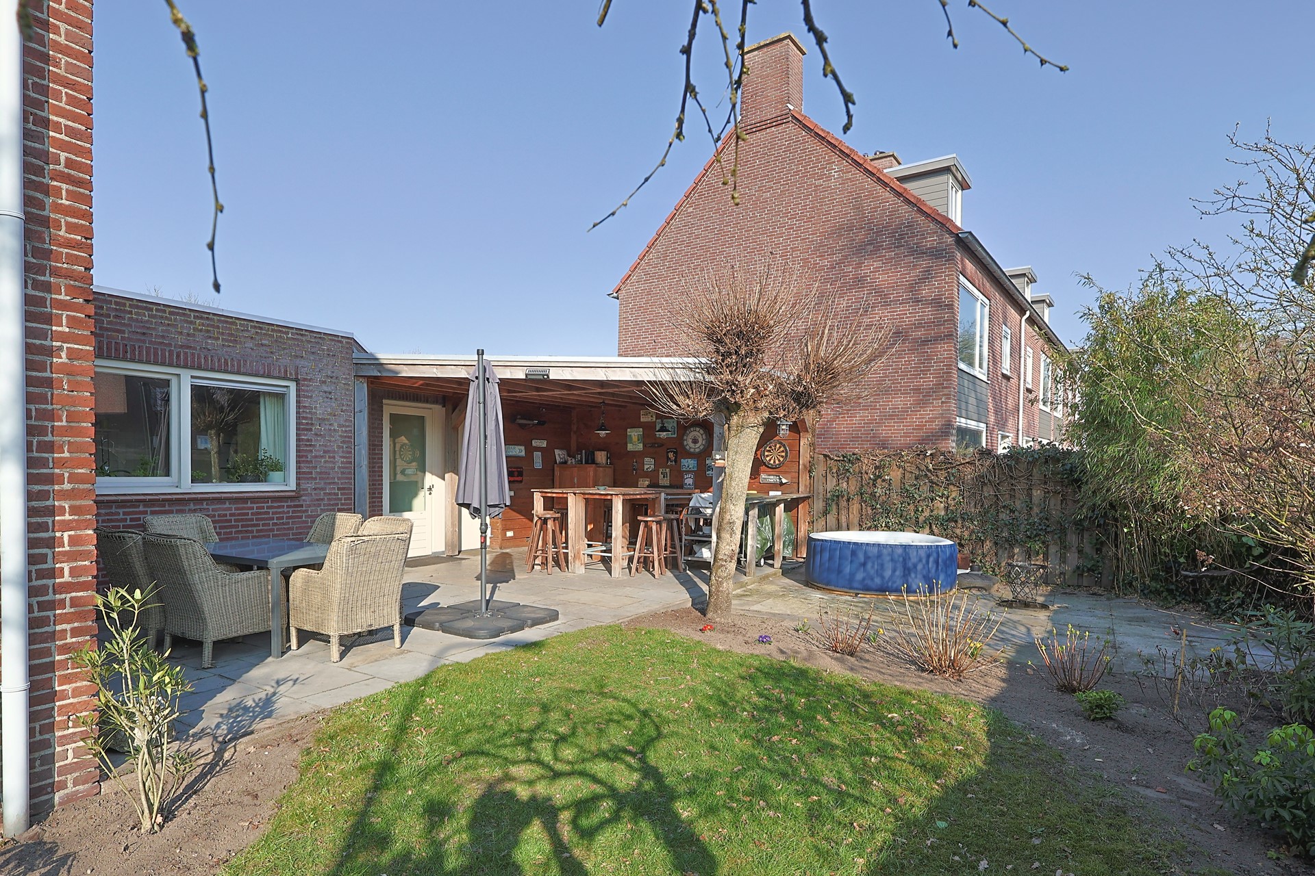 Privacy biedende zij- achtertuin met een ruime veranda, extra terras en volop groen.