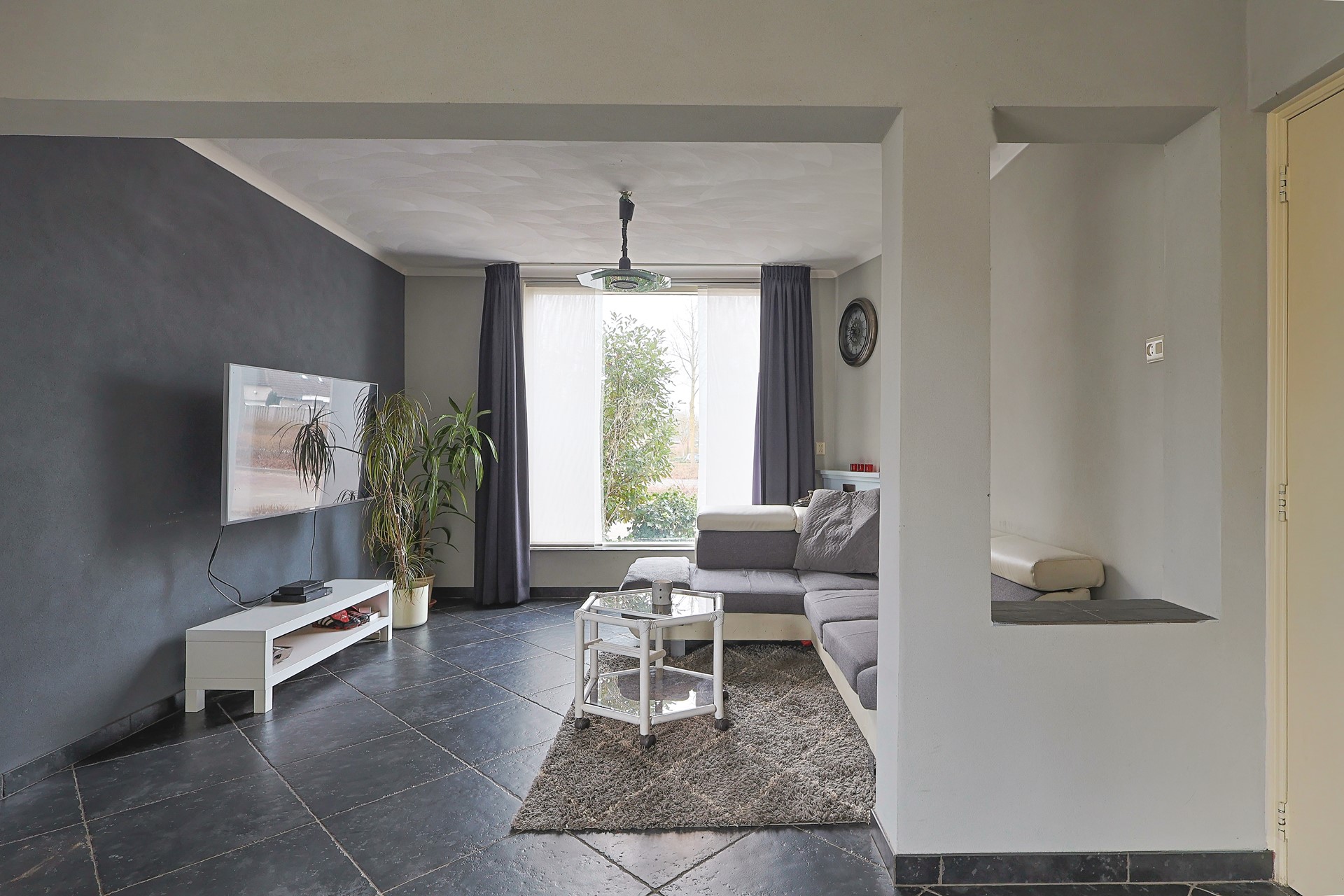 Entree met hal voorzien van meterkast en trapopgang, via een getoogde deur toegang tot het tussenportaal met kelderkast en doorgang naar de woonkamer. Ruime L-vormige woonkamer (ca. 42 m²) met grote raampartijen, openslaande tuindeuren naar de achtertuin, deur naar de keuken in de aanbouw en airconditioning.