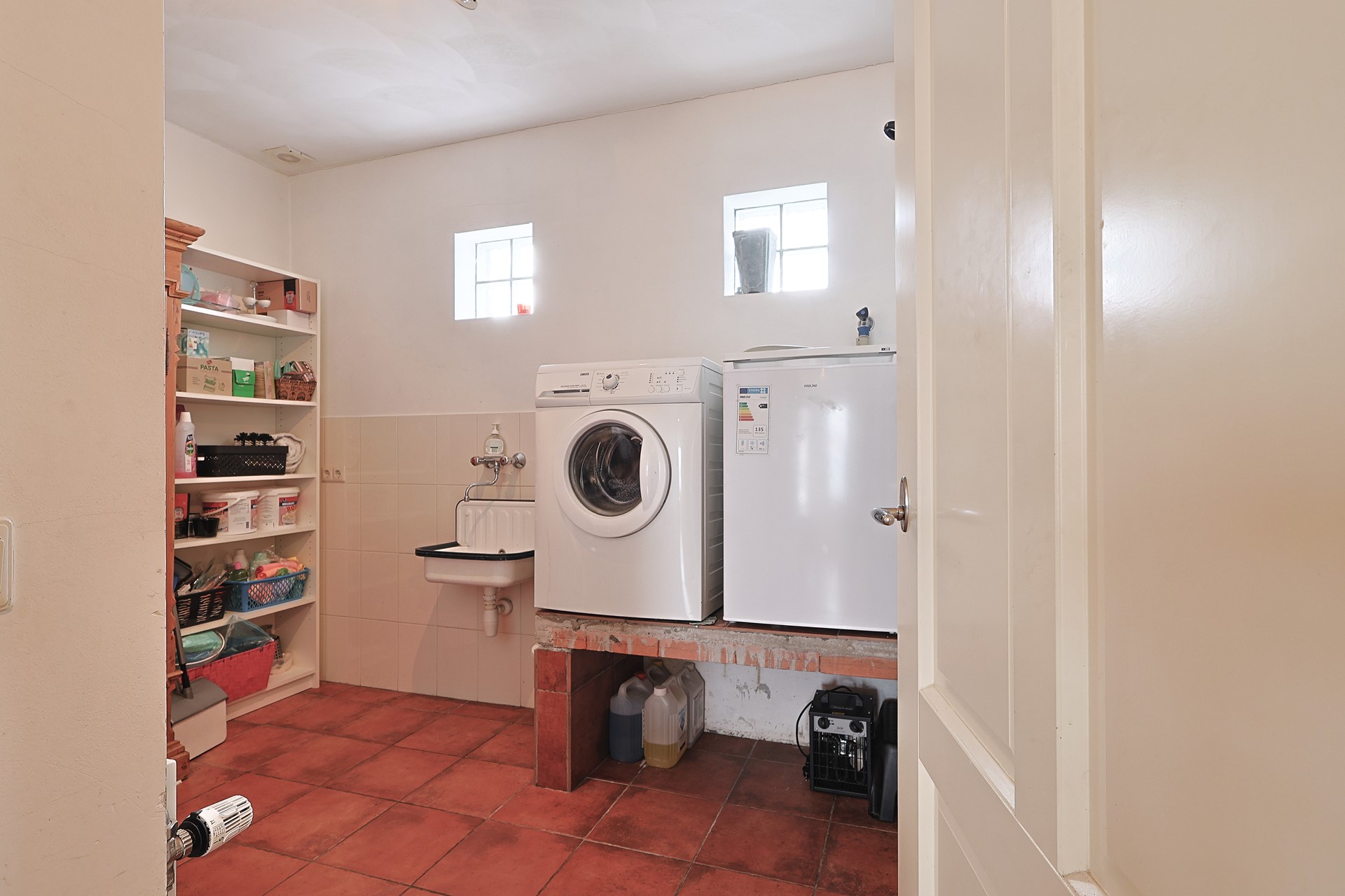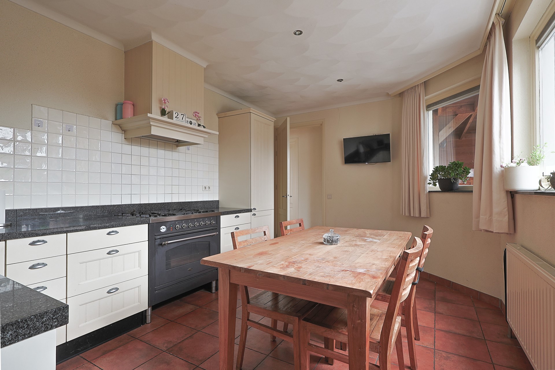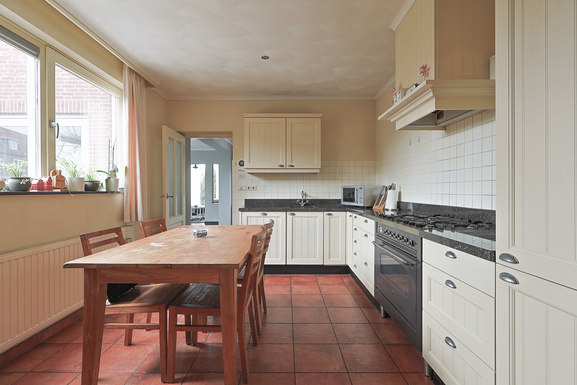 Ruime, gesloten keuken met hoekopstelling, hardstenen werkblad en onder andere een groot fornuis met oven. Portaal met toegang tot de kantoorruimte, het separate toilet en de berging/wasruimte met aansluitingen, evenals een buitendeur naar de veranda.