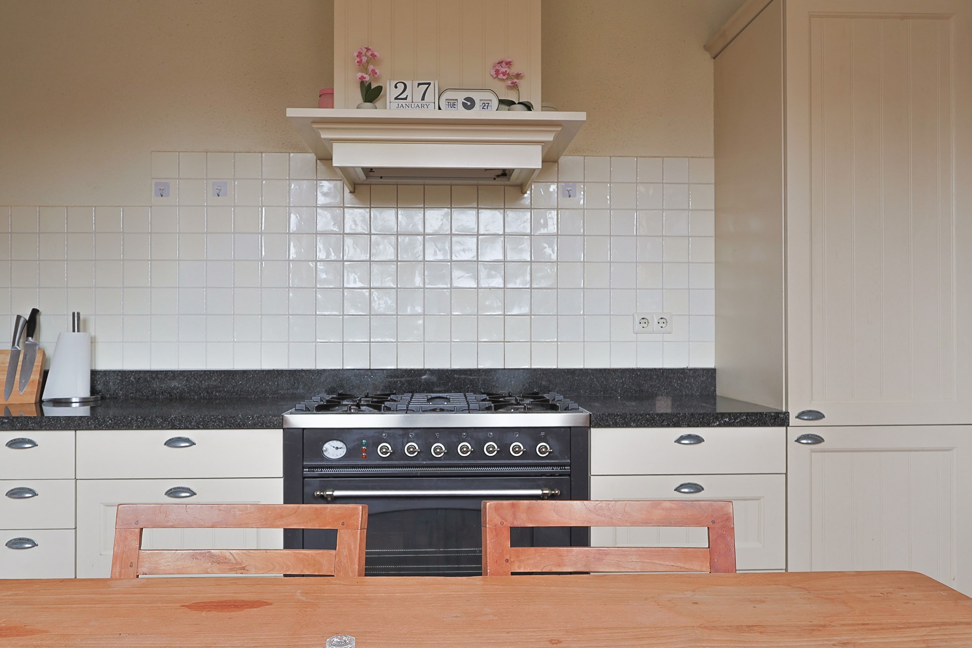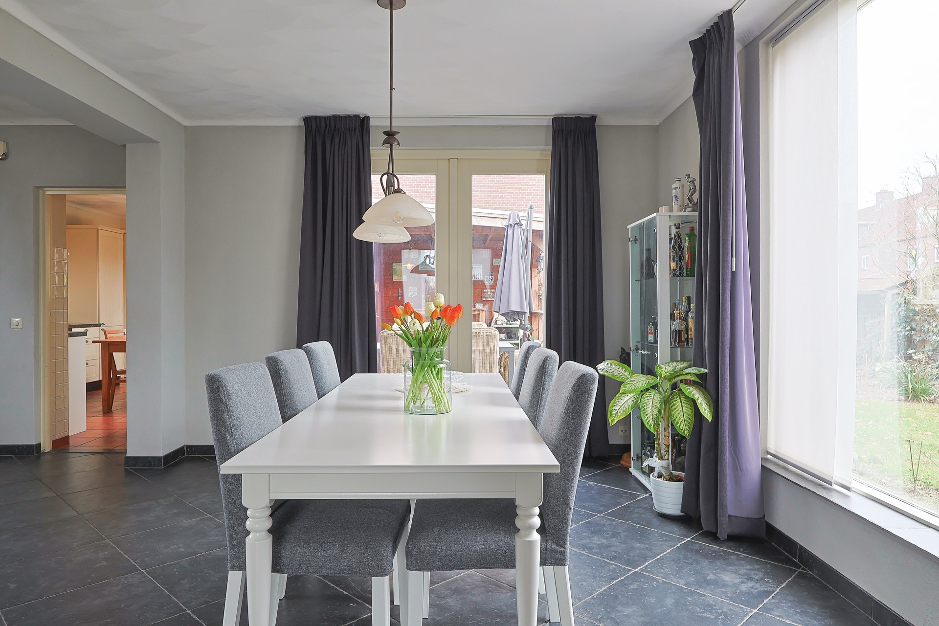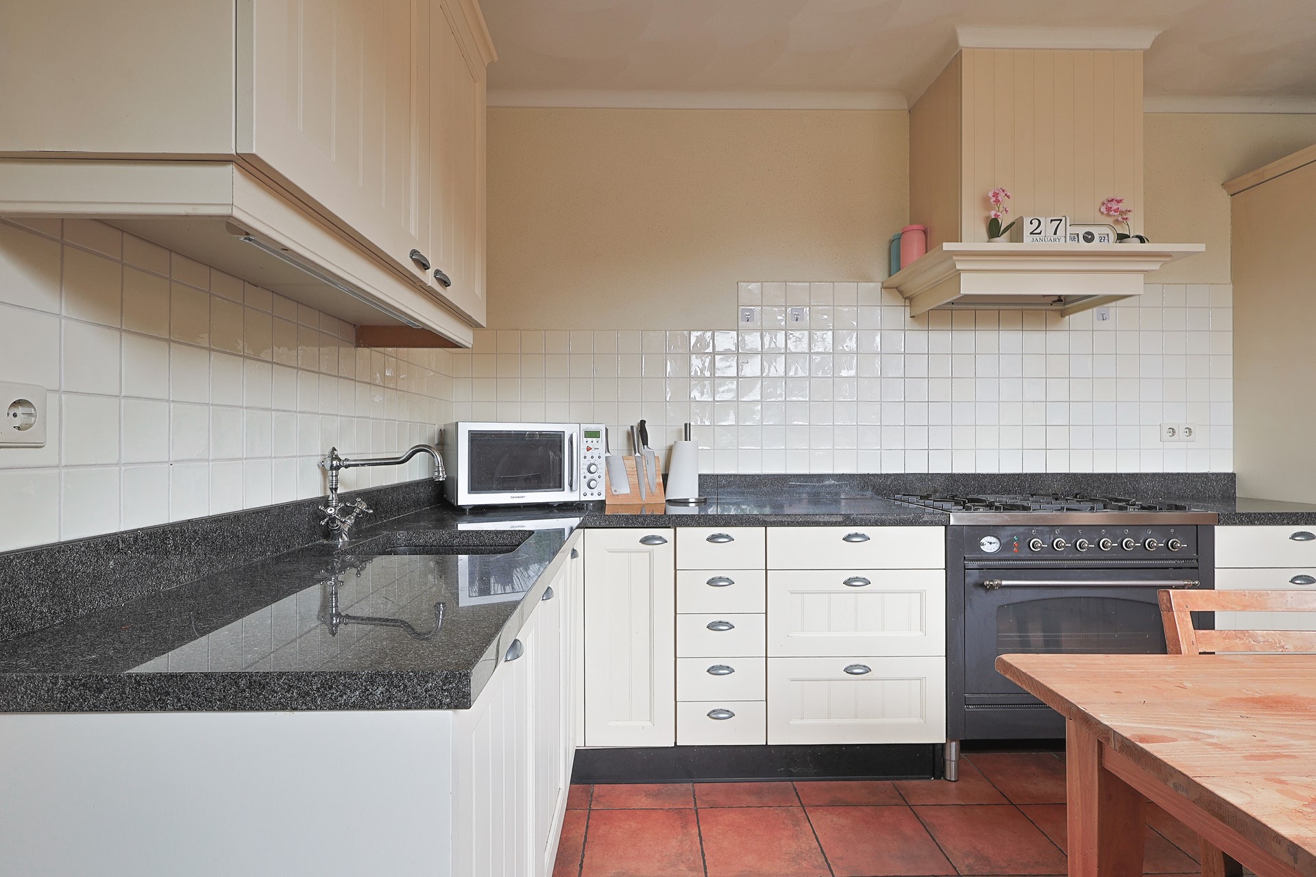 Ruime, gesloten keuken met hoekopstelling, hardstenen werkblad en onder andere een groot fornuis met oven. Portaal met toegang tot de kantoorruimte, het separate toilet en de berging/wasruimte met aansluitingen, evenals een buitendeur naar de veranda.