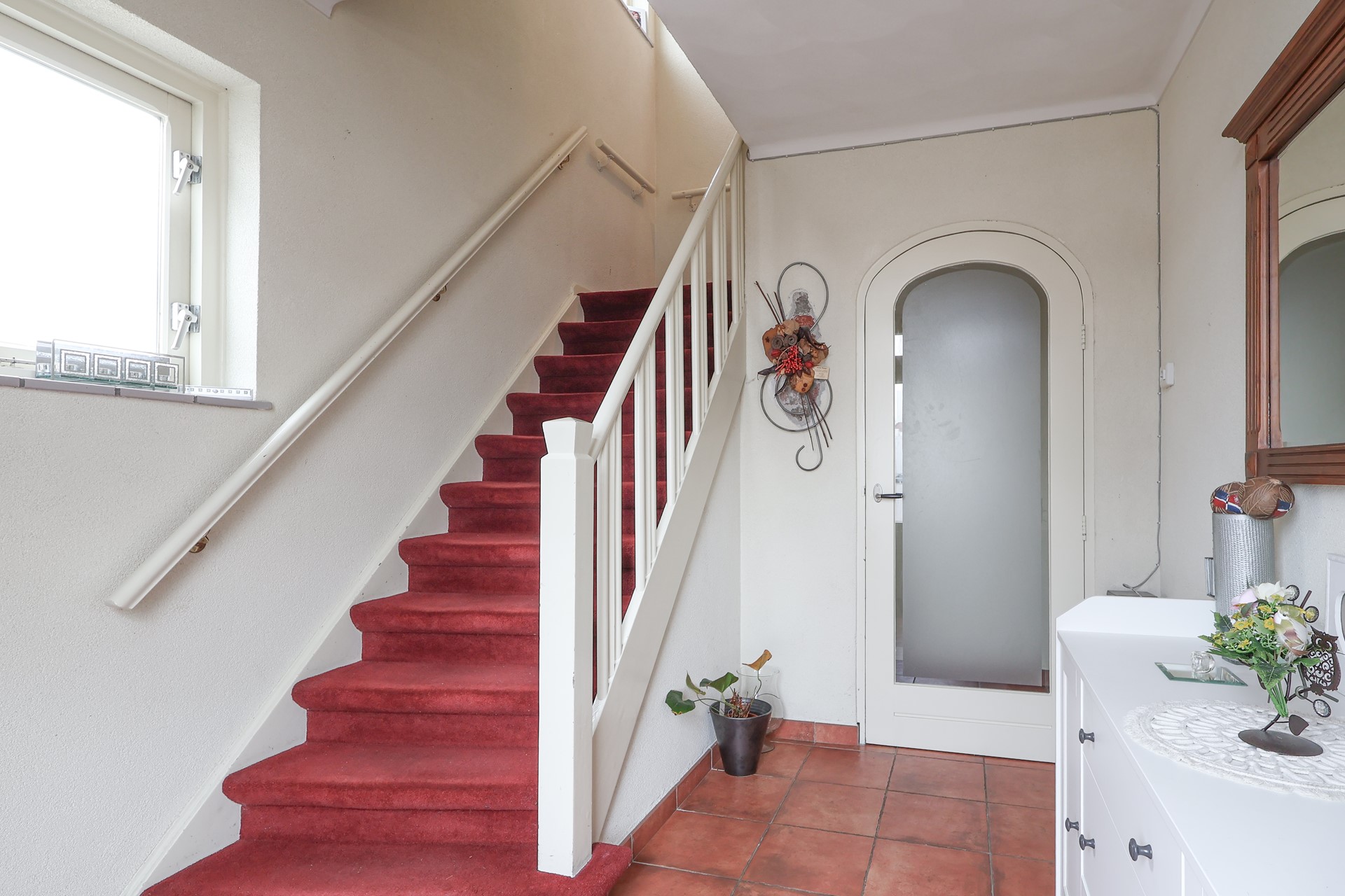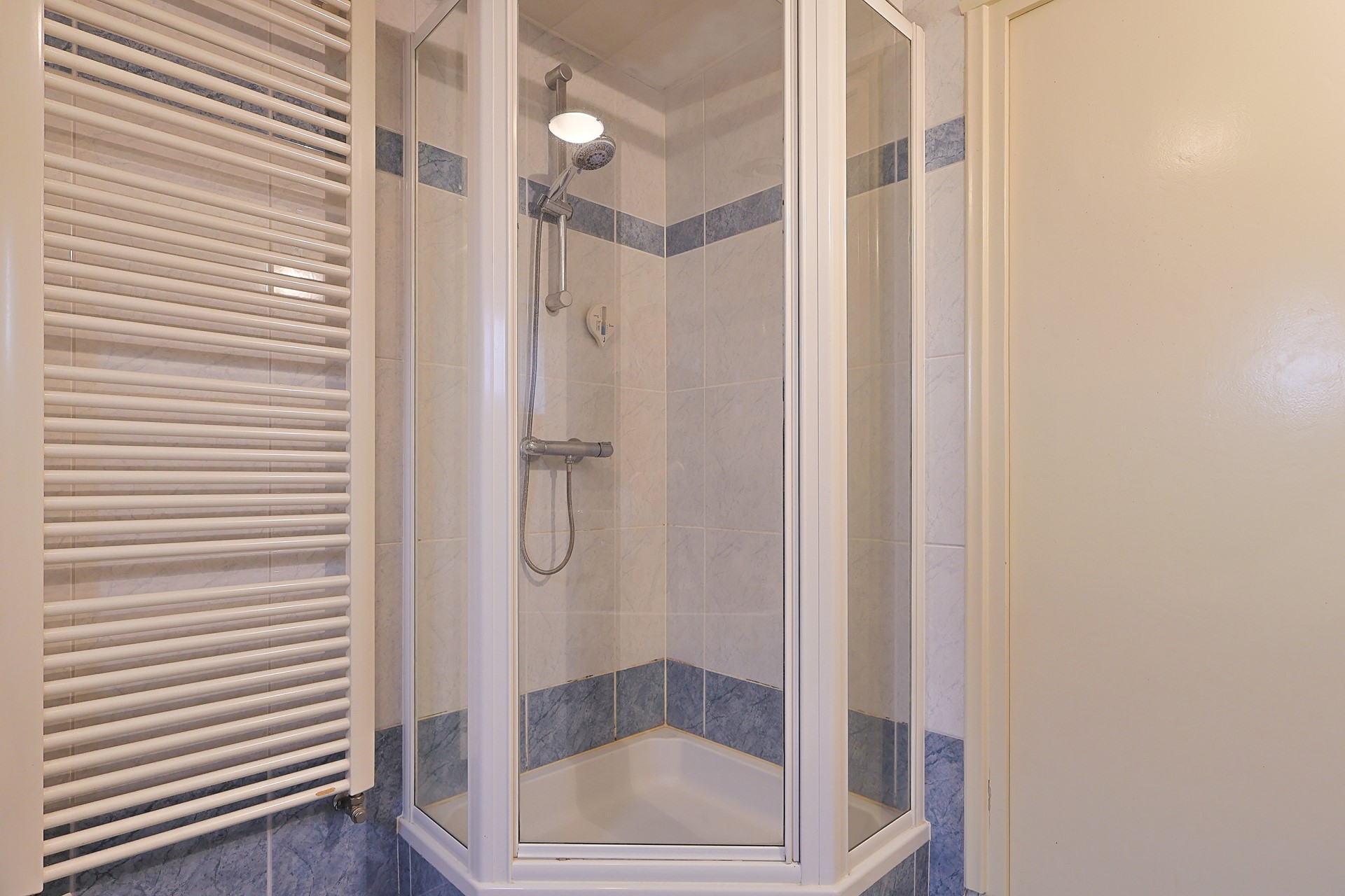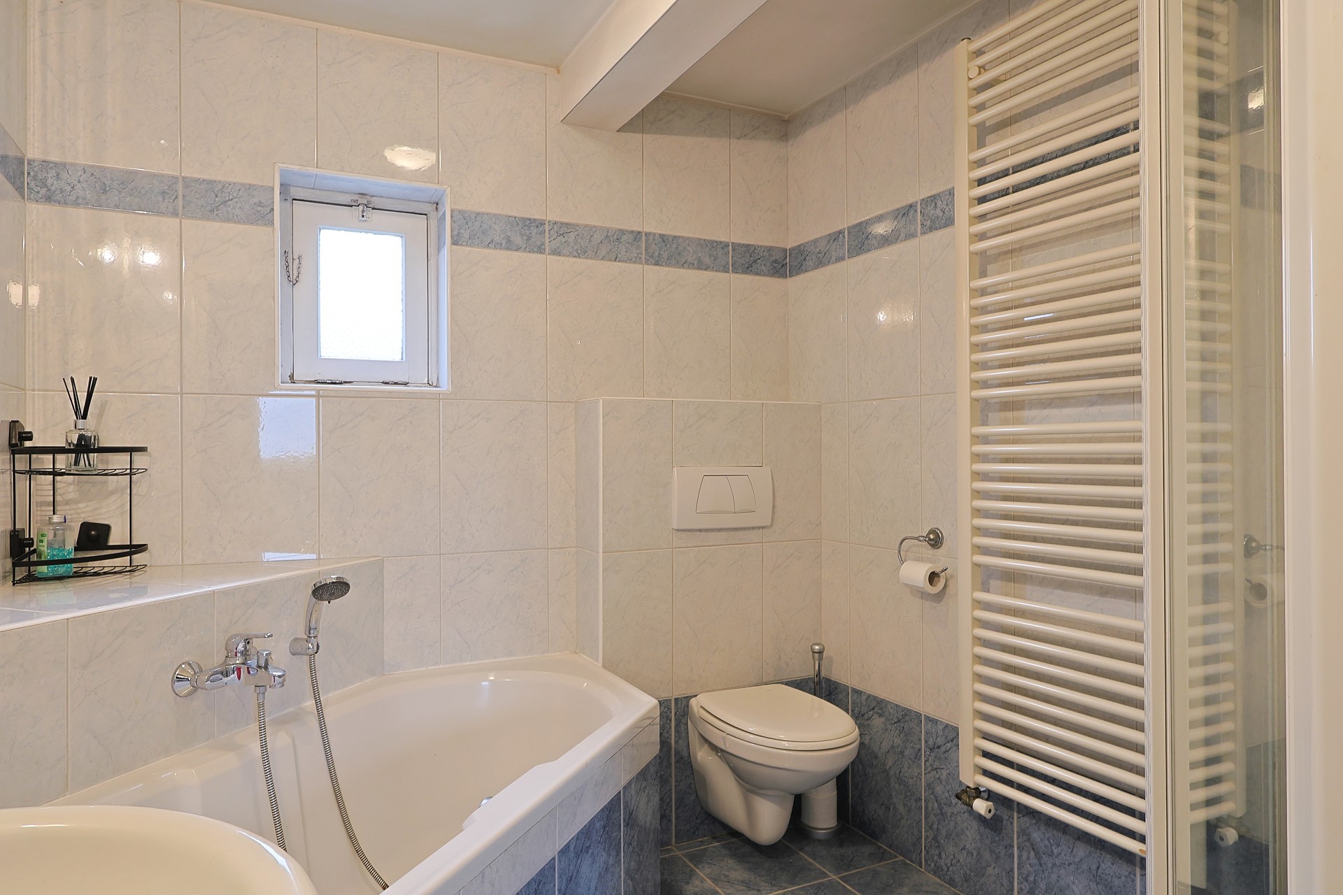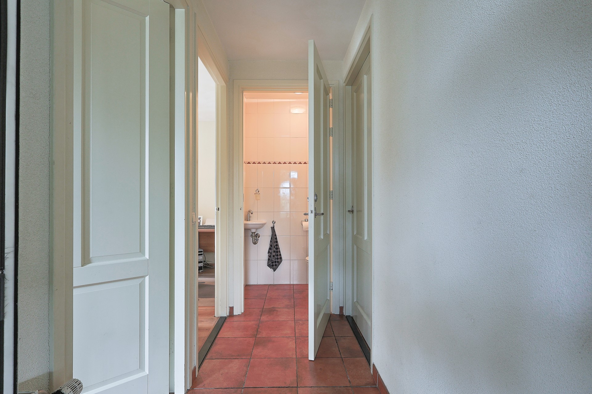 Overloop met toegang naar 4 slaapkamers en een ruime badkamer met wastafel. Hoekbad, hangcloset en douchecabine. Klein raam voor extra natuurlijke ventilatie. Diverse vaste kasten in de kamers, de ouderkamer heeft een airco.